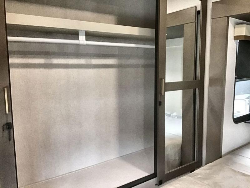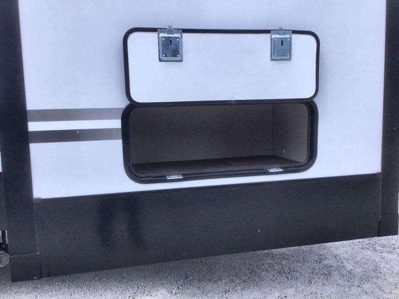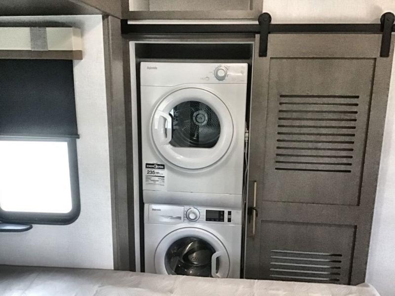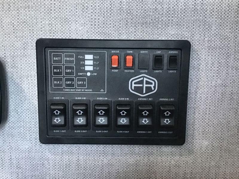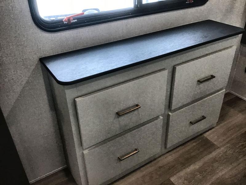 You'll always have a good time in this quad slide out fifth wheel! The front living area will be a favorite hang-out spot with its dual opposing queen bed hide-a-bed sofa slides, along with theater seating across from a 65" TV and fireplace. Your guests can transform this space into their bedroom at night, while you take the rear private bedroom with a king bed slide out, a dresser, and full-width wardrobe. A full bath will let you clean up every day, and the middle kitchen features ample counter space to prep meals. There is also a free-standing dinette where you can dine together, or you can take your plate outdoors to sit under the two power awnings!
