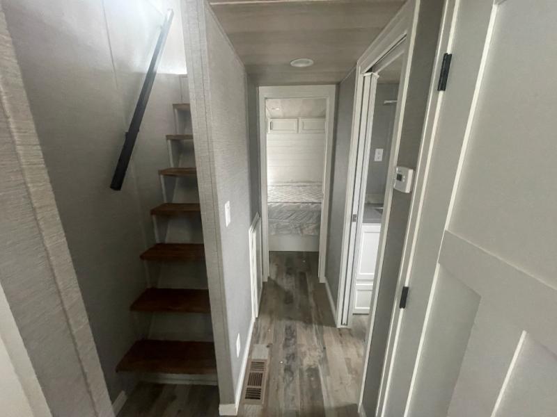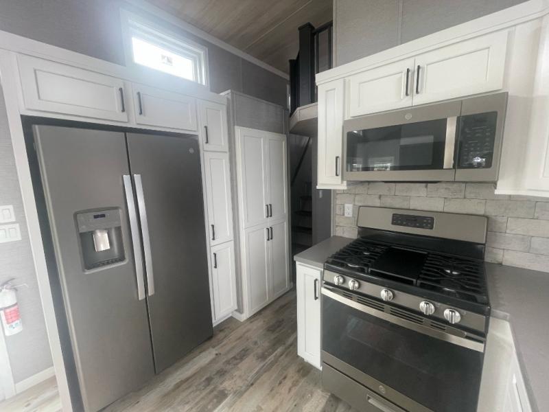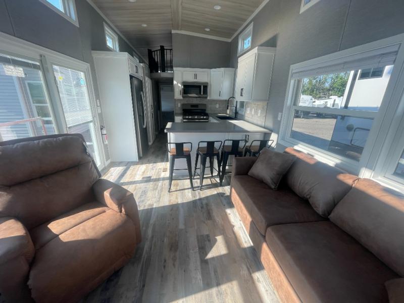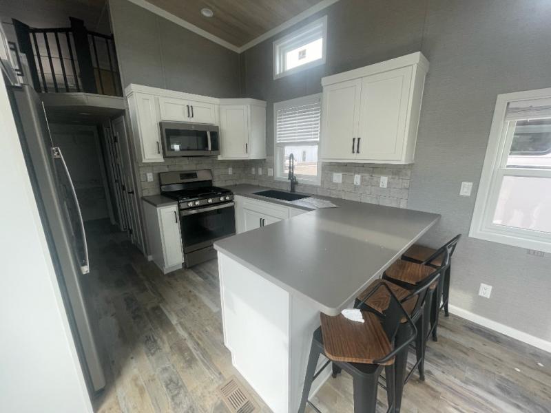 There's plenty of room in this Elevation park model! The loft offers additional space that can be used for sleeping as needed. There's also a standard hide-a-bed sofa as well as the private rear bedroom with a queen bed, so there is lots of room for you to invite guests to sleep over. You'll enjoy cooking in the kitchen with its GE appliances including an 18 cu. ft. refrigerator and 30" range, and you can serve meals at the breakfast bar. After dinner you can relax by the fireplace in the living area!.