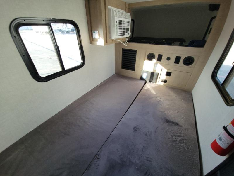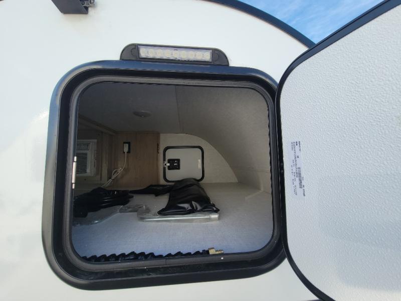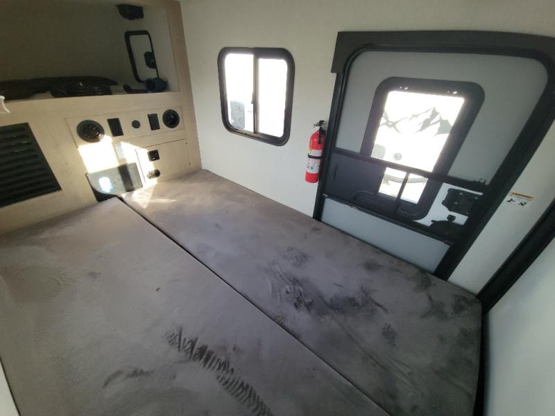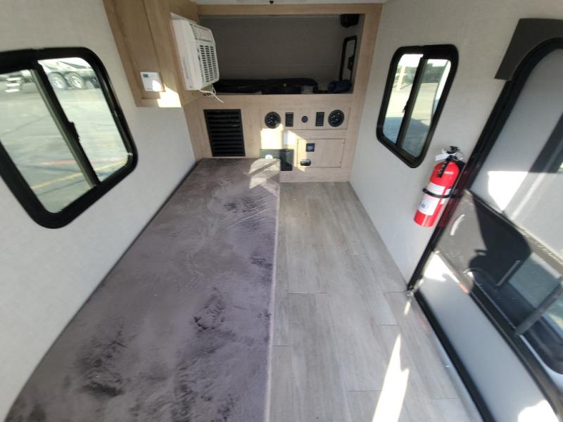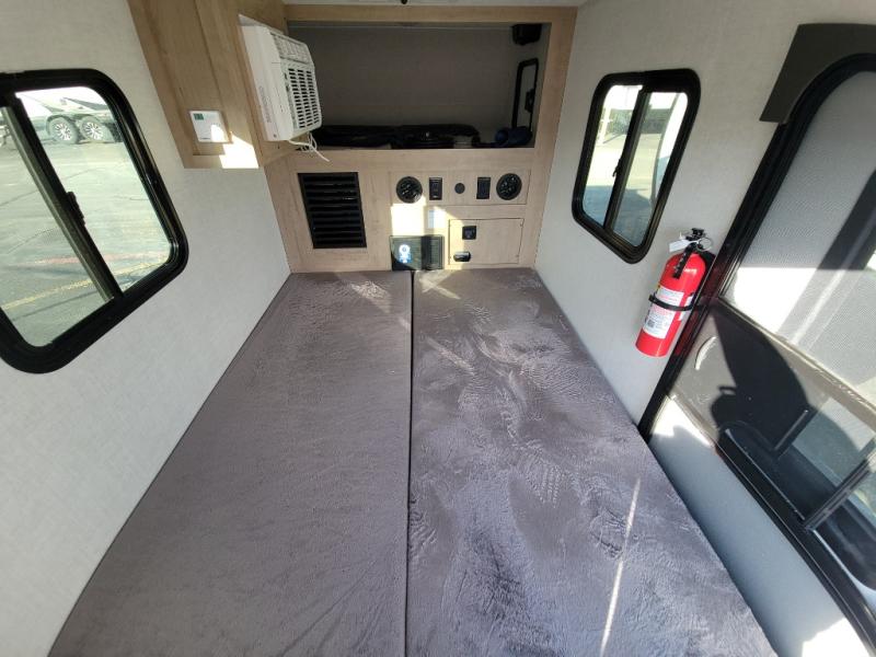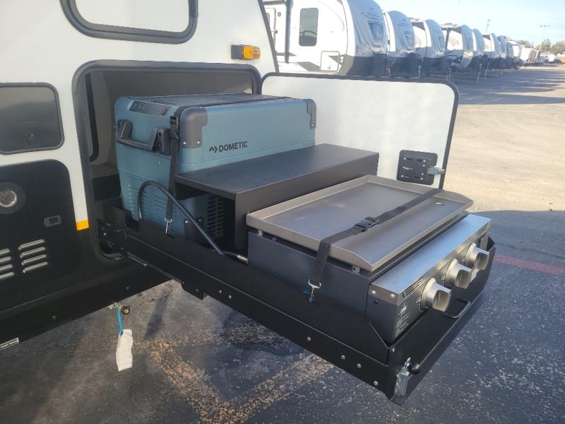 This lightweight travel trailer will get you out in nature quicker and easier than you think! Once you arrive at the campground, you can unload the dual exterior storage doors and your gear from the rear 2" accessory receiver. The front outdoor kitchen includes a slide out tray with a griddle plus an optional 12V cooler, allowing you to cook lunch before taking a hike. Inside, the dual mattresses convert to a 56" x 84" "California Queen" sleeping space, plus there are front overhead shelves with sleeping space for an additional guest or two little ones. There is also optional prep for utilities, including furnace, A/C, water heater and more!