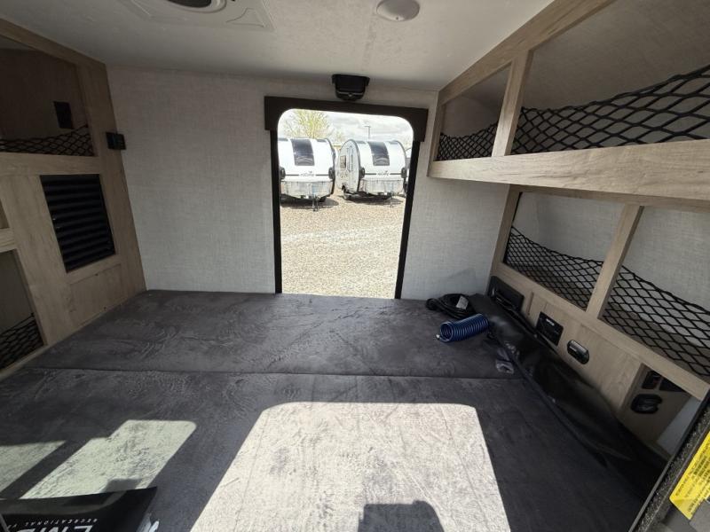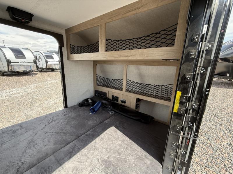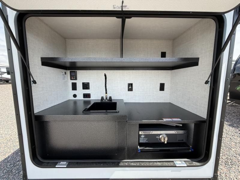 This compact travel trailer is easy to tow and easy to love! There are fender steps so that you can reach the top of your unit, which will especially be helpful if you choose to add the optional Thule roof rack system. You will also find a 6.5" manual awning outside or you can choose the optional batwing awning. The rear kitchen includes a griddle which attaches to the LP Quick Connect, a sink, plus an overhead shelf for food storage. An optional 1.7 cu. ft. refrigerator can be added for even more convenience. Inside, you'll enjoy the dual 28" x 84" mattresses with a converted 56" x 84" "California Queen" sleeping space for a great night's rest. There are also front overhead shelves with shelving below plus floor to ceiling shelves in the back so nothing gets left behind.