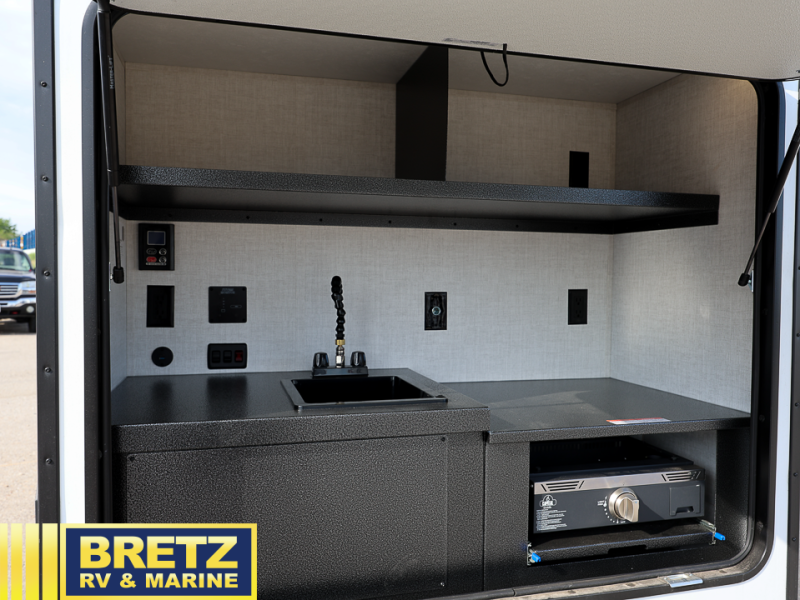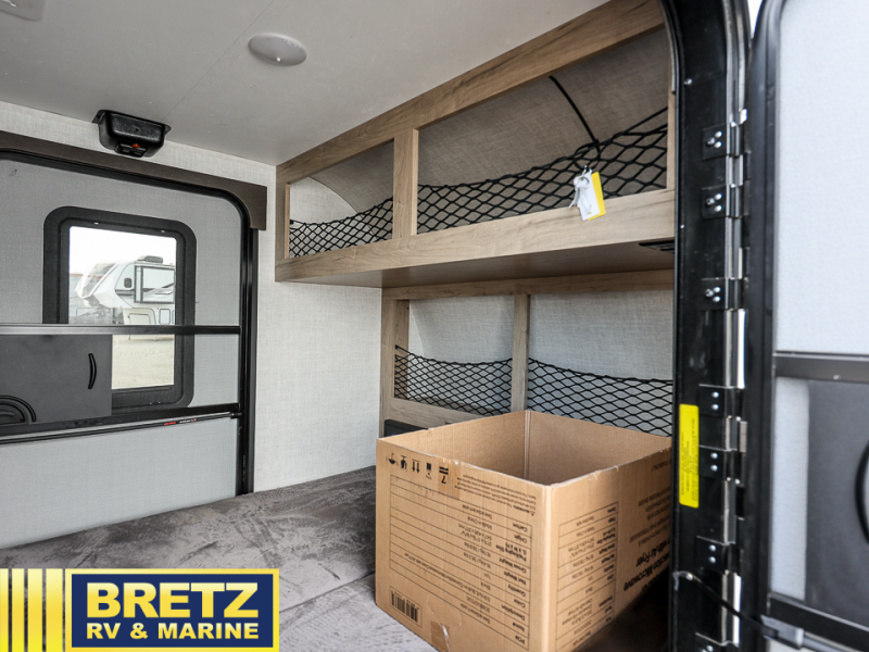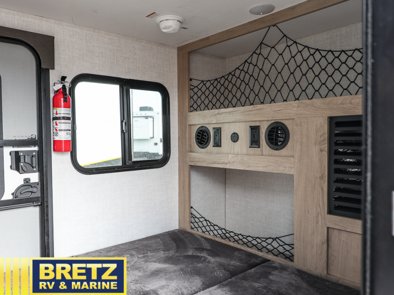 This compact travel trailer is easy to tow and easy to love! There are fender steps so that you can reach the top of your unit, which will especially be helpful if you choose to add the optional Thule roof rack system. You will also find a 6.5" manual awning outside or you can choose the optional batwing awning. The rear kitchen includes a griddle which attaches to the LP Quick Connect, a sink, plus an overhead shelf for food storage. An optional 1.7 cu. ft. refrigerator can be added for even more convenience. Inside, you'll enjoy the dual 28" x 84" mattresses with a converted 56" x 84" "California Queen" sleeping space for a great night's rest. There are also front overhead shelves with shelving below plus floor to ceiling shelves in the back so nothing gets left behind.