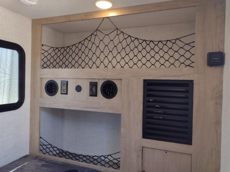 This compact travel trailer is easy to tow and easy to love! There are fender steps so that you can reach the top of your unit, which will especially be helpful if you choose to add the optional Thule roof rack system. You will also find a 6.5" manual awning outside or you can choose the optional batwing awning. The rear kitchen includes a griddle which attaches to the LP Quick Connect, a sink, plus an overhead shelf for food storage. An optional 1.7 cu. ft. refrigerator can be added for even more convenience. Inside, you'll enjoy the dual 28" x 84" mattresses with a converted 56" x 84" "California Queen" sleeping space for a great night's rest. There are also front overhead shelves with shelving below plus floor to ceiling shelves in the back so nothing gets left behind.