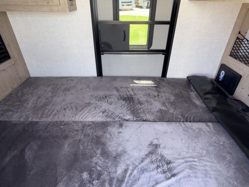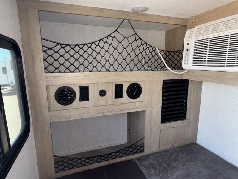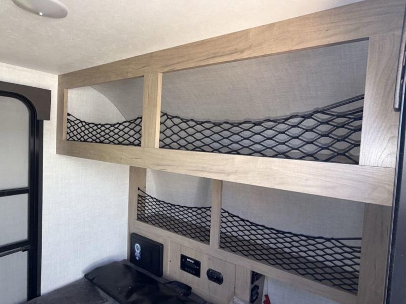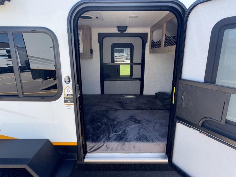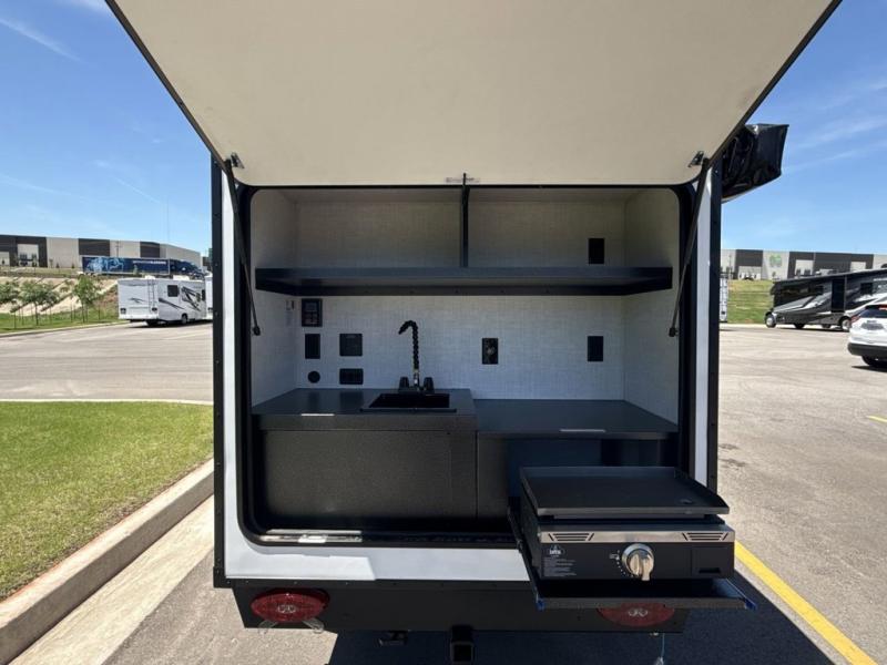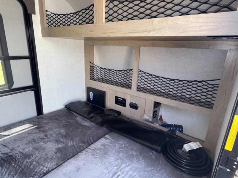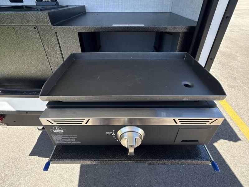 This compact travel trailer is easy to tow and easy to love! There are fender steps so that you can reach the top of your unit, which will especially be helpful if you choose to add the optional Thule roof rack system. You will also find a 6.5" manual awning outside or you can choose the optional batwing awning. The rear kitchen includes a griddle which attaches to the LP Quick Connect, a sink, plus an overhead shelf for food storage. An optional 1.7 cu. ft. refrigerator can be added for even more convenience. Inside, you'll enjoy the dual 28" x 84" mattresses with a converted 56" x 84" "California Queen" sleeping space for a great night's rest. There are also front overhead shelves with shelving below plus floor to ceiling shelves in the back so nothing gets left behind.