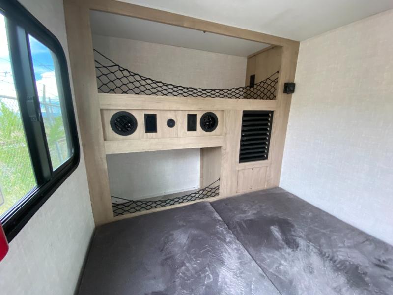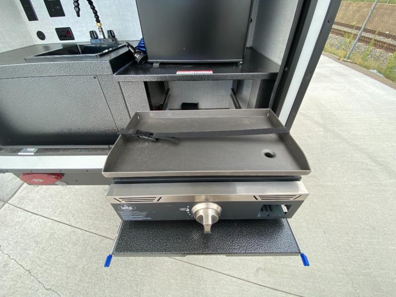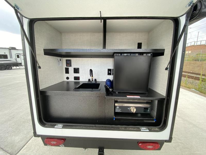 This compact travel trailer is easy to tow and easy to love! There are fender steps so that you can reach the top of your unit, which will especially be helpful if you choose to add the optional Thule roof rack system. You will also find a 6.5" manual awning outside or you can choose the optional batwing awning. The rear kitchen includes a griddle which attaches to the LP Quick Connect, a sink, plus an overhead shelf for food storage. An optional 1.7 cu. ft. refrigerator can be added for even more convenience. Inside, you'll enjoy the dual 28" x 84" mattresses with a converted 56" x 84" "California Queen" sleeping space for a great night's rest. There are also front overhead shelves with shelving below plus floor to ceiling shelves in the back so nothing gets left behind.