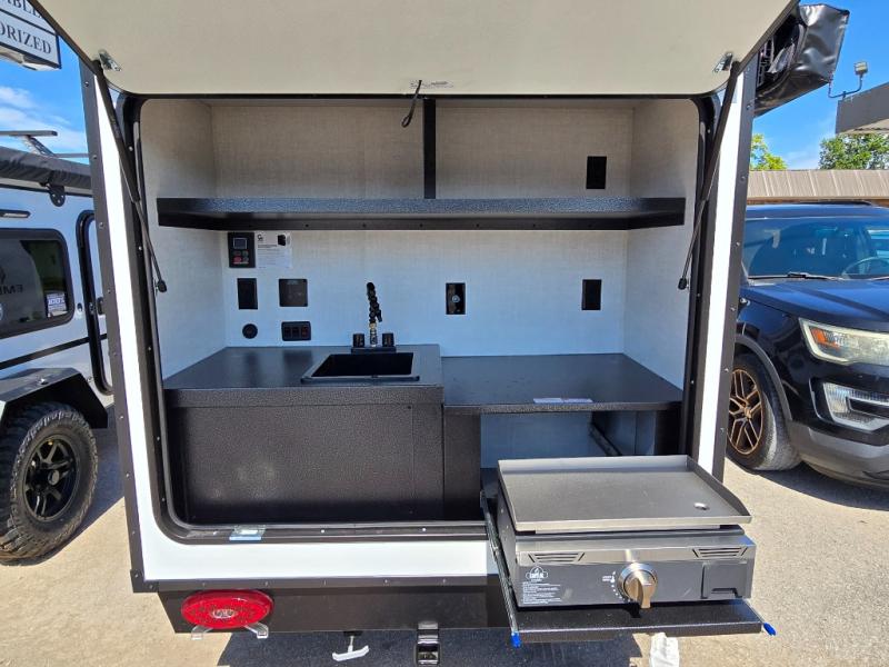 This compact travel trailer is easy to tow and easy to love! There are fender steps so that you can reach the top of your unit, which will especially be helpful if you choose to add the optional Thule roof rack system. You will also find a 6.5" manual awning outside or you can choose the optional batwing awning. The rear kitchen includes a griddle which attaches to the LP Quick Connect, a sink, plus an overhead shelf for food storage. An optional 1.7 cu. ft. refrigerator can be added for even more convenience. Inside, you'll enjoy the dual 28" x 84" mattresses with a converted 56" x 84" "California Queen" sleeping space for a great night's rest. There are also front overhead shelves with shelving below plus floor to ceiling shelves in the back so nothing gets left behind.