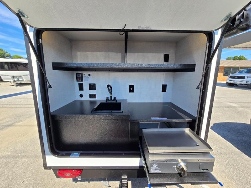 This compact travel trailer is easy to tow and easy to love! There are fender steps so that you can reach the top of your unit, which will especially be helpful if you choose to add the optional Thule roof rack system. You will also find a 6.5" manual awning outside or you can choose the optional batwing awning. The rear kitchen includes a griddle which attaches to the LP Quick Connect, a sink, plus an overhead shelf for food storage. An optional 1.7 cu. ft. refrigerator can be added for even more convenience. Inside, you'll enjoy the dual 28" x 84" mattresses with a converted 56" x 84" "California Queen" sleeping space for a great night's rest. There are also front overhead shelves with shelving below plus floor to ceiling shelves in the back so nothing gets left behind.