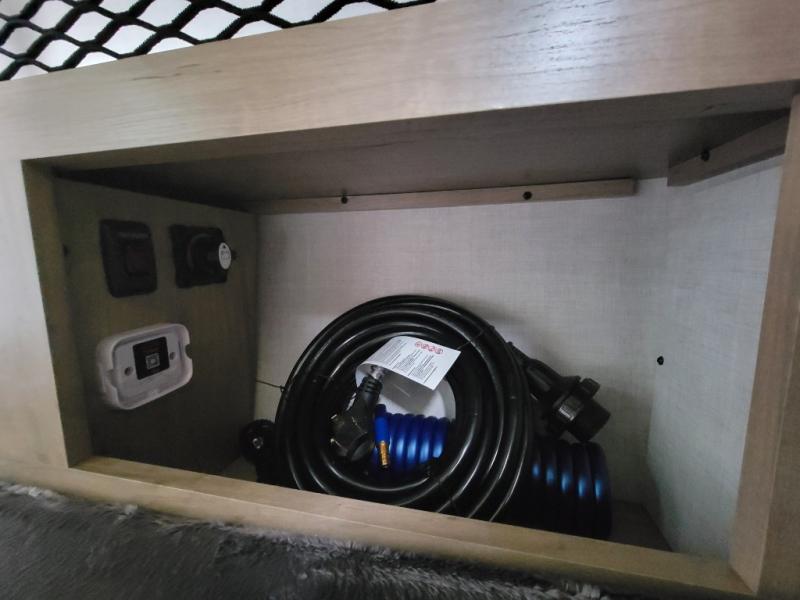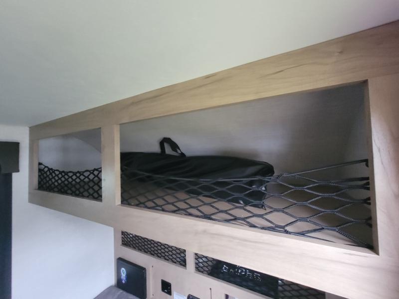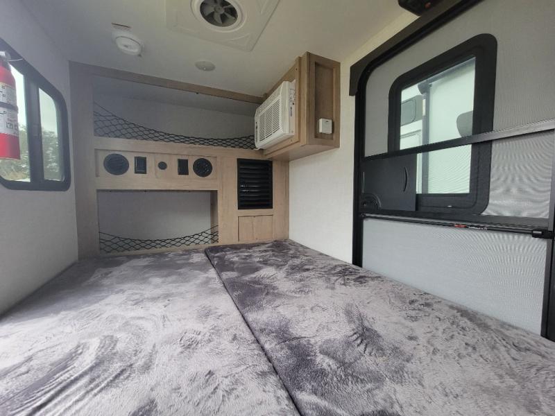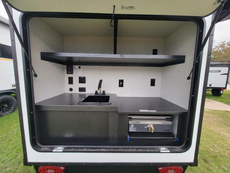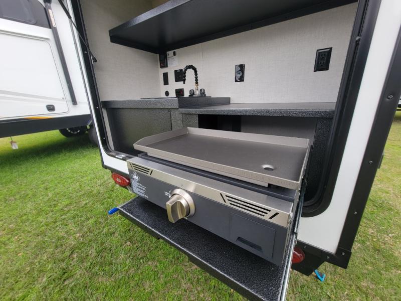 This compact travel trailer is easy to tow and easy to love! There are fender steps so that you can reach the top of your unit, which will especially be helpful if you choose to add the optional Thule roof rack system. You will also find a 6.5" manual awning outside or you can choose the optional batwing awning. The rear kitchen includes a griddle which attaches to the LP Quick Connect, a sink, plus an overhead shelf for food storage. An optional 1.7 cu. ft. refrigerator can be added for even more convenience. Inside, you'll enjoy the dual 28" x 84" mattresses with a converted 56" x 84" "California Queen" sleeping space for a great night's rest. There are also front overhead shelves with shelving below plus floor to ceiling shelves in the back so nothing gets left behind.