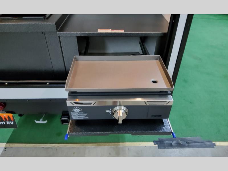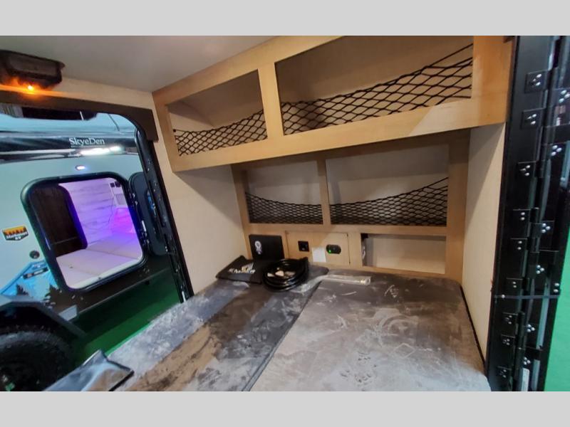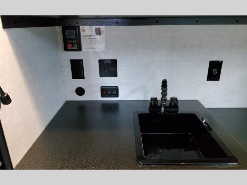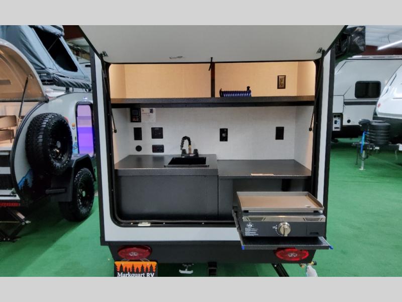 This compact travel trailer is easy to tow and easy to love! There are fender steps so that you can reach the top of your unit, which will especially be helpful if you choose to add the optional Thule roof rack system. You will also find a 6.5" manual awning outside or you can choose the optional batwing awning. The rear kitchen includes a griddle which attaches to the LP Quick Connect, a sink, plus an overhead shelf for food storage. An optional 1.7 cu. ft. refrigerator can be added for even more convenience. Inside, you'll enjoy the dual 28" x 84" mattresses with a converted 56" x 84" "California Queen" sleeping space for a great night's rest. There are also front overhead shelves with shelving below plus floor to ceiling shelves in the back so nothing gets left behind.