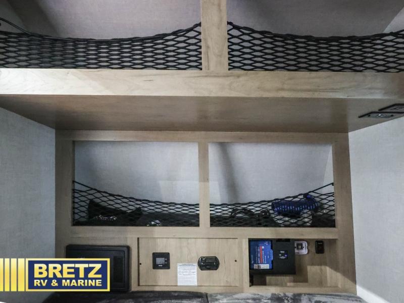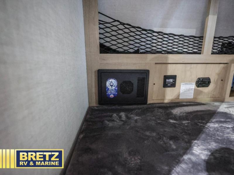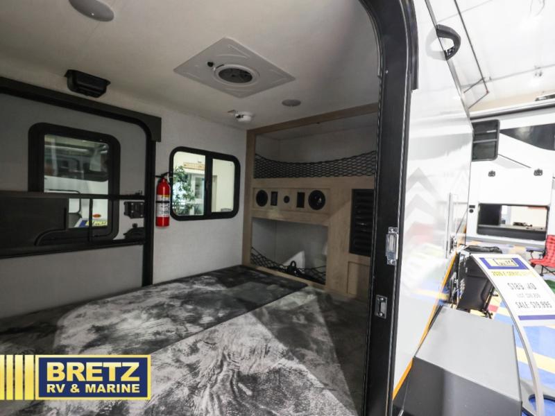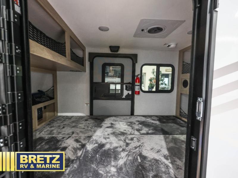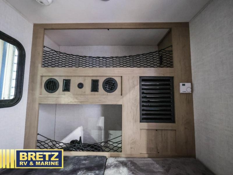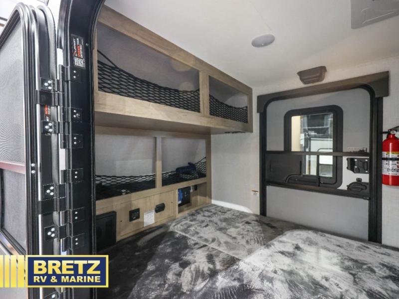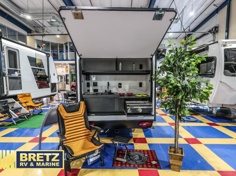 This compact travel trailer is easy to tow and easy to love! There are fender steps so that you can reach the top of your unit, which will especially be helpful if you choose to add the optional Thule roof rack system. The rear kitchen includes a griddle which attaches to the LP Quick Connect, a sink, plus an overhead shelf for food storage. An optional 1.7 cu. ft. refrigerator can be added for even more convenience. Inside, you'll enjoy the dual 28" x 84" mattresses with a converted 56" x 84" "California Queen" sleeping space for a great night's rest. There are also front overhead shelves with shelving below plus floor to ceiling shelves in the back, so nothing gets left behind.