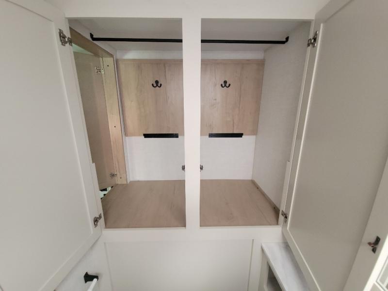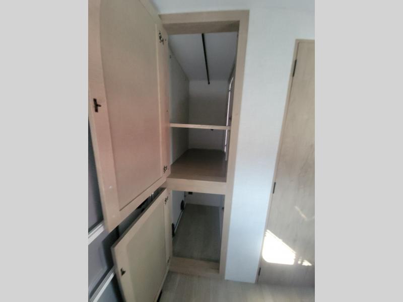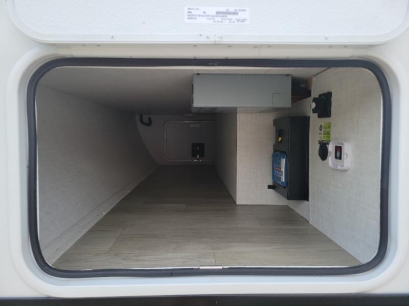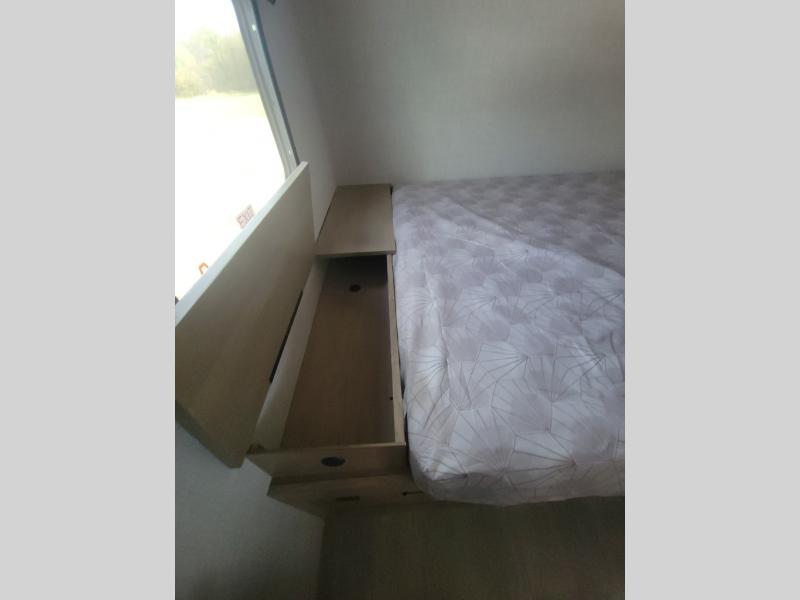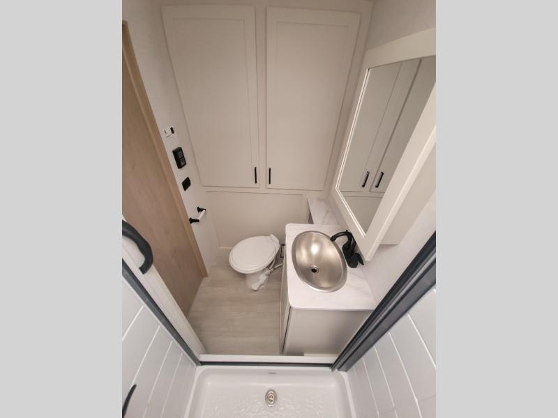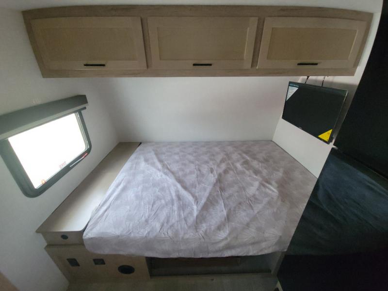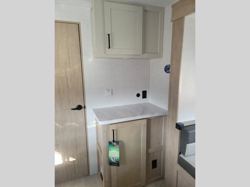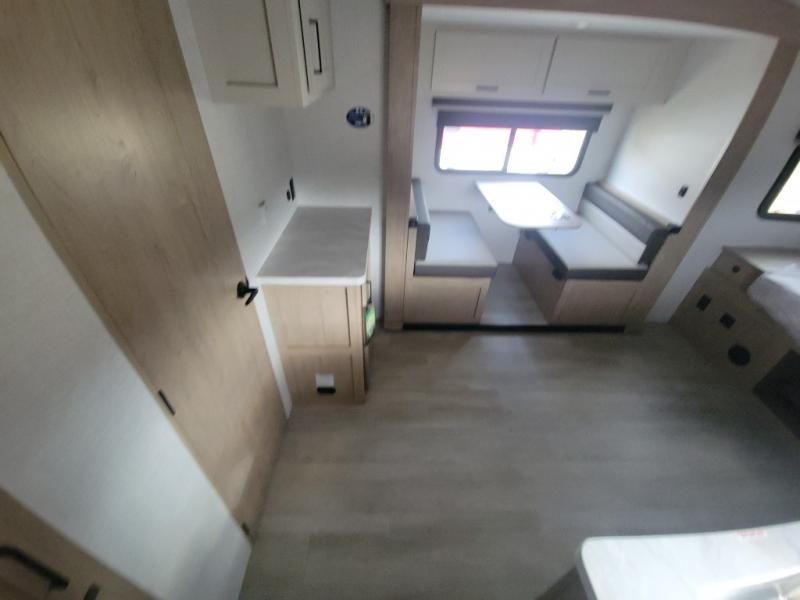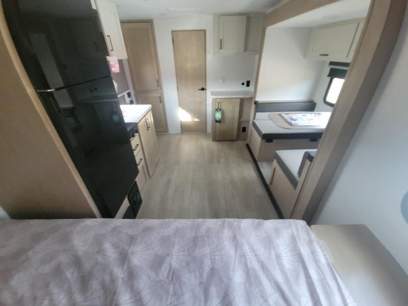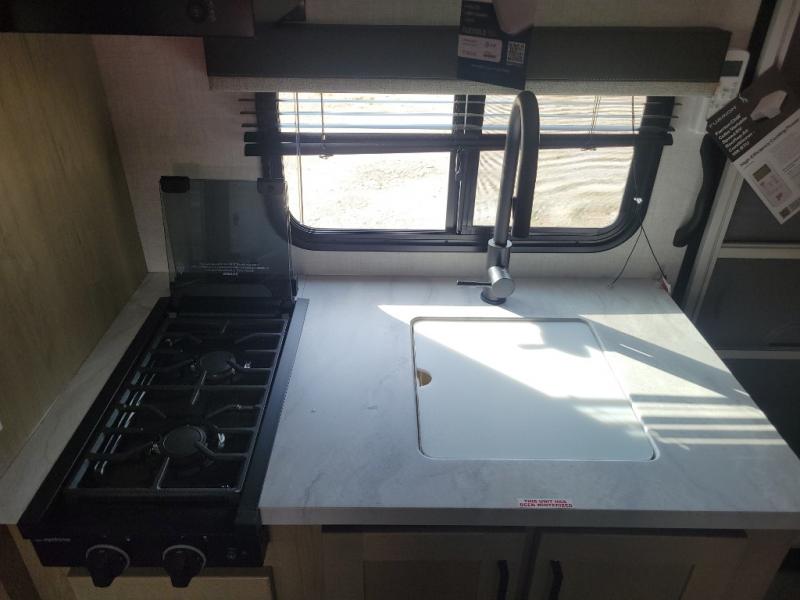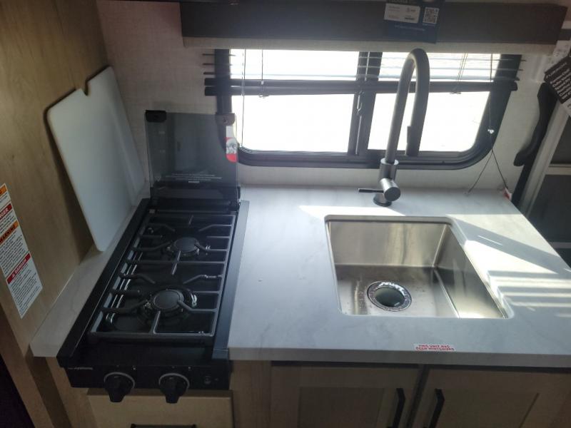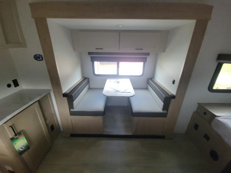 Time at the campground in this travel trailer will be time well spent. Once you arrive at your destination, you can put out the 14' electric awning, unpack the pass-through storage, then head inside for lunch. There is an air fryer convection microwave plus a dual burner cooktop to make meals each day, and the 10 cu. ft. 12V refrigerator will keep your food fresh. A legless dinette slide provides a place to dine together and even let a guest sleep over. If you're not needing the extra sleeping space, just choose the optional theater seating! You'll find the front queen bed will give you a great night's rest, and there is a full rear bath on board that will allow you to freshen up each morning.