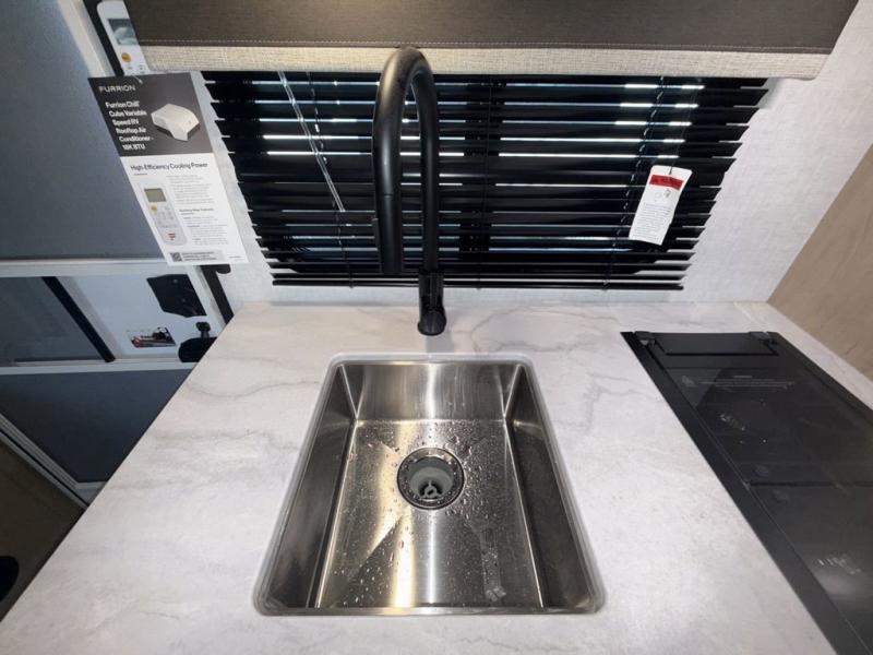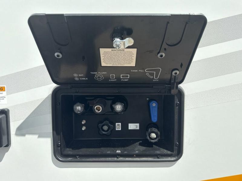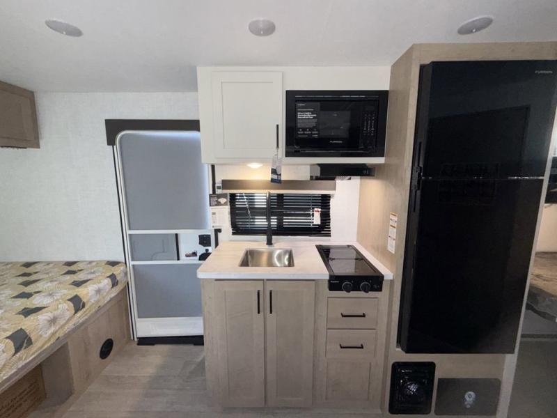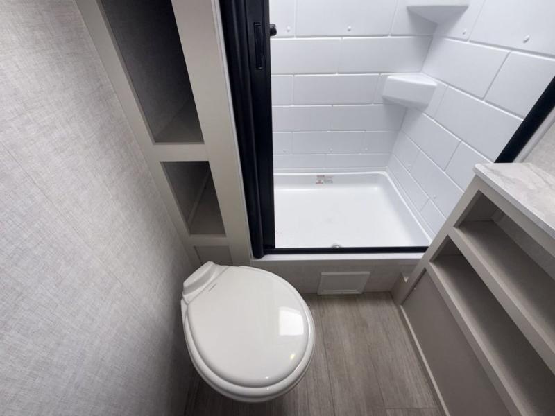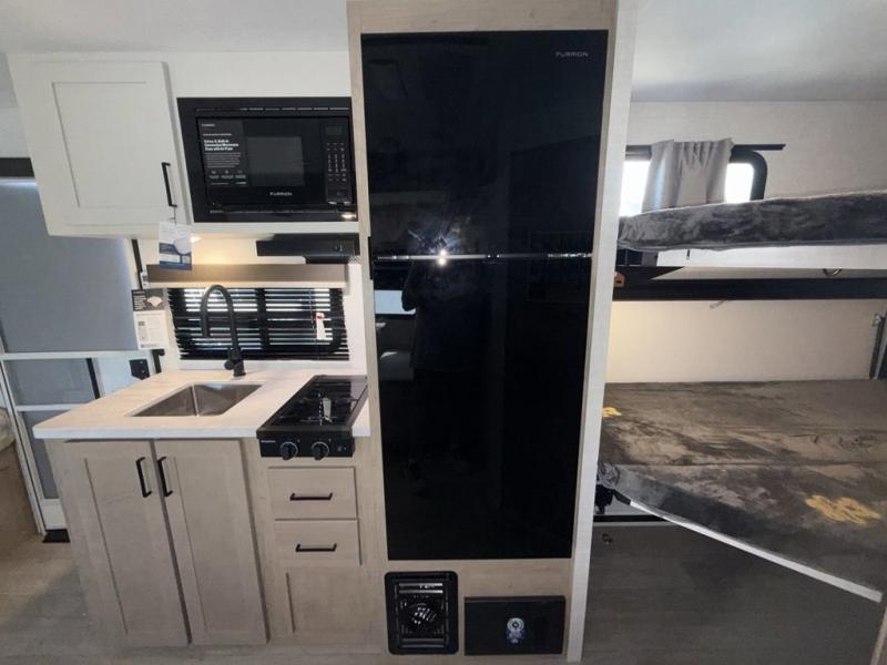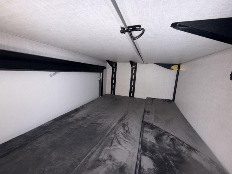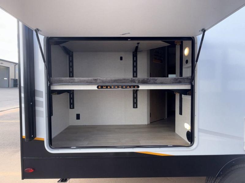 Time at the campground in this travel trailer will be time well spent. Once you arrive at your destination, you can put out the 16' electric awning, unpack the pass-through storage, then head inside for lunch. There is an air fryer convection microwave plus a dual burner cooktop to make meals each day, and the 10 cu. ft. 12V refrigerator will keep your food fresh. A legless dinette slide provides a place to dine together and even let a guest sleep over. If you're not needing the extra sleeping space, just choose the optional theater seating! You'll find the front queen bed will give you a great night's rest, and there is a full bath on board that will allow you to freshen up each morning. This unit includes the patent-pending repositionable EmberTrack E-Track bunk/storage system that allows for multiple single/double bunk configurations, depending on your needs.