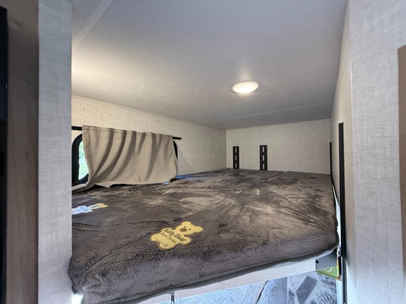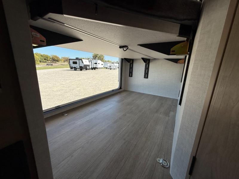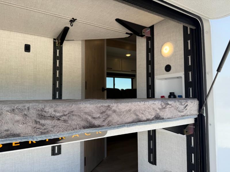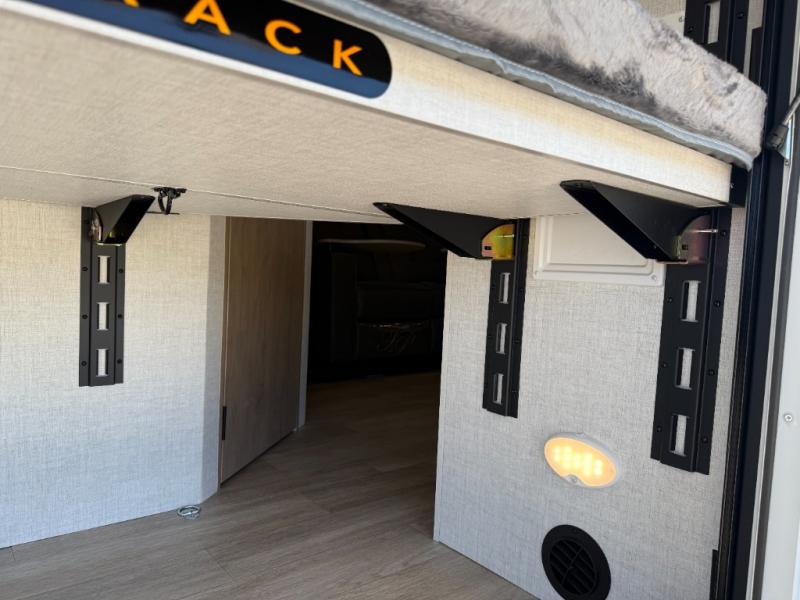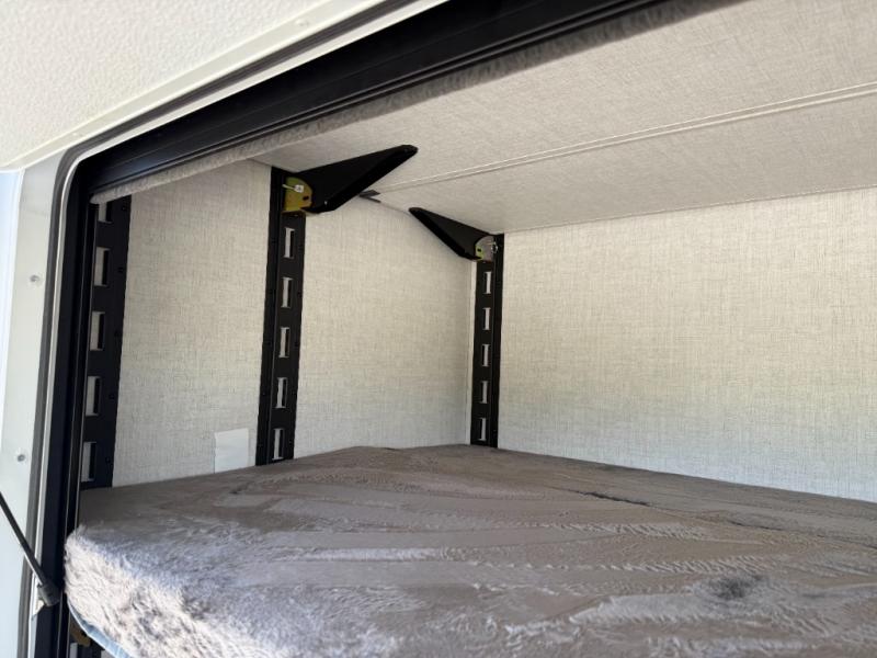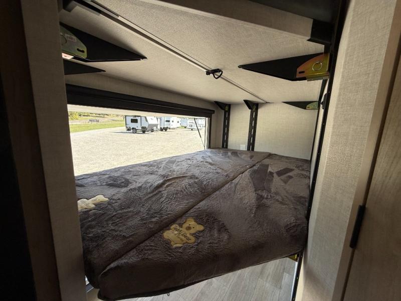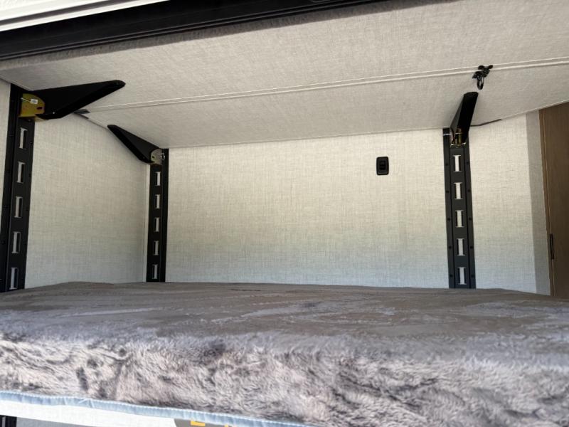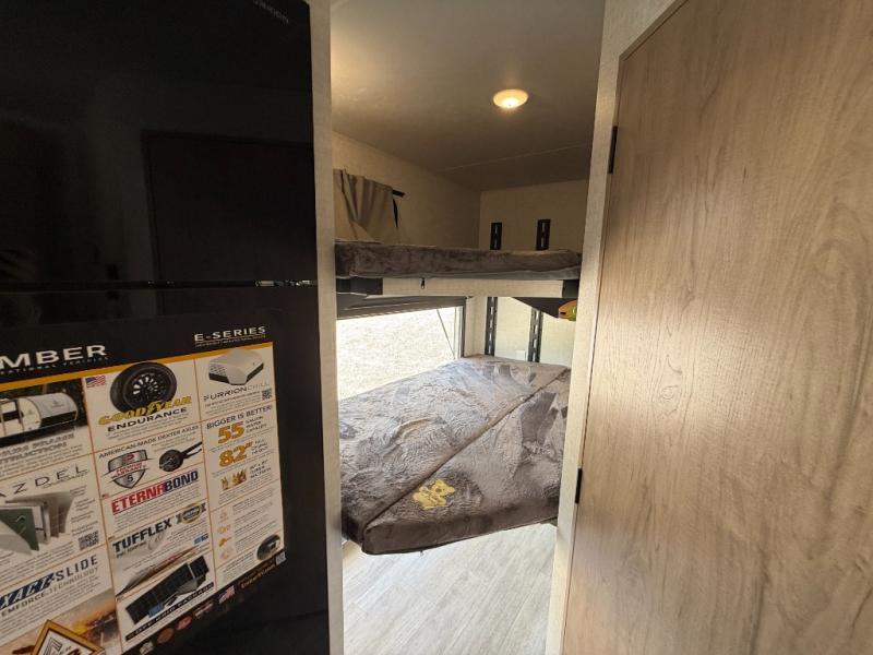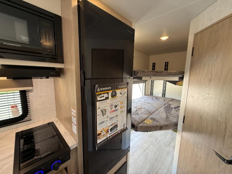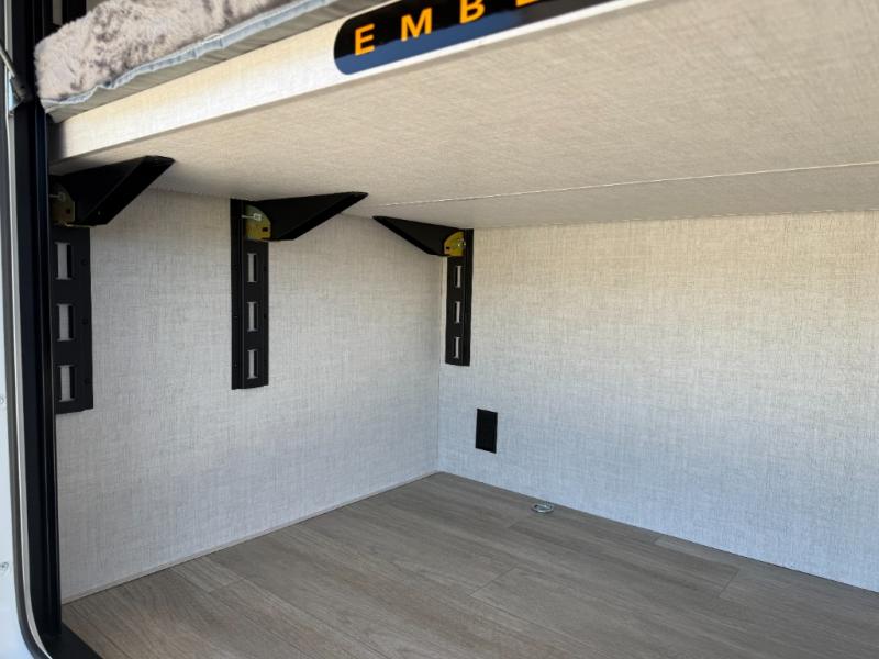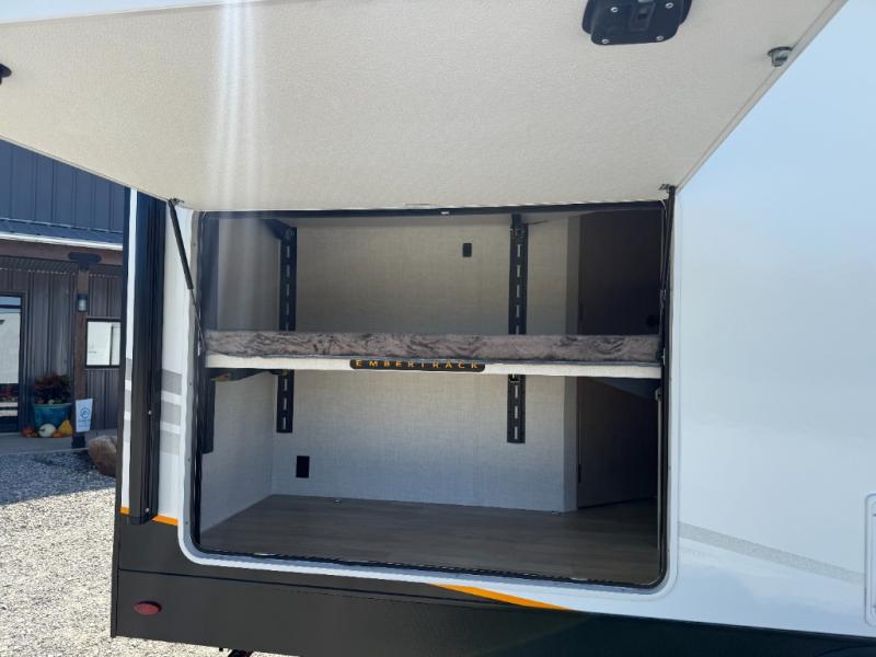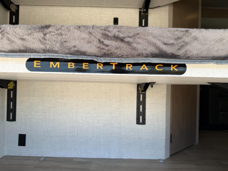 Time at the campground in this travel trailer will be time well spent. Once you arrive at your destination, you can put out the 16' electric awning, unpack the pass-through storage, then head inside for lunch. There is an air fryer convection microwave plus a dual burner cooktop to make meals each day, and the 10 cu. ft. 12V refrigerator will keep your food fresh. A legless dinette slide provides a place to dine together and even let a guest sleep over. If you're not needing the extra sleeping space, just choose the optional theater seating! You'll find the front queen bed will give you a great night's rest, and there is a full bath on board that will allow you to freshen up each morning. This unit includes the patent-pending repositionable EmberTrack E-Track bunk/storage system that allows for multiple single/double bunk configurations, depending on your needs.