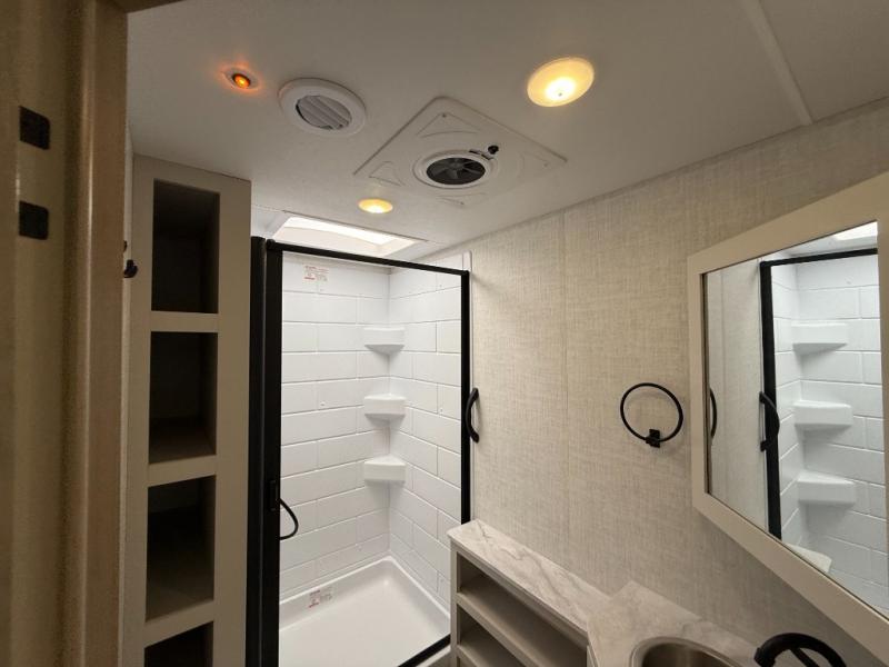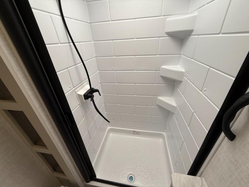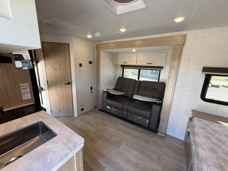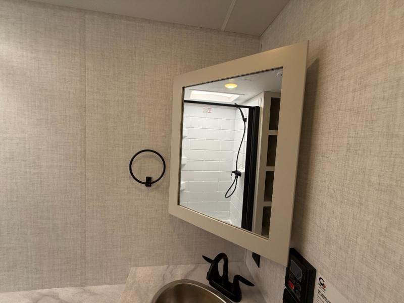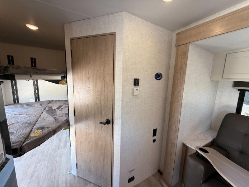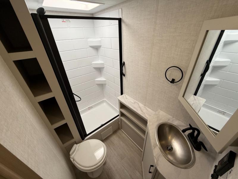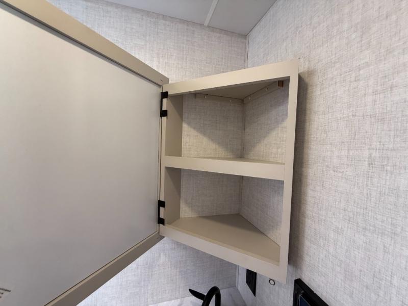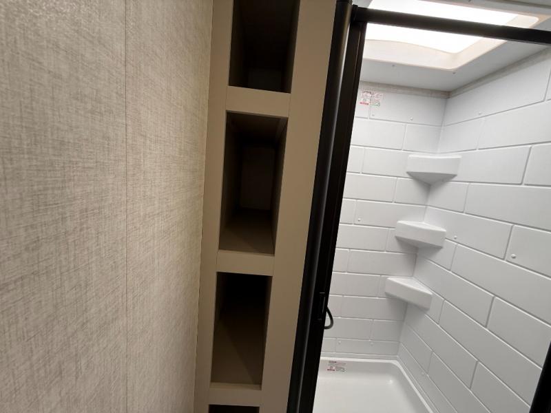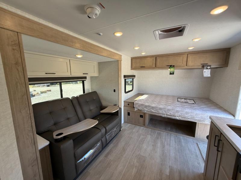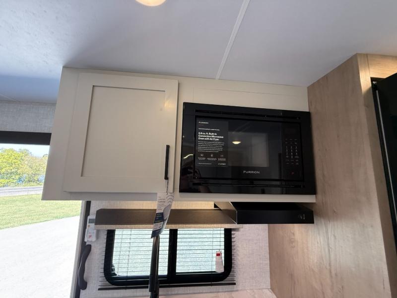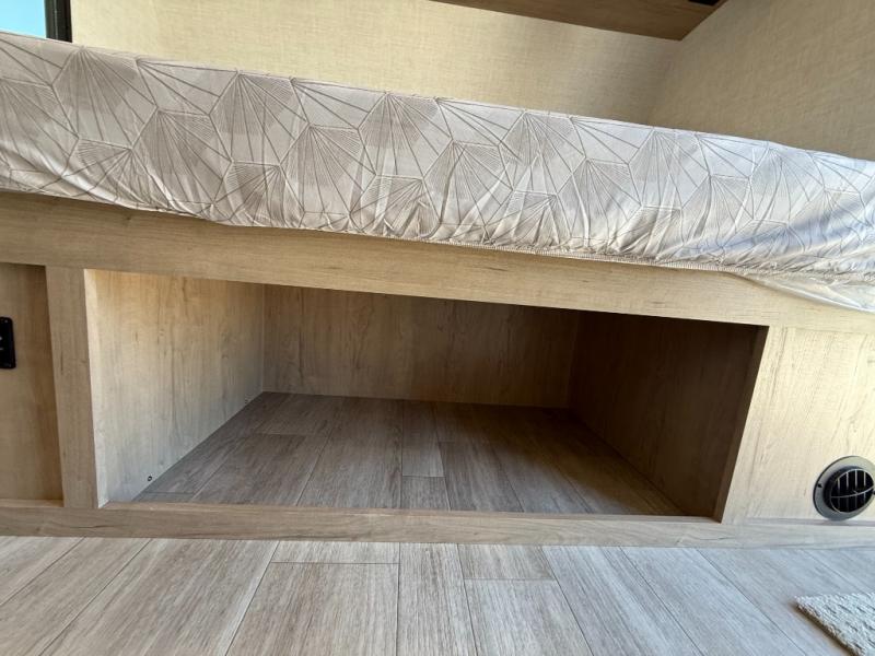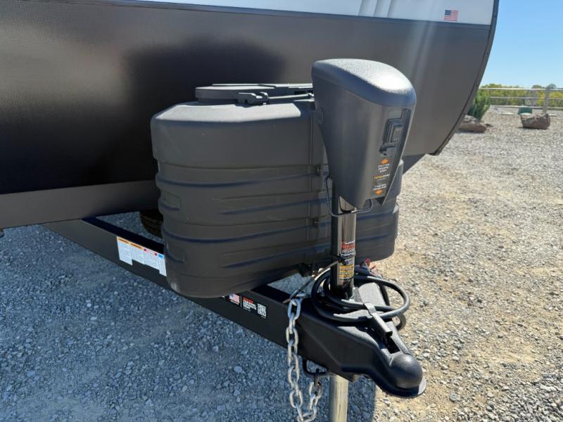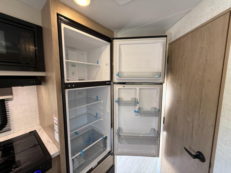 Time at the campground in this travel trailer will be time well spent. Once you arrive at your destination, you can put out the 16' electric awning, unpack the pass-through storage, then head inside for lunch. There is an air fryer convection microwave plus a dual burner cooktop to make meals each day, and the 10 cu. ft. 12V refrigerator will keep your food fresh. A legless dinette slide provides a place to dine together and even let a guest sleep over. If you're not needing the extra sleeping space, just choose the optional theater seating! You'll find the front queen bed will give you a great night's rest, and there is a full bath on board that will allow you to freshen up each morning. This unit includes the patent-pending repositionable EmberTrack E-Track bunk/storage system that allows for multiple single/double bunk configurations, depending on your needs.