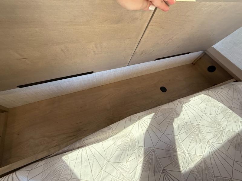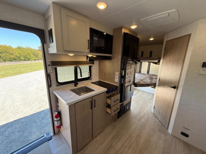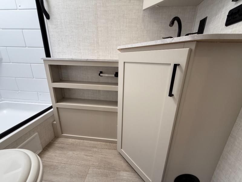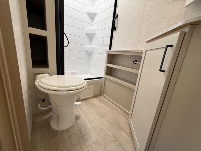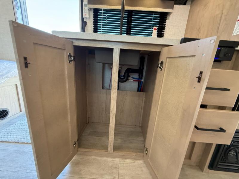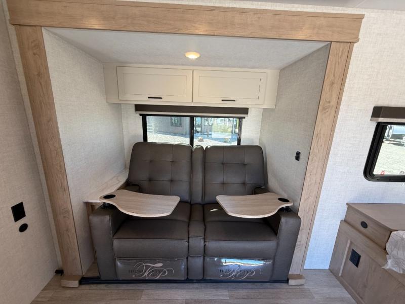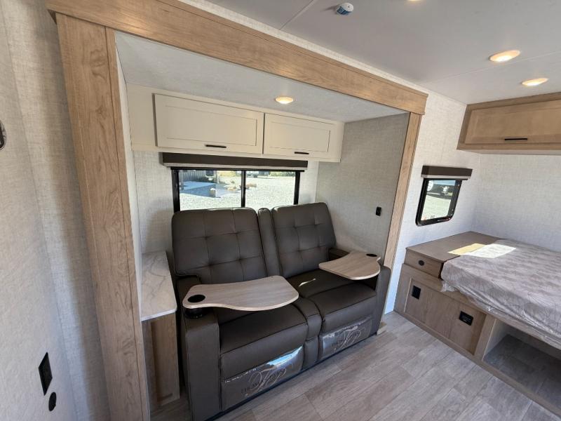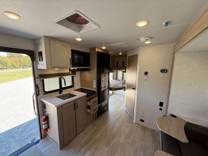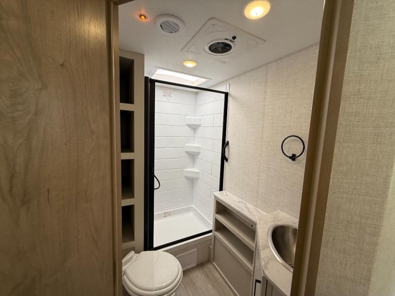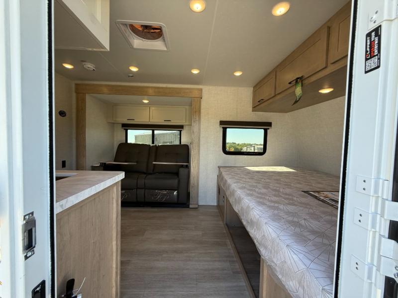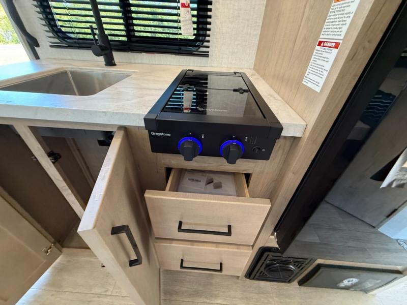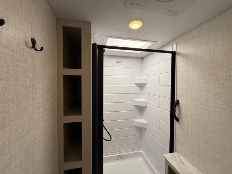 Time at the campground in this travel trailer will be time well spent. Once you arrive at your destination, you can put out the 16' electric awning, unpack the pass-through storage, then head inside for lunch. There is an air fryer convection microwave plus a dual burner cooktop to make meals each day, and the 10 cu. ft. 12V refrigerator will keep your food fresh. A legless dinette slide provides a place to dine together and even let a guest sleep over. If you're not needing the extra sleeping space, just choose the optional theater seating! You'll find the front queen bed will give you a great night's rest, and there is a full bath on board that will allow you to freshen up each morning. This unit includes the patent-pending repositionable EmberTrack E-Track bunk/storage system that allows for multiple single/double bunk configurations, depending on your needs.