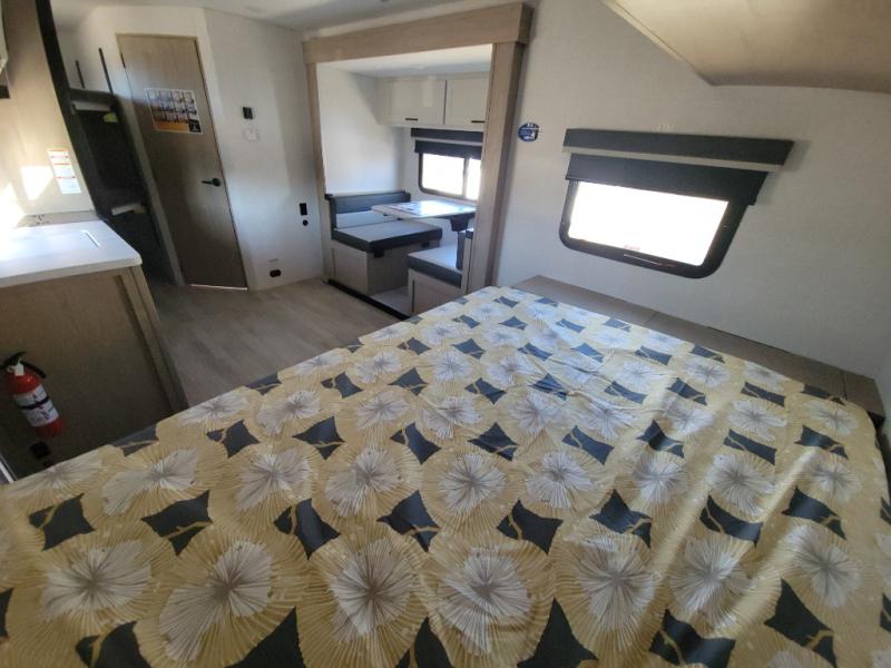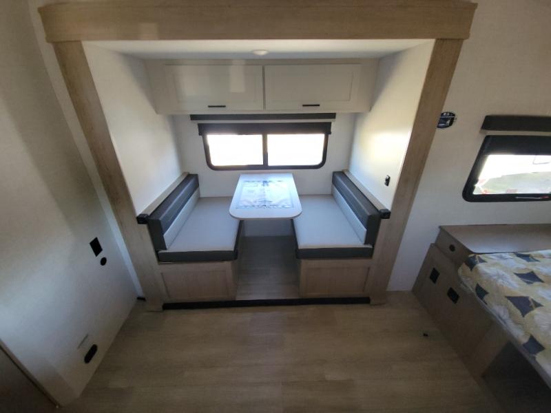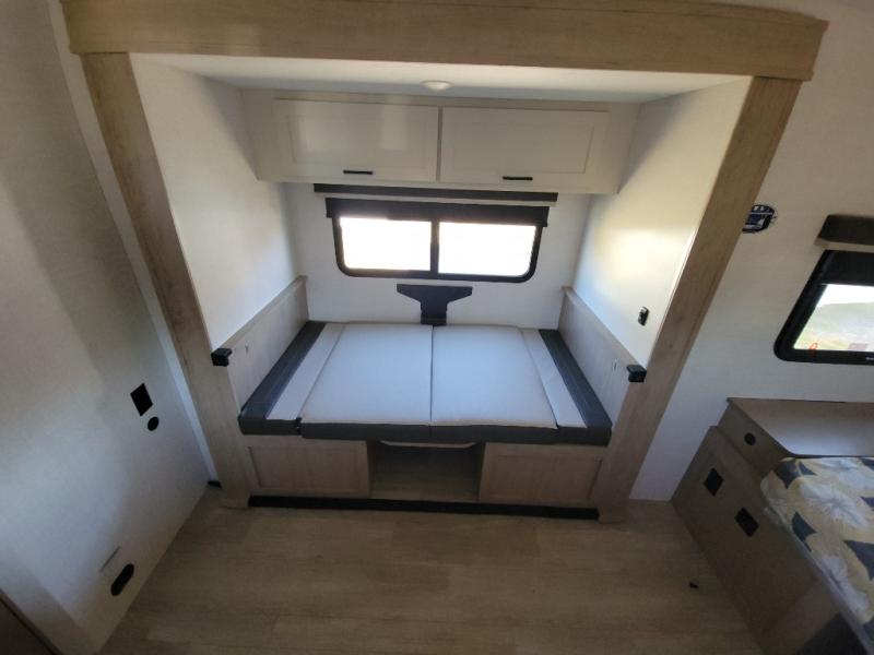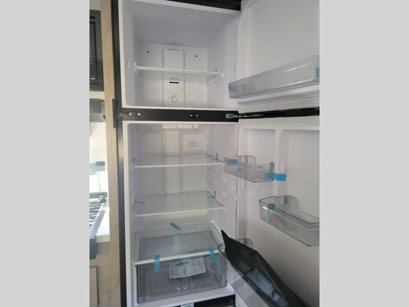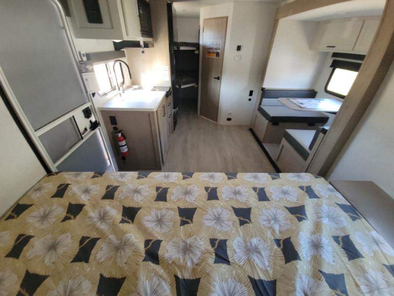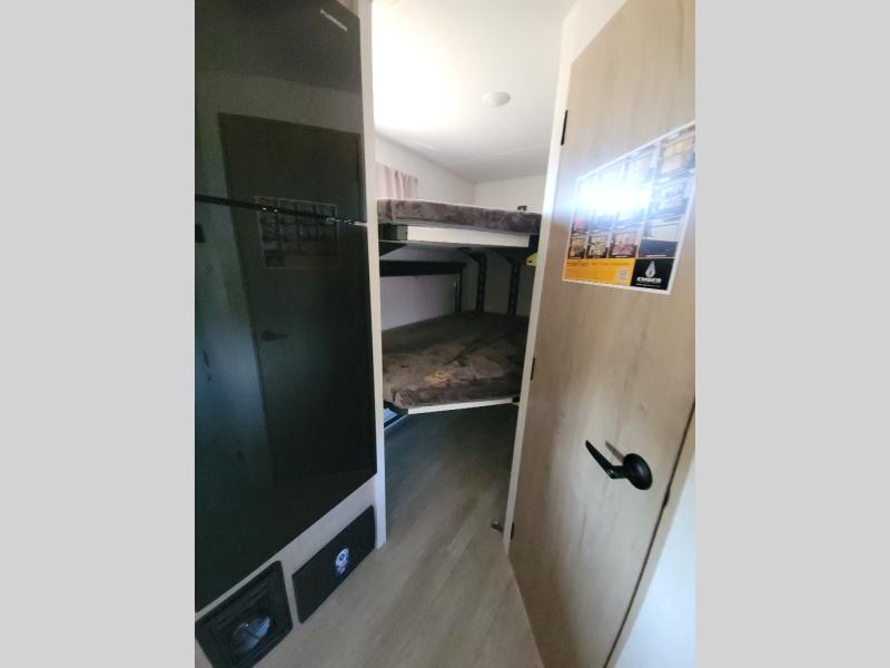 Time at the campground in this travel trailer will be time well spent. Once you arrive at your destination, you can put out the 16' electric awning, unpack the pass-through storage, then head inside for lunch. There is an air fryer convection microwave plus a dual burner cooktop to make meals each day, and the 10 cu. ft. 12V refrigerator will keep your food fresh. A legless dinette slide provides a place to dine together and even let a guest sleep over. If you're not needing the extra sleeping space, just choose the optional theater seating! You'll find the front queen bed will give you a great night's rest, and there is a full bath on board that will allow you to freshen up each morning. This unit includes the patent-pending repositionable EmberTrack E-Track bunk/storage system that allows for multiple single/double bunk configurations, depending on your needs.