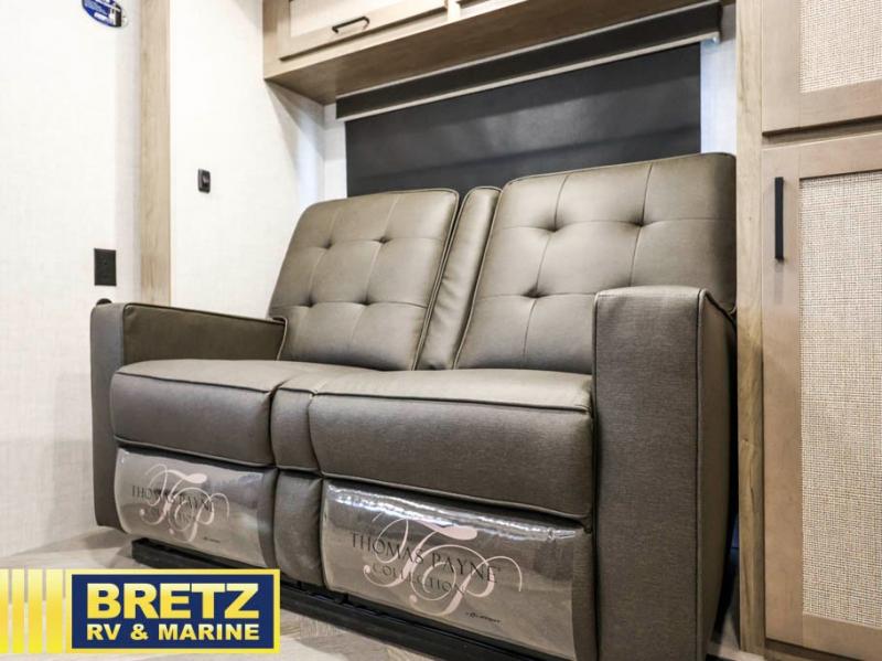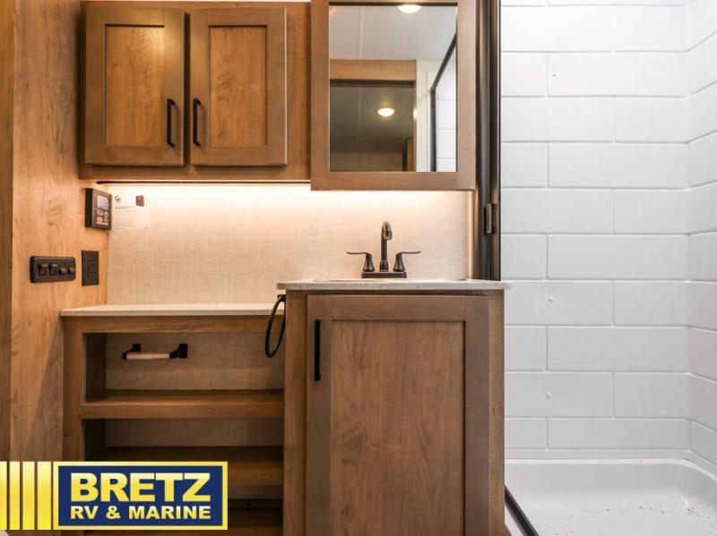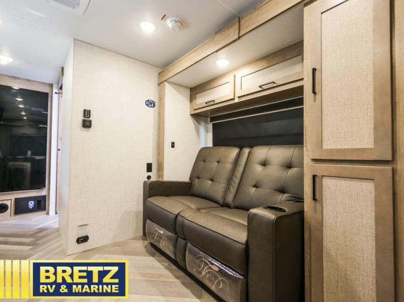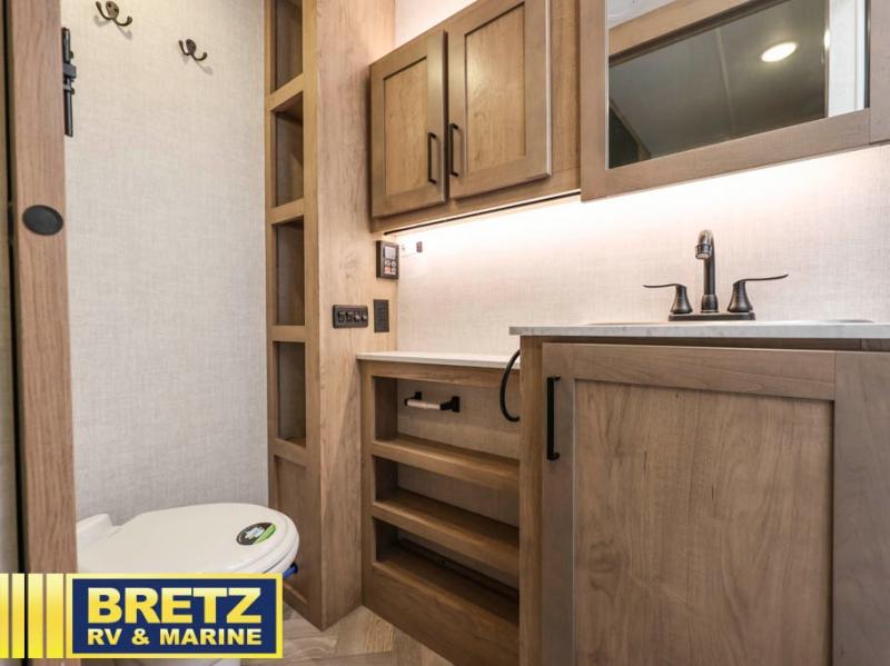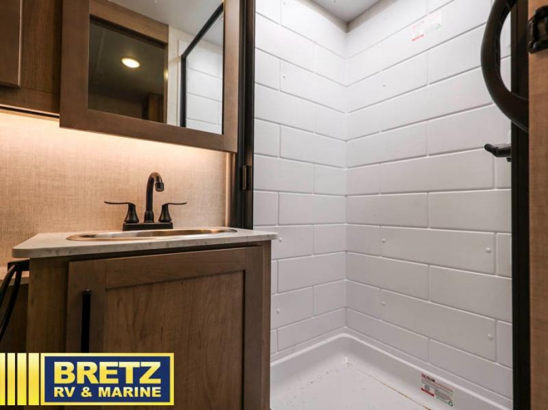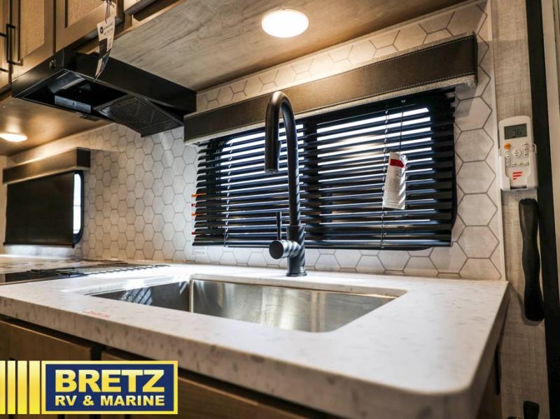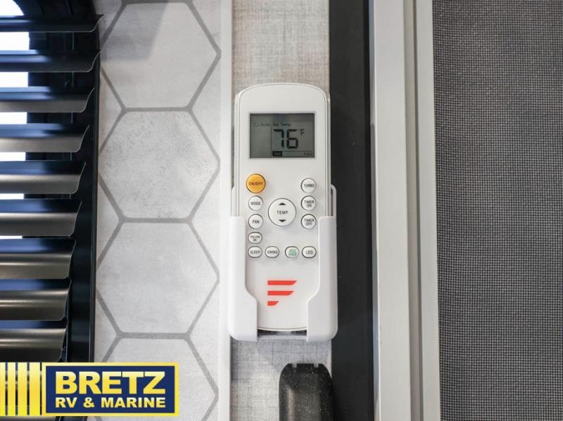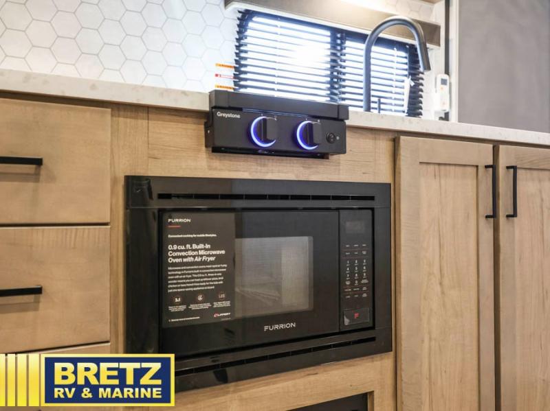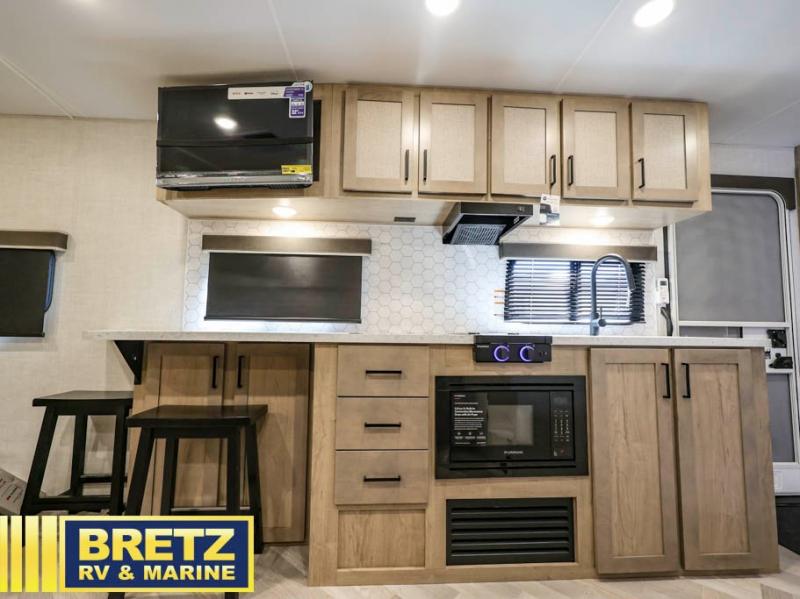 Camping trips just got sweeter in this single slide out travel trailer that will sleep two each night! There is a front queen bed with dual wardrobes and nightstands to keep your things tidy, plus a privacy curtain at the foot of the bed if you have someone staying over on an air mattress. You can relax on the theater seating slide out that also includes a wardrobe/pantry here for snacks or paper products. The kitchen with a dual burner cooktop and air fryer convection microwave will let you make meals each day, and the 10 cu. ft. 12V refrigerator will be perfect for your perishables. This unit also includes a breakfast bar/desktop area with two bar stools where you can dine or work from home. And of course there is a full bath on board so you can clean up after a day outdoors!