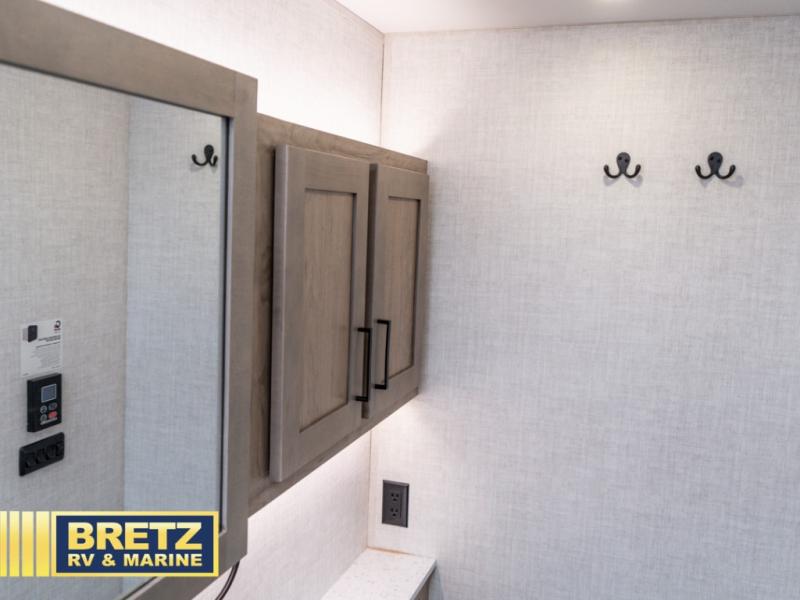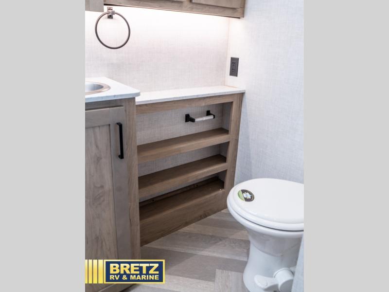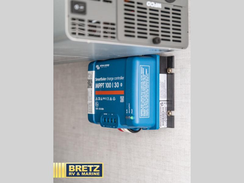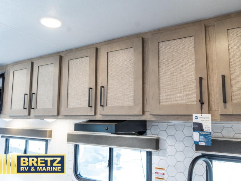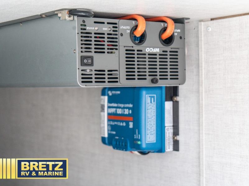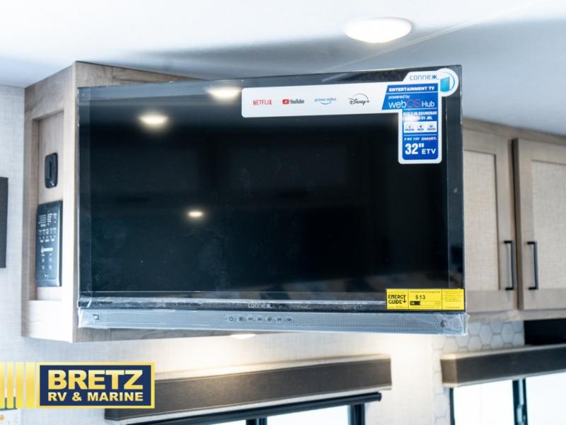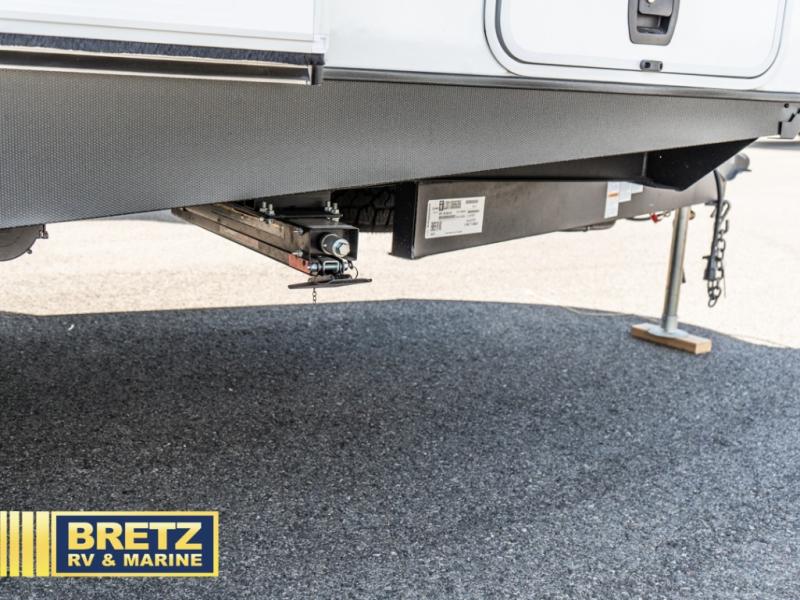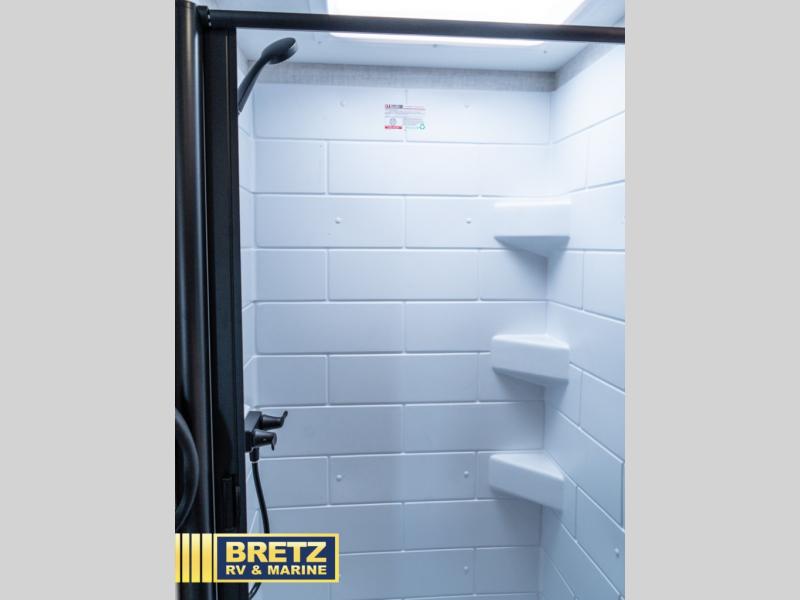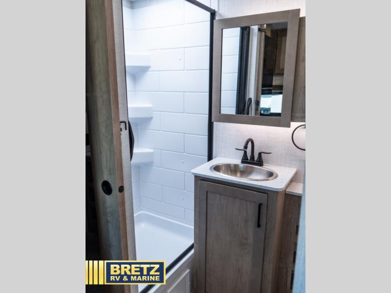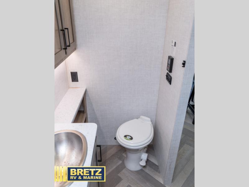 Camping trips just got sweeter in this single slide out travel trailer that will sleep two each night! There is a front queen bed with dual wardrobes and nightstands to keep your things tidy, plus a privacy curtain at the foot of the bed if you have someone staying over on an air mattress. You can relax on the theater seating slide out that also includes a wardrobe/pantry here for snacks or paper products. The kitchen with a dual burner cooktop and air fryer convection microwave will let you make meals each day, and the 10 cu. ft. 12V refrigerator will be perfect for your perishables. This unit also includes a breakfast bar/desktop area with two bar stools where you can dine or work from home. And of course there is a full bath on board so you can clean up after a day outdoors!