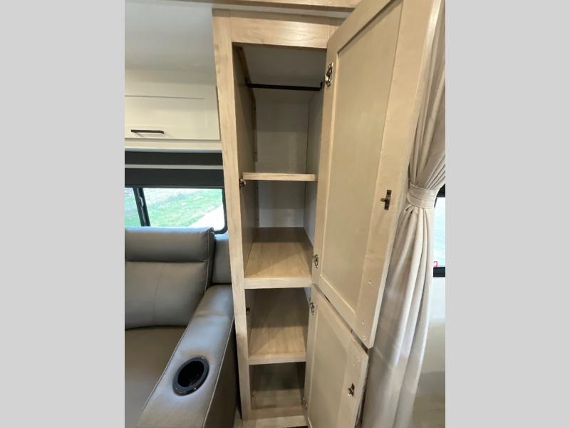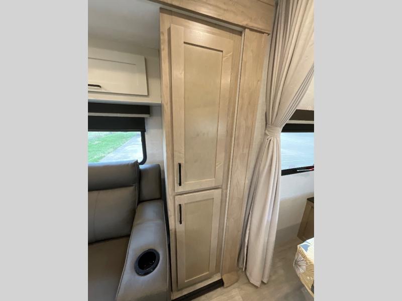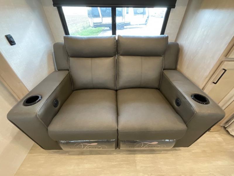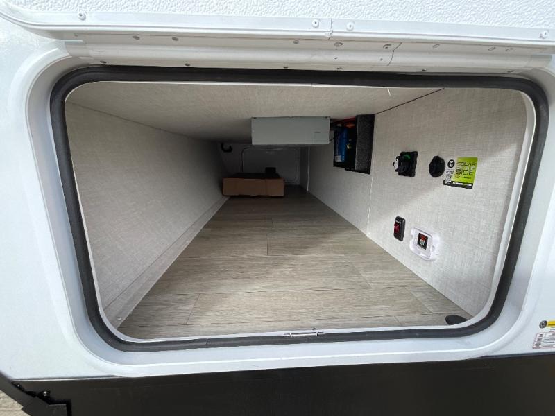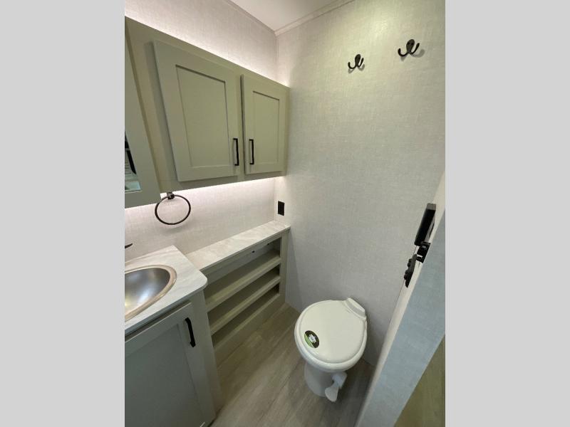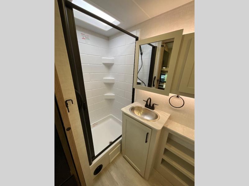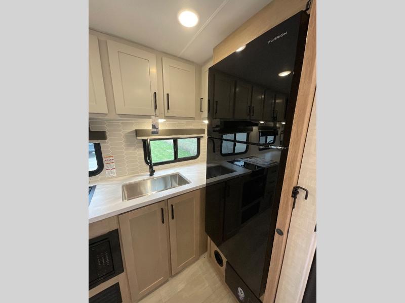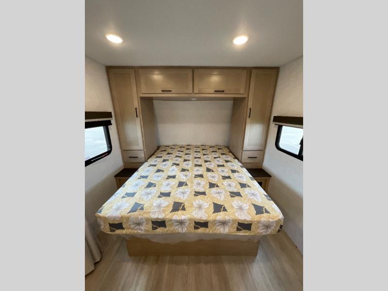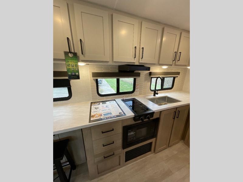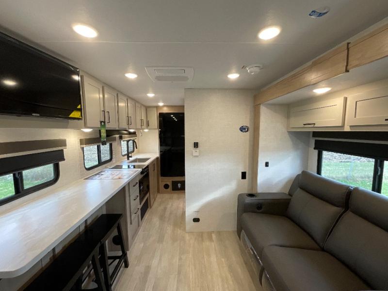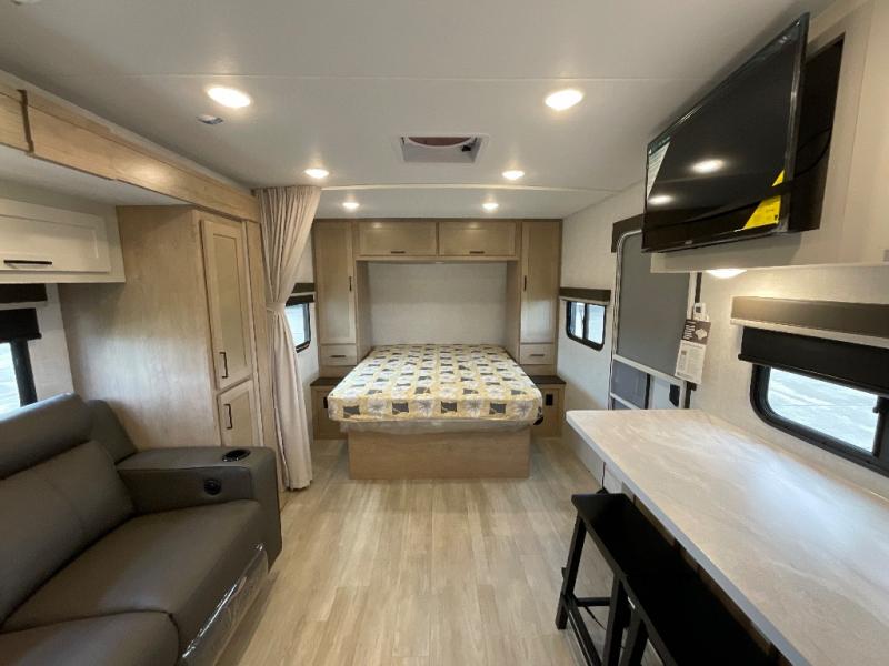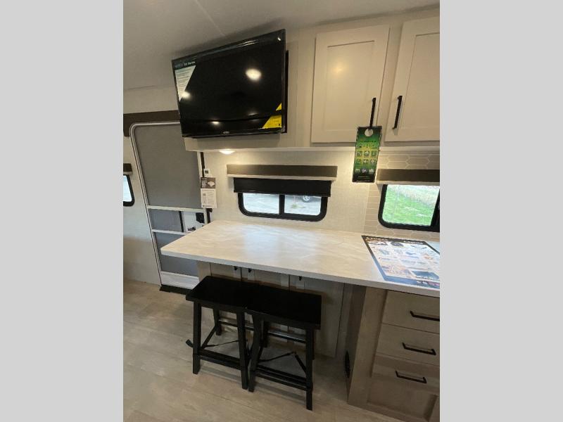 Camping trips just got sweeter in this single slide out travel trailer that will sleep two each night! There is a front queen bed with dual wardrobes and nightstands to keep your things tidy, plus a privacy curtain at the foot of the bed if you have someone staying over on an air mattress. You can relax on the theater seating slide out that also includes a wardrobe/pantry here for snacks or paper products. The kitchen with a dual burner cooktop and air fryer convection microwave will let you make meals each day, and the 10 cu. ft. 12V refrigerator will be perfect for your perishables. This unit also includes a breakfast bar/desktop area with two bar stools where you can dine or work from home. And of course there is a full bath on board so you can clean up after a day outdoors!