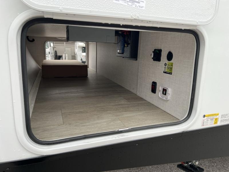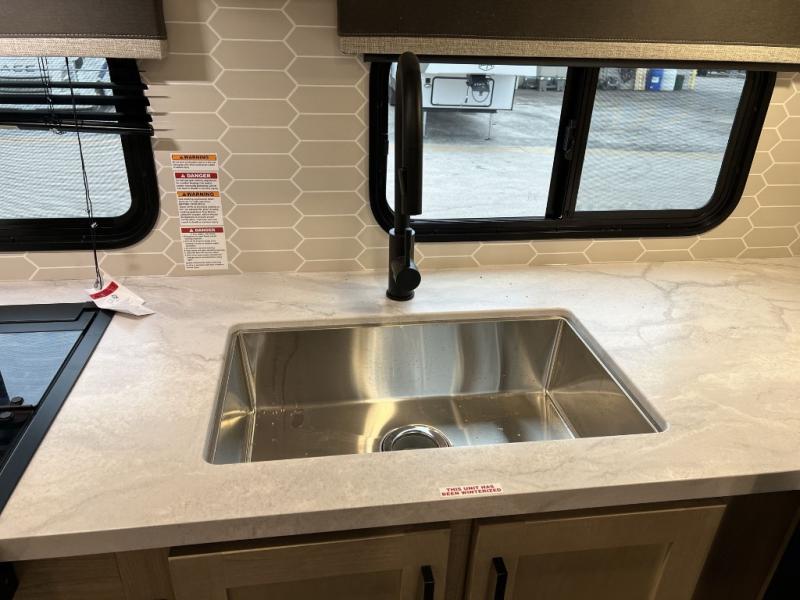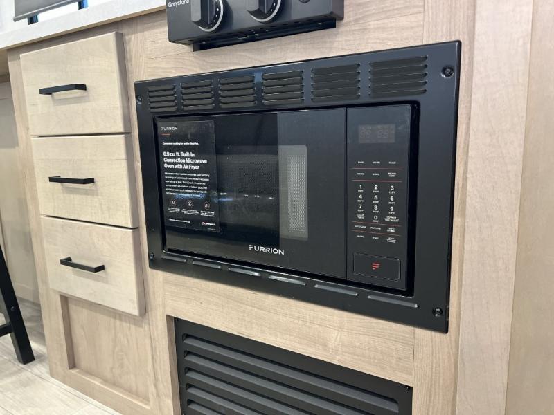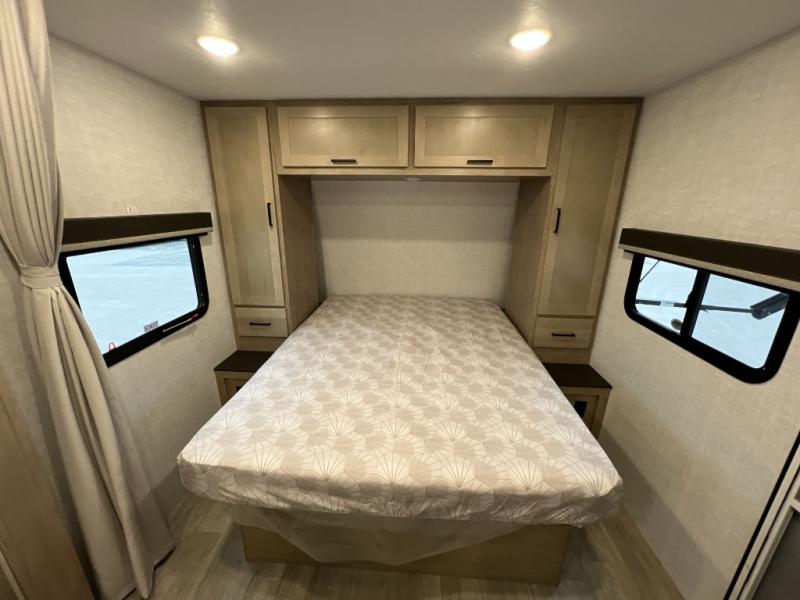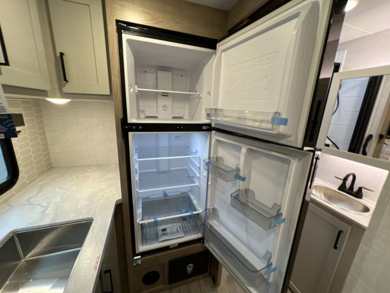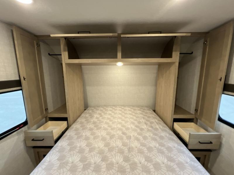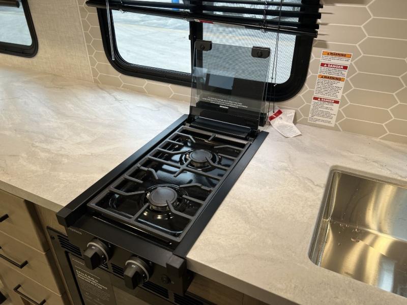 Camping trips just got sweeter in this single slide out travel trailer that will sleep two each night! There is a front queen bed with dual wardrobes and nightstands to keep your things tidy, plus a privacy curtain at the foot of the bed if you have someone staying over on an air mattress. You can relax on the theater seating slide out that also includes a wardrobe/pantry here for snacks or paper products. The kitchen with a dual burner cooktop and air fryer convection microwave will let you make meals each day, and the 10 cu. ft. 12V refrigerator will be perfect for your perishables. This unit also includes a breakfast bar/desktop area with two bar stools where you can dine or work from home. And of course there is a full bath on board so you can clean up after a day outdoors!