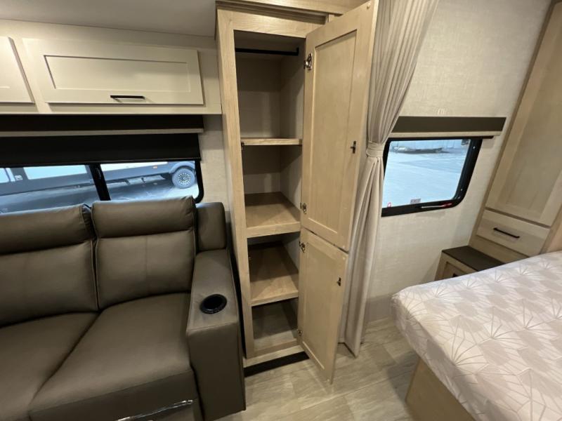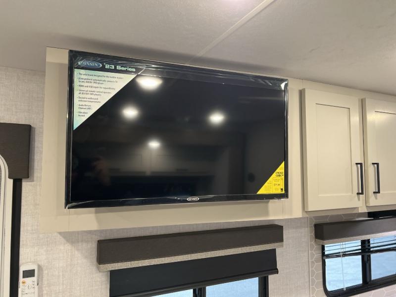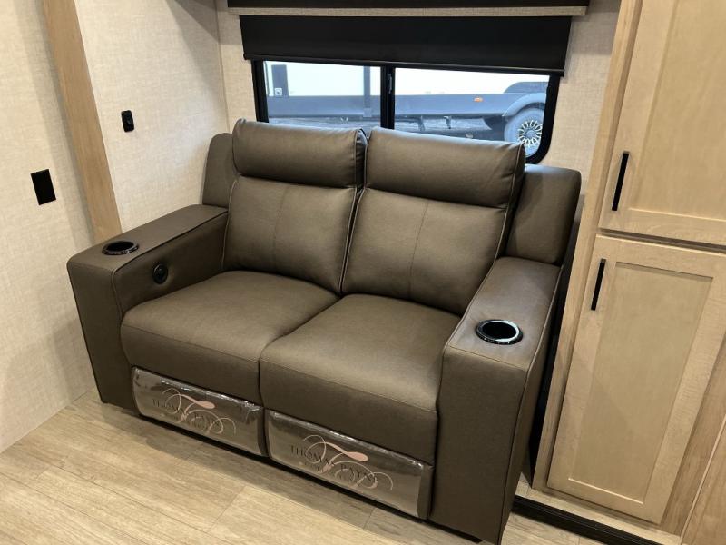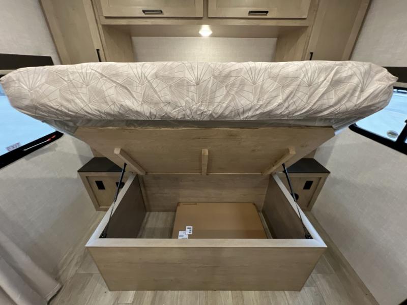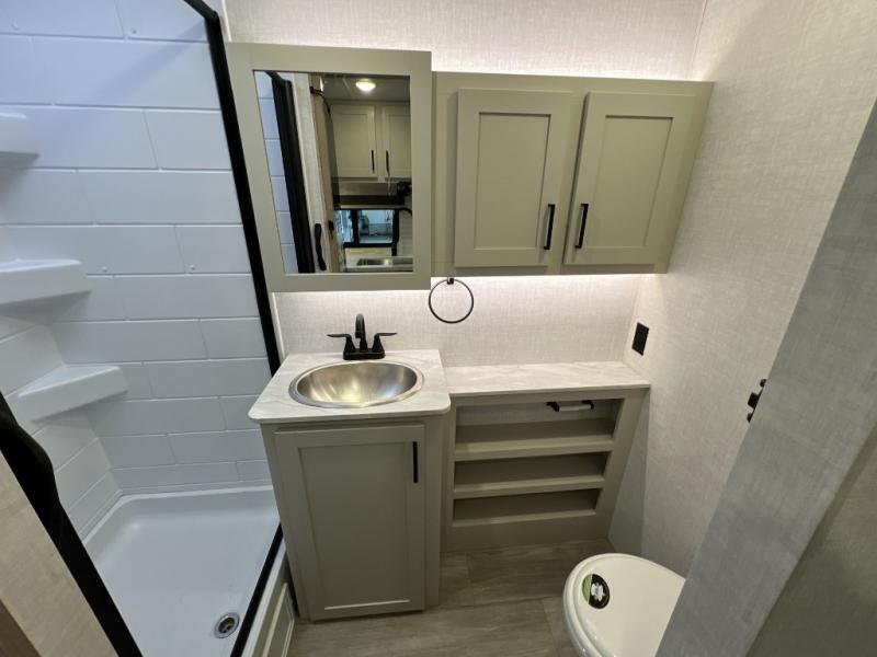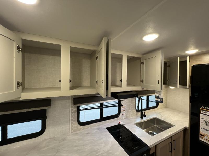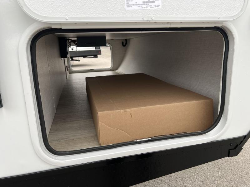 Camping trips just got sweeter in this single slide out travel trailer that will sleep two each night! There is a front queen bed with dual wardrobes and nightstands to keep your things tidy, plus a privacy curtain at the foot of the bed if you have someone staying over on an air mattress. You can relax on the theater seating slide out that also includes a wardrobe/pantry here for snacks or paper products. The kitchen with a dual burner cooktop and air fryer convection microwave will let you make meals each day, and the 10 cu. ft. 12V refrigerator will be perfect for your perishables. This unit also includes a breakfast bar/desktop area with two bar stools where you can dine or work from home. And of course there is a full bath on board so you can clean up after a day outdoors!