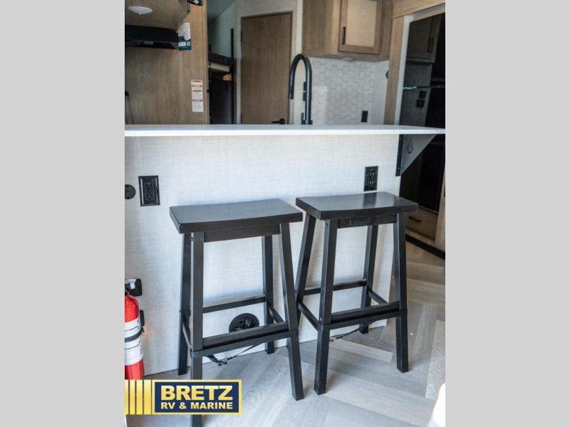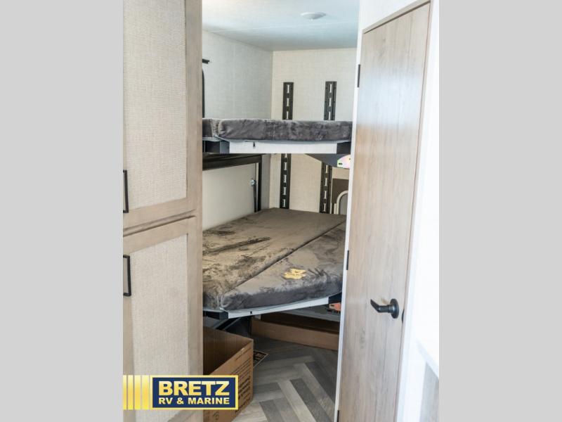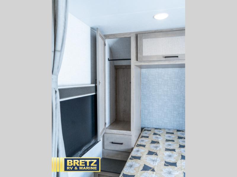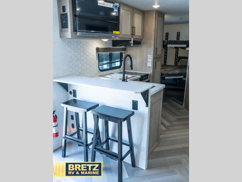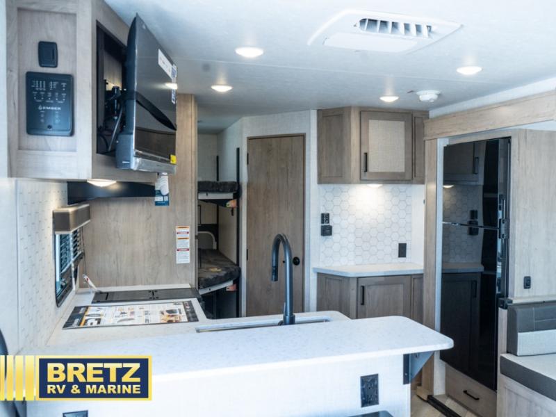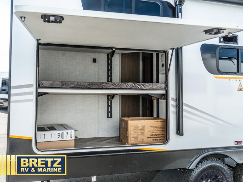 You'll love every minute spent in this spacious travel trailer that can sleep up to six. The patent-pending repositionable EmberTrack E-Track bunk/storage system includes 74" x 45" cargo space, and there are multiple single/double bunk configurations to fit your needs. The front walk-around true residential queen bed includes dual nightstands and dual wardrobes, plus a privacy curtain if you have guests staying over. This E-Series kitchen includes an air fryer convection microwave, a two burner cooktop, plus a breakfast bar with bar stools so you can visit with the chef as they cook meals. A legless dinette or optional theater seating will provide a place to dine, or you can take your plate outdoors to sit under the 14' power awning with a dimmable LED light. You'll also find a pass-through storage outside, along with a docking station and a kayak/bike storage door!