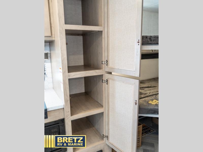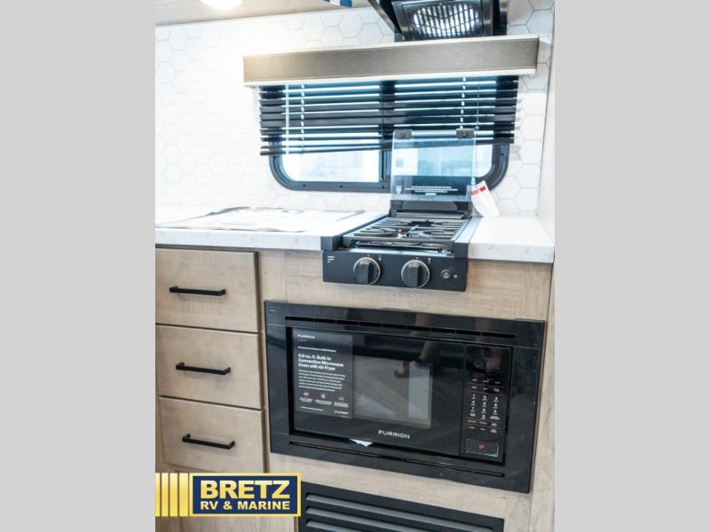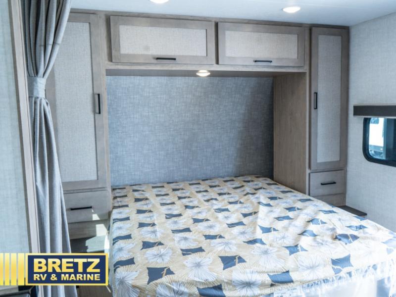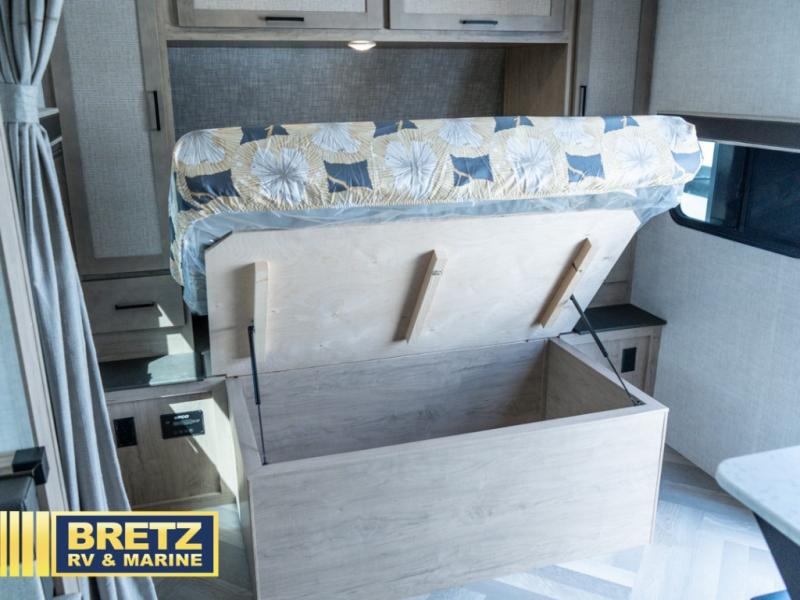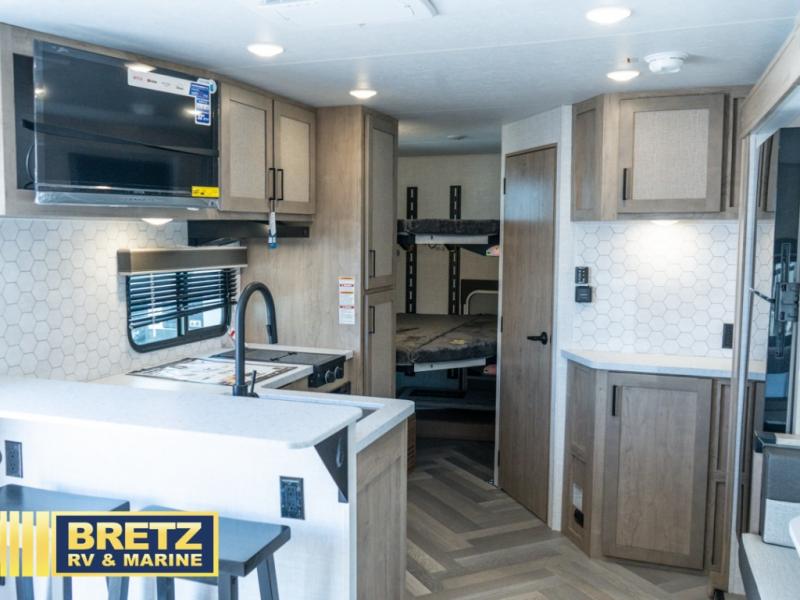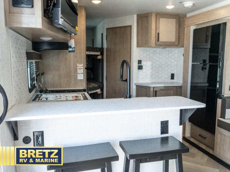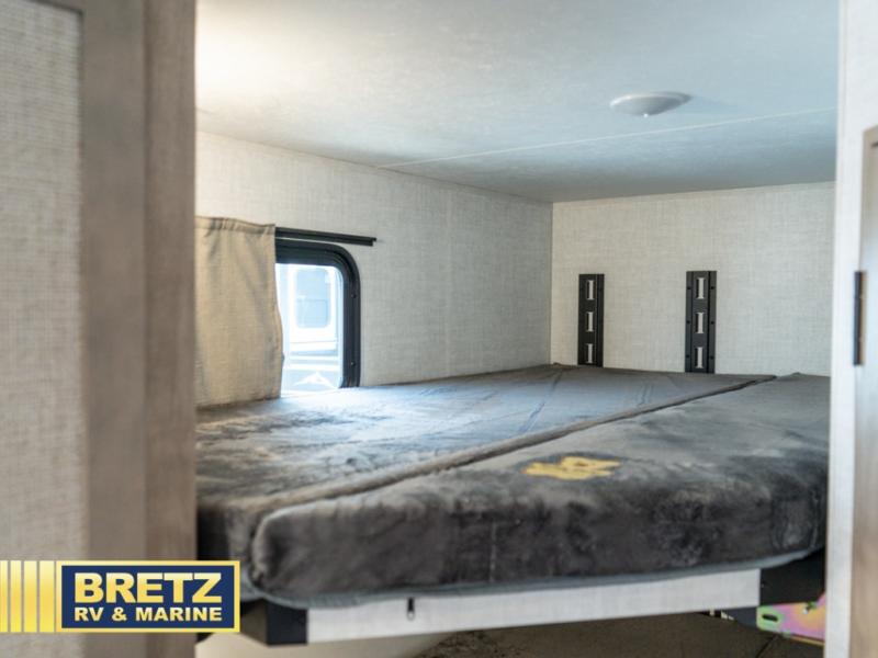 You'll love every minute spent in this spacious travel trailer that can sleep up to six. The patent-pending repositionable EmberTrack E-Track bunk/storage system includes 74" x 45" cargo space, and there are multiple single/double bunk configurations to fit your needs. The front walk-around true residential queen bed includes dual nightstands and dual wardrobes, plus a privacy curtain if you have guests staying over. This E-Series kitchen includes an air fryer convection microwave, a two burner cooktop, plus a breakfast bar with bar stools so you can visit with the chef as they cook meals. A legless dinette or optional theater seating will provide a place to dine, or you can take your plate outdoors to sit under the 14' power awning with a dimmable LED light. You'll also find a pass-through storage outside, along with a docking station and a kayak/bike storage door!
