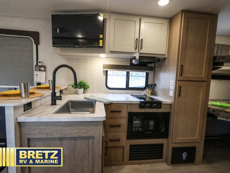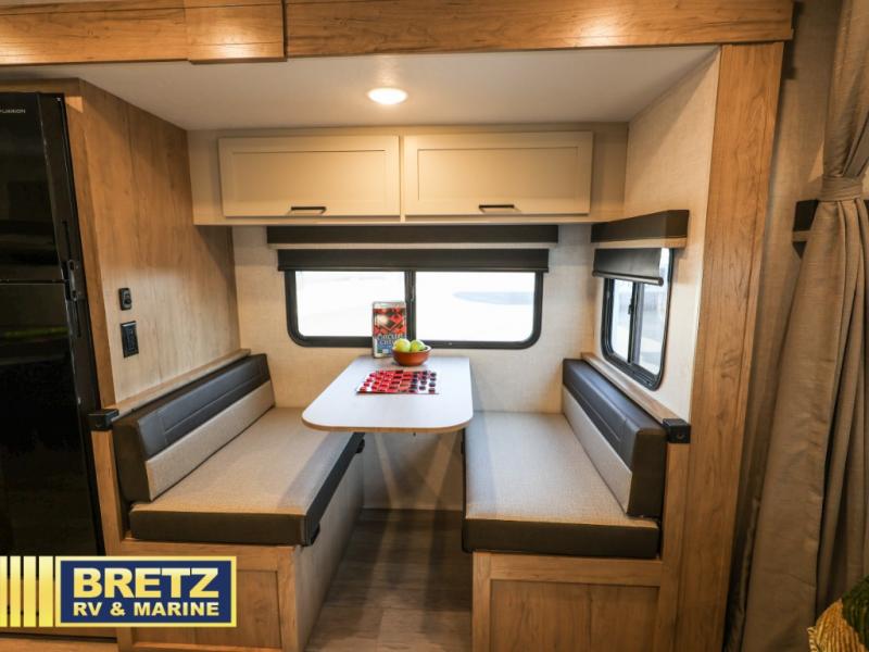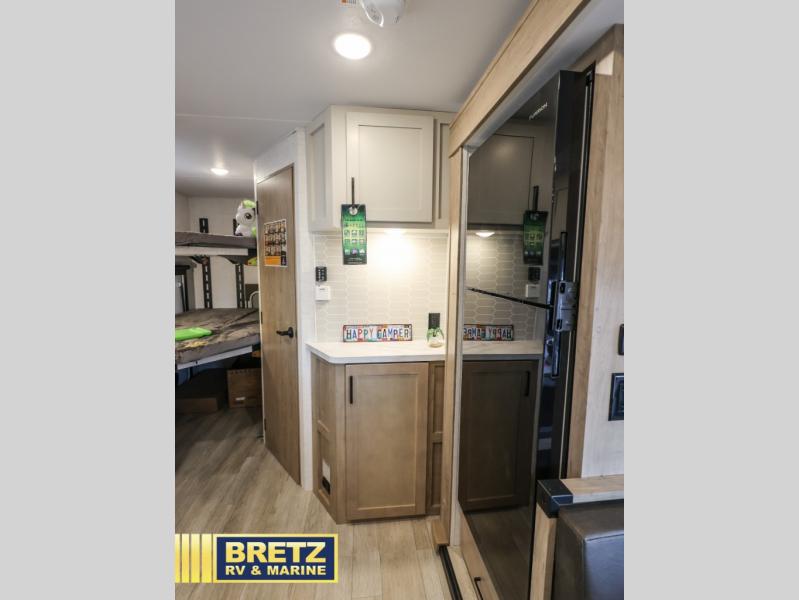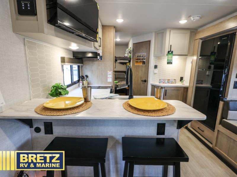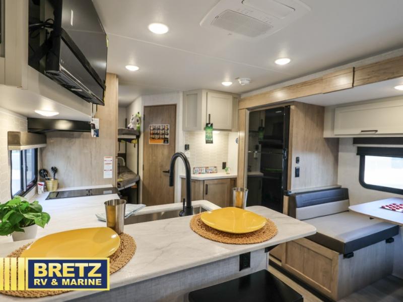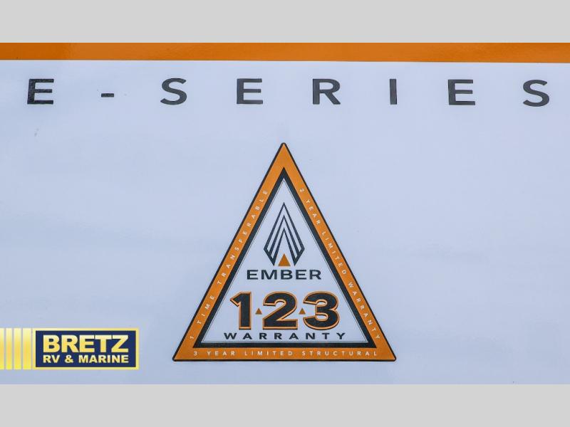 You'll love every minute spent in this spacious travel trailer that can sleep up to six. The patent-pending repositionable EmberTrack E-Track bunk/storage system includes 74" x 45" cargo space, and there are multiple single/double bunk configurations to fit your needs. The front walk-around true residential queen bed includes dual nightstands and dual wardrobes, plus a privacy curtain if you have guests staying over. This E-Series kitchen includes an air fryer convection microwave, a two burner cooktop, plus a breakfast bar with bar stools so you can visit with the chef as they cook meals. A legless dinette or optional theater seating will provide a place to dine, or you can take your plate outdoors to sit under the 14' power awning with a dimmable LED light. You'll also find a pass-through storage outside, along with a docking station and a kayak/bike storage door!