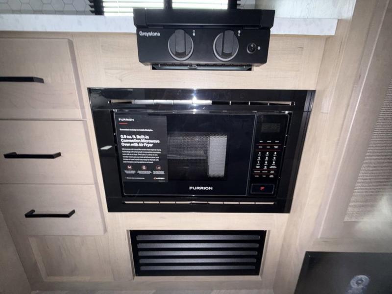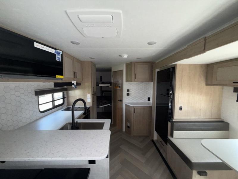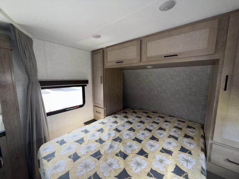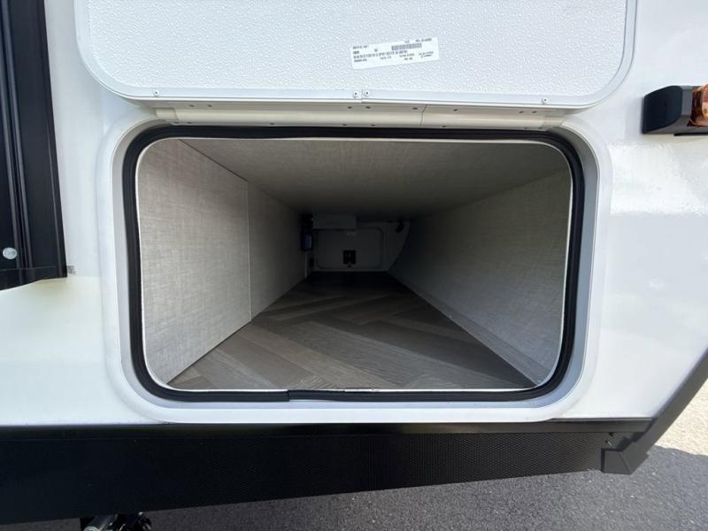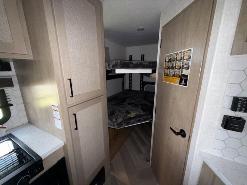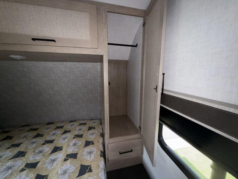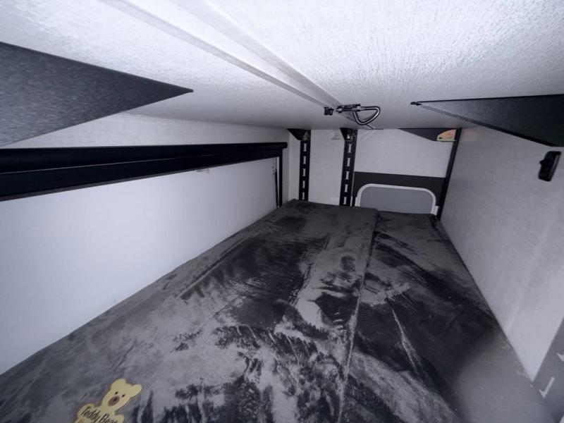 You'll love every minute spent in this spacious travel trailer that can sleep up to six. The patent-pending repositionable EmberTrack E-Track bunk/storage system includes 74" x 45" cargo space, and there are multiple single/double bunk configurations to fit your needs. The front walk-around true residential queen bed includes dual nightstands and dual wardrobes, plus a privacy curtain if you have guests staying over. This E-Series kitchen includes an air fryer convection microwave, a two burner cooktop, plus a breakfast bar with bar stools so you can visit with the chef as they cook meals. A legless dinette or optional theater seating will provide a place to dine, or you can take your plate outdoors to sit under the 14' power awning with a dimmable LED light. You'll also find a pass-through storage outside, along with a docking station and a kayak/bike storage door!