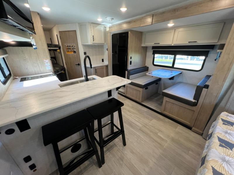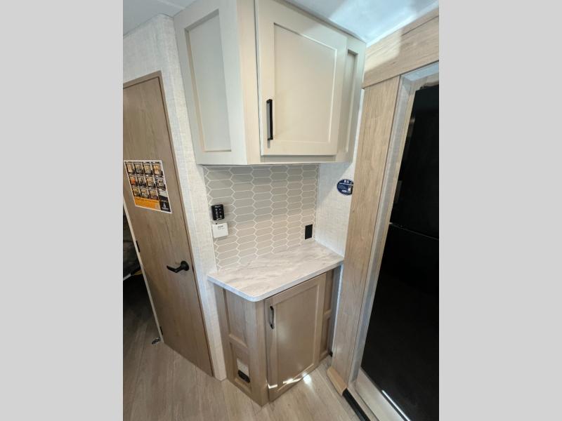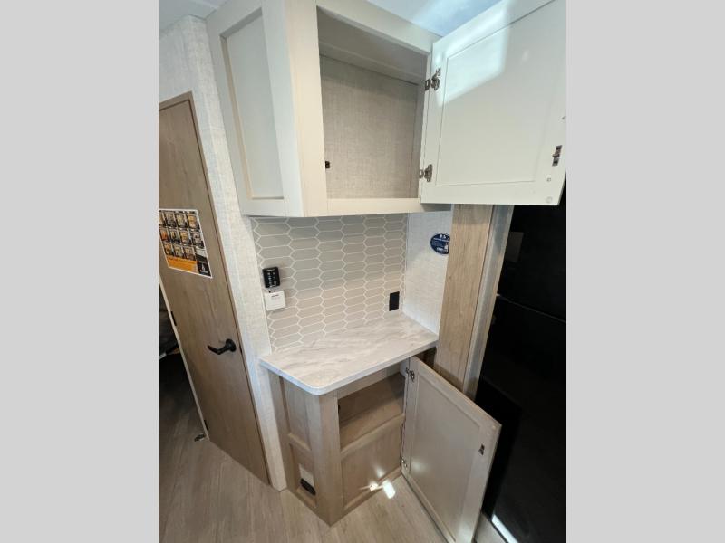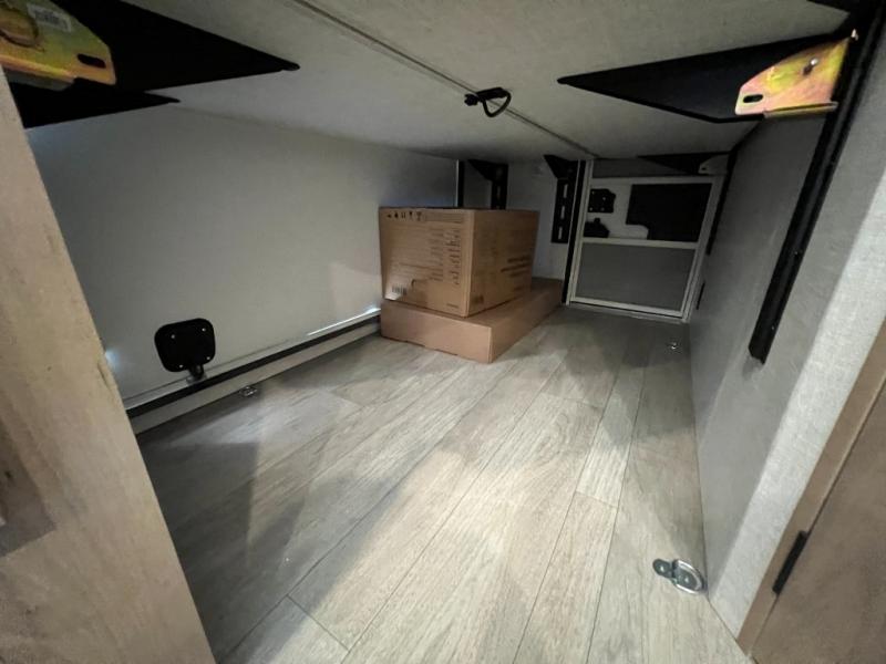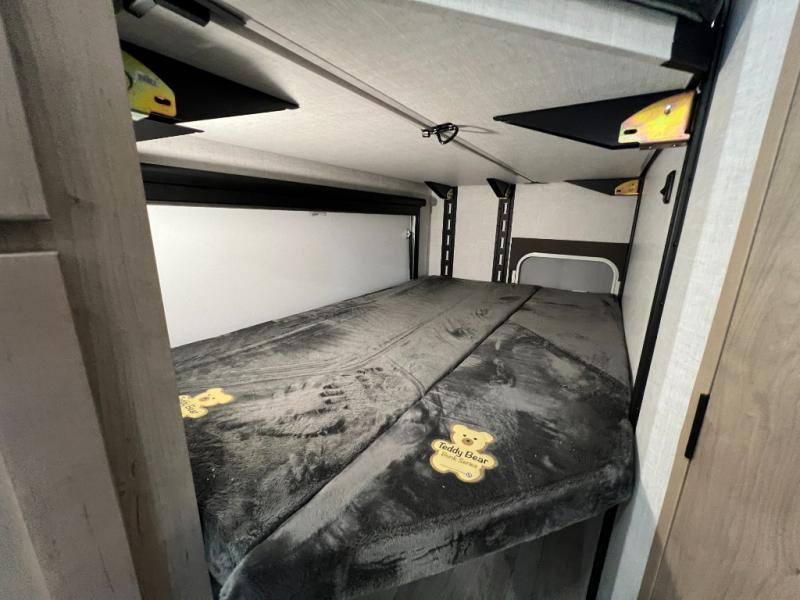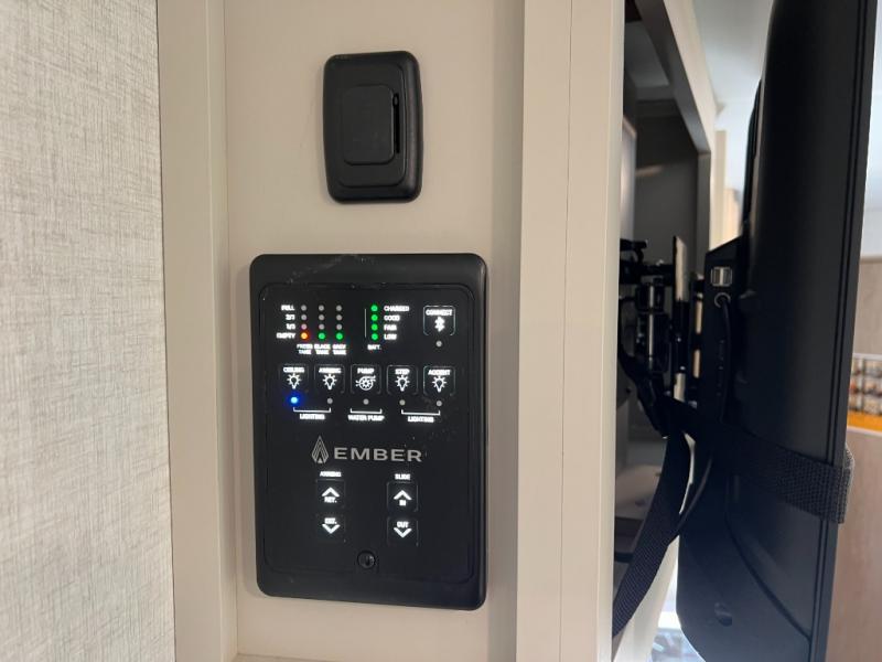 You'll love every minute spent in this spacious travel trailer that can sleep up to six. The patent-pending repositionable EmberTrack E-Track bunk/storage system includes 74" x 45" cargo space, and there are multiple single/double bunk configurations to fit your needs. The front walk-around true residential queen bed includes dual nightstands and dual wardrobes, plus a privacy curtain if you have guests staying over. This E-Series kitchen includes an air fryer convection microwave, a two burner cooktop, plus a breakfast bar with bar stools so you can visit with the chef as they cook meals. A legless dinette or optional theater seating will provide a place to dine, or you can take your plate outdoors to sit under the 14' power awning with a dimmable LED light. You'll also find a pass-through storage outside, along with a docking station and a kayak/bike storage door!