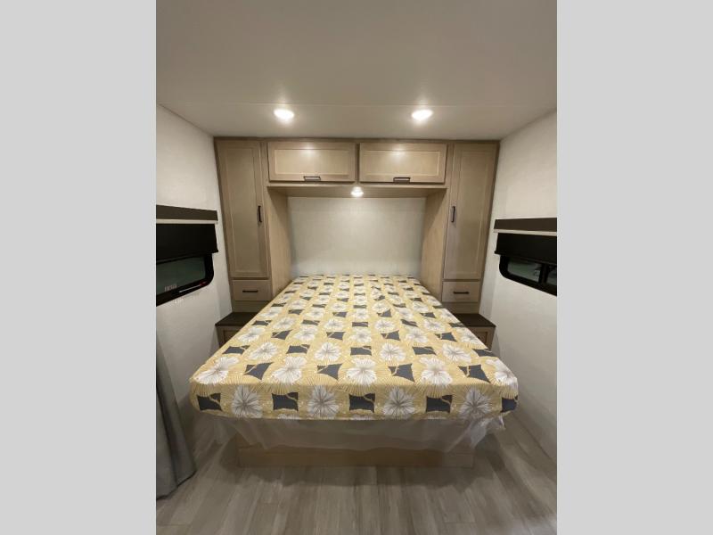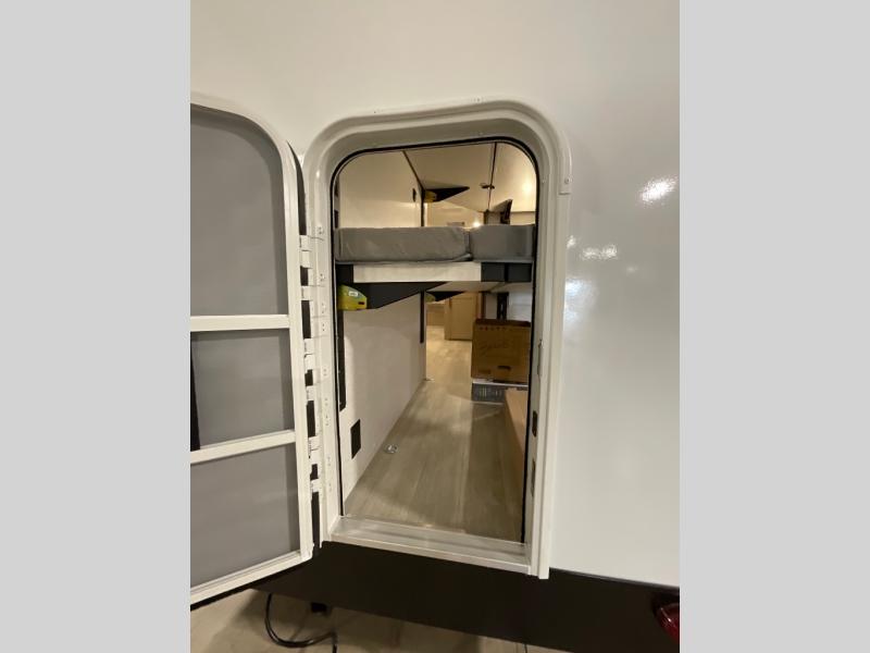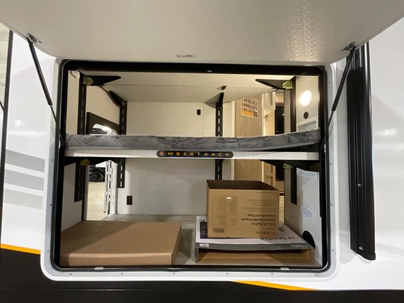 You'll love every minute spent in this spacious travel trailer that can sleep up to six. The patent-pending repositionable EmberTrack E-Track bunk/storage system includes 74" x 45" cargo space, and there are multiple single/double bunk configurations to fit your needs. The front walk-around true residential queen bed includes dual nightstands and dual wardrobes, plus a privacy curtain if you have guests staying over. This E-Series kitchen includes an air fryer convection microwave, a two burner cooktop, plus a breakfast bar with bar stools so you can visit with the chef as they cook meals. A legless dinette or optional theater seating will provide a place to dine, or you can take your plate outdoors to sit under the 14' power awning with a dimmable LED light. You'll also find a pass-through storage outside, along with a docking station and a kayak/bike storage door!
