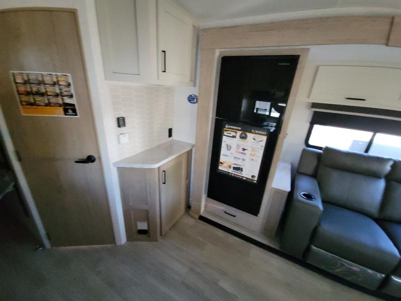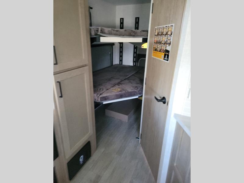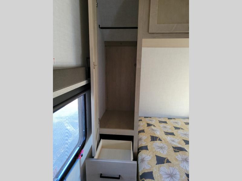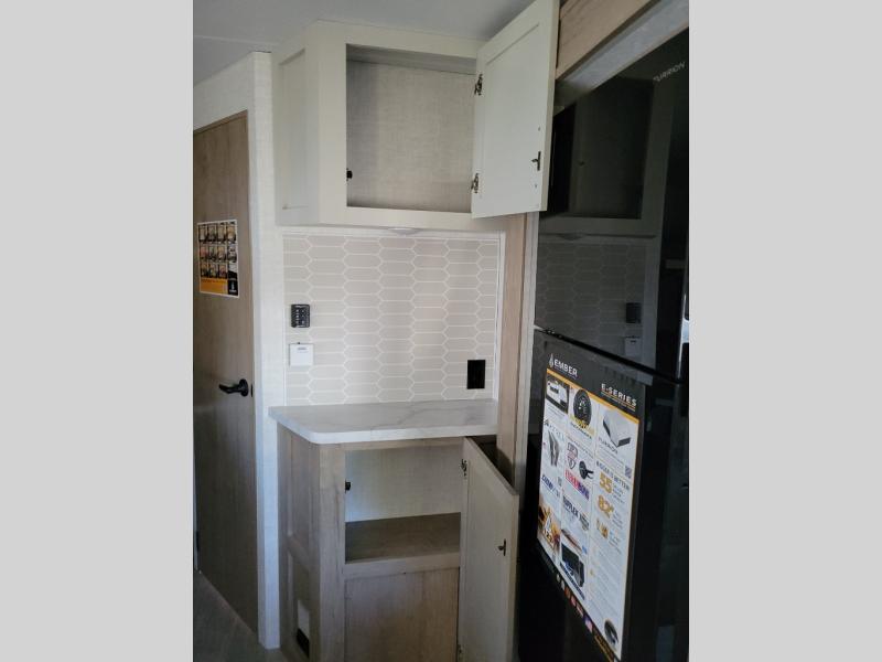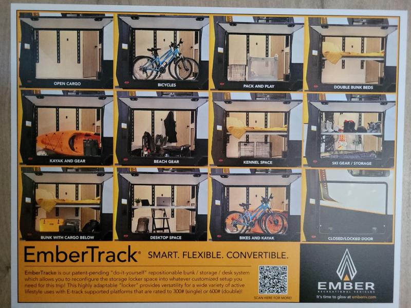 You'll love every minute spent in this spacious travel trailer that can sleep up to six. The patent-pending repositionable EmberTrack E-Track bunk/storage system includes 74" x 45" cargo space, and there are multiple single/double bunk configurations to fit your needs. The front walk-around true residential queen bed includes dual nightstands and dual wardrobes, plus a privacy curtain if you have guests staying over. This E-Series kitchen includes an air fryer convection microwave, a two burner cooktop, plus a breakfast bar with bar stools so you can visit with the chef as they cook meals. A legless dinette or optional theater seating will provide a place to dine, or you can take your plate outdoors to sit under the 14' power awning with a dimmable LED light. You'll also find a pass-through storage outside, along with a docking station and a kayak/bike storage door!