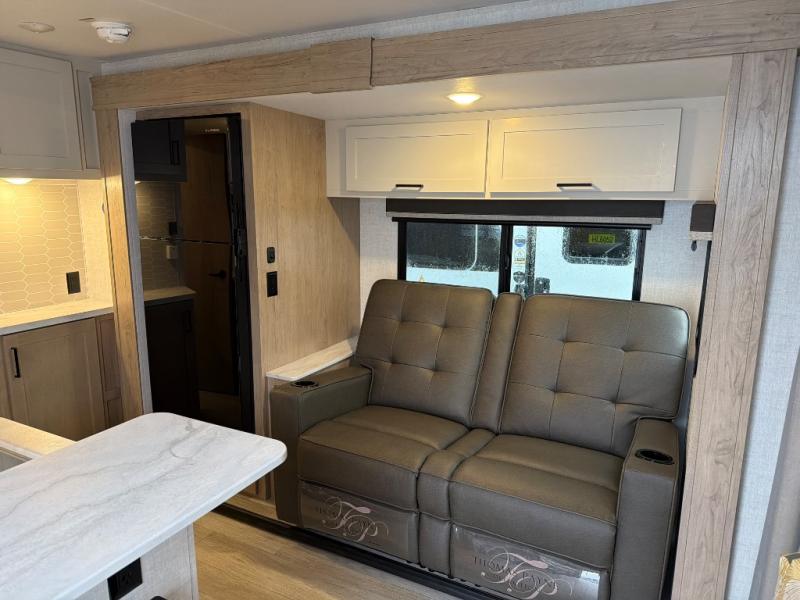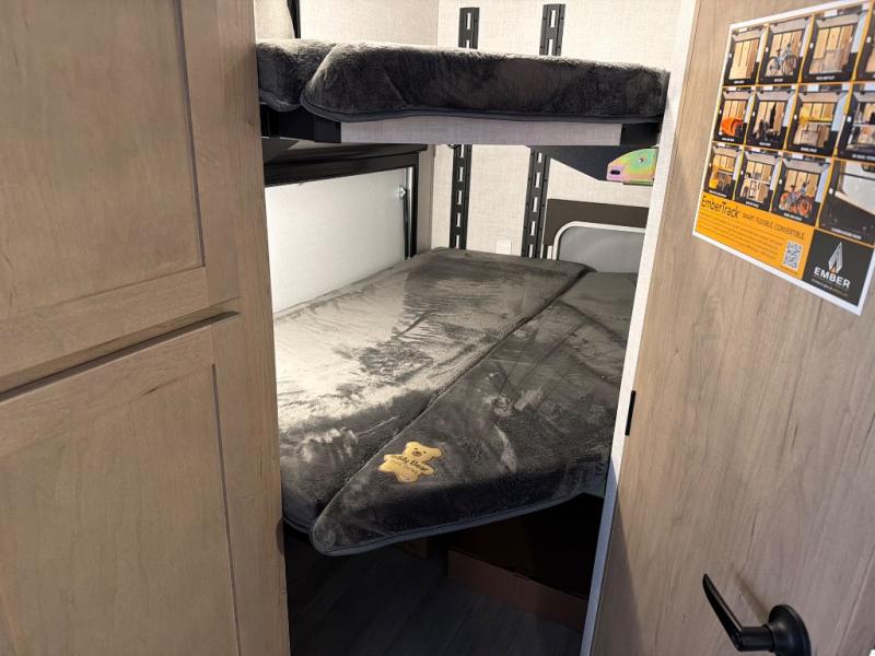 You'll love every minute spent in this spacious travel trailer that can sleep up to six. The patent-pending repositionable EmberTrack E-Track bunk/storage system includes 74" x 45" cargo space, and there are multiple single/double bunk configurations to fit your needs. The front walk-around true residential queen bed includes dual nightstands and dual wardrobes, plus a privacy curtain if you have guests staying over. This E-Series kitchen includes an air fryer convection microwave, a two burner cooktop, plus a breakfast bar with bar stools so you can visit with the chef as they cook meals. A legless dinette or optional theater seating will provide a place to dine, or you can take your plate outdoors to sit under the 14' power awning with a dimmable LED light. You'll also find a pass-through storage outside, along with a docking station and a kayak/bike storage door!