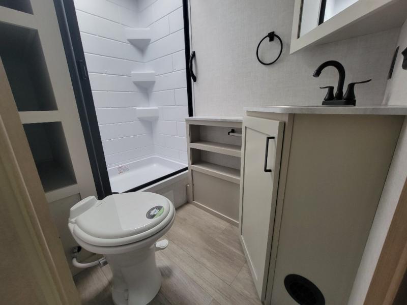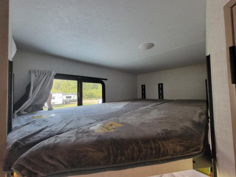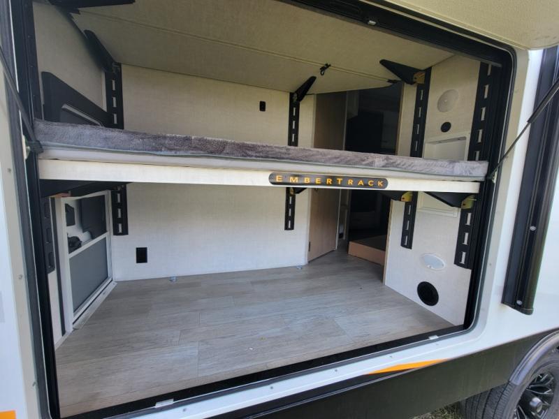 You'll love every minute spent in this spacious travel trailer that can sleep up to six. The patent-pending repositionable EmberTrack E-Track bunk/storage system includes 74" x 45" cargo space, and there are multiple single/double bunk configurations to fit your needs. The front walk-around true residential queen bed includes dual nightstands and dual wardrobes, plus a privacy curtain if you have guests staying over. This E-Series kitchen includes an air fryer convection microwave, a two burner cooktop, plus a breakfast bar with bar stools so you can visit with the chef as they cook meals. A legless dinette or optional theater seating will provide a place to dine, or you can take your plate outdoors to sit under the 14' power awning with a dimmable LED light. You'll also find a pass-through storage outside, along with a docking station and a kayak/bike storage door!