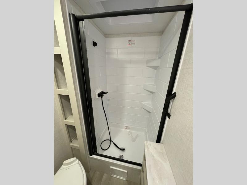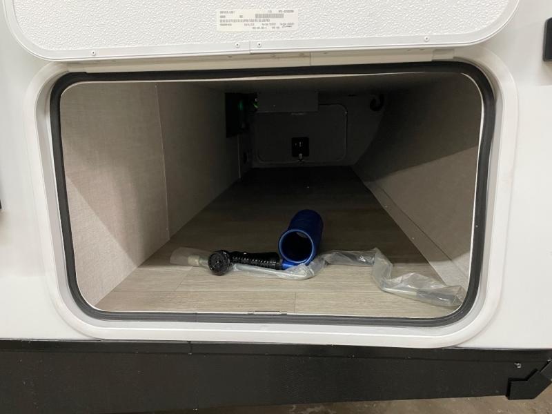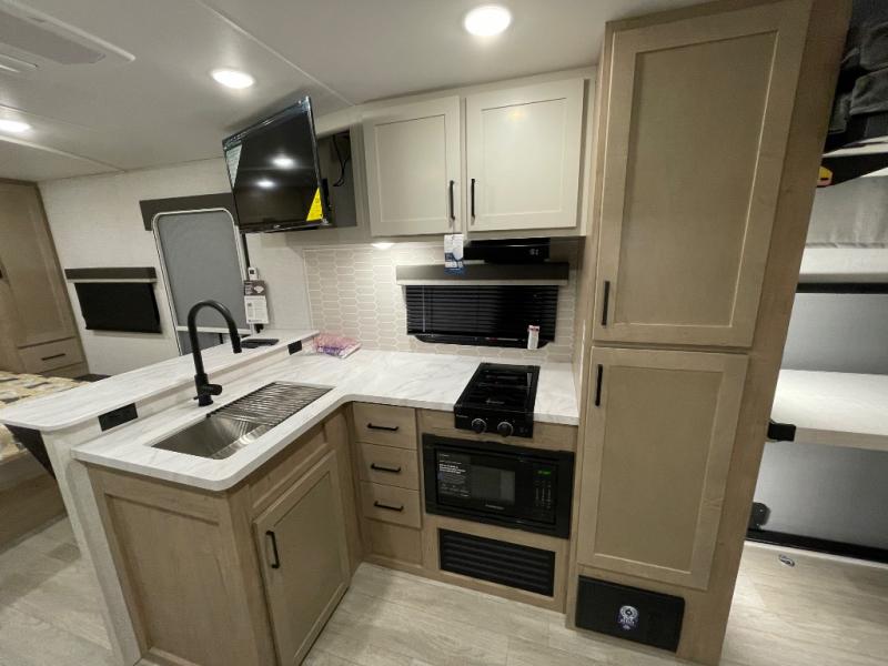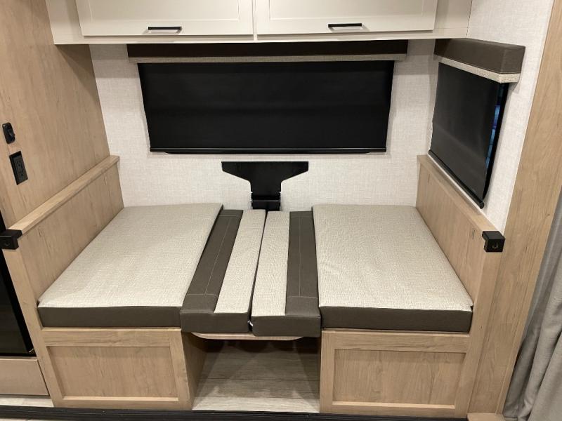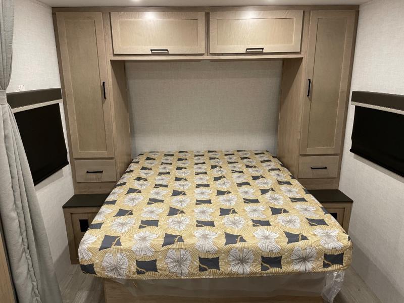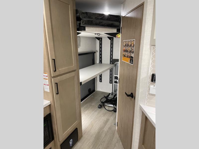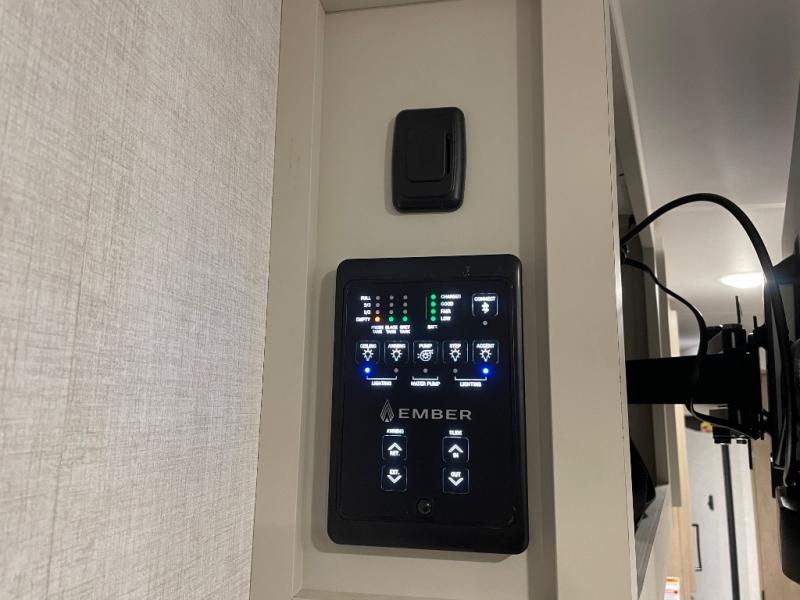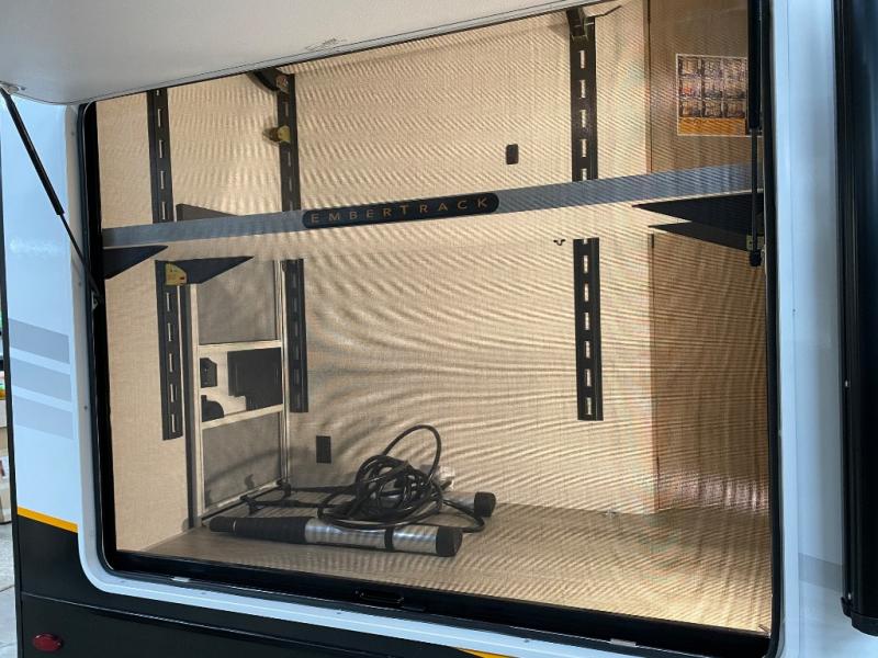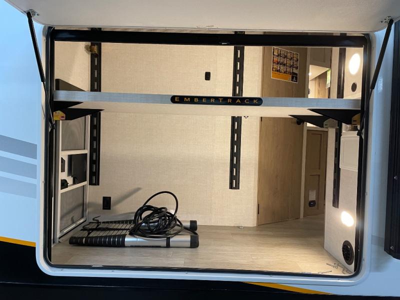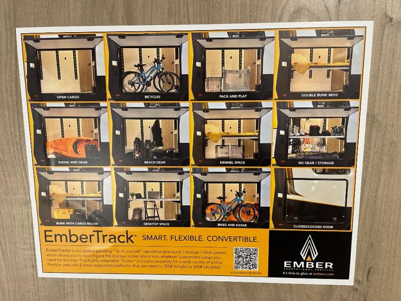 You'll love every minute spent in this spacious travel trailer that can sleep up to six. The patent-pending repositionable EmberTrack E-Track bunk/storage system includes 74" x 45" cargo space, and there are multiple single/double bunk configurations to fit your needs. The front walk-around true residential queen bed includes dual nightstands and dual wardrobes, plus a privacy curtain if you have guests staying over. This E-Series kitchen includes an air fryer convection microwave, a two burner cooktop, plus a breakfast bar with bar stools so you can visit with the chef as they cook meals. A legless dinette or optional theater seating will provide a place to dine, or you can take your plate outdoors to sit under the 14' power awning with a dimmable LED light. You'll also find a pass-through storage outside, along with a docking station and a kayak/bike storage door!