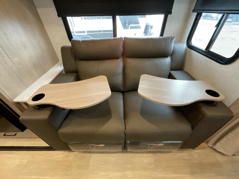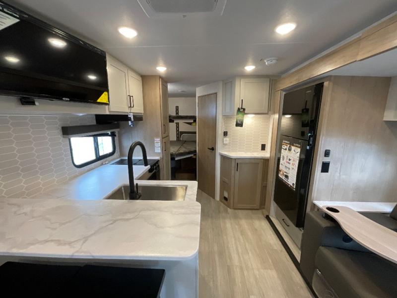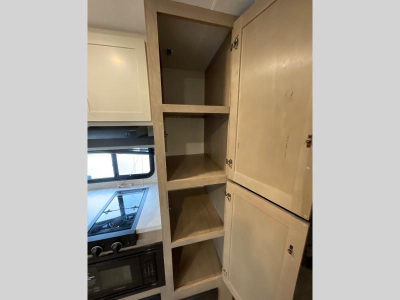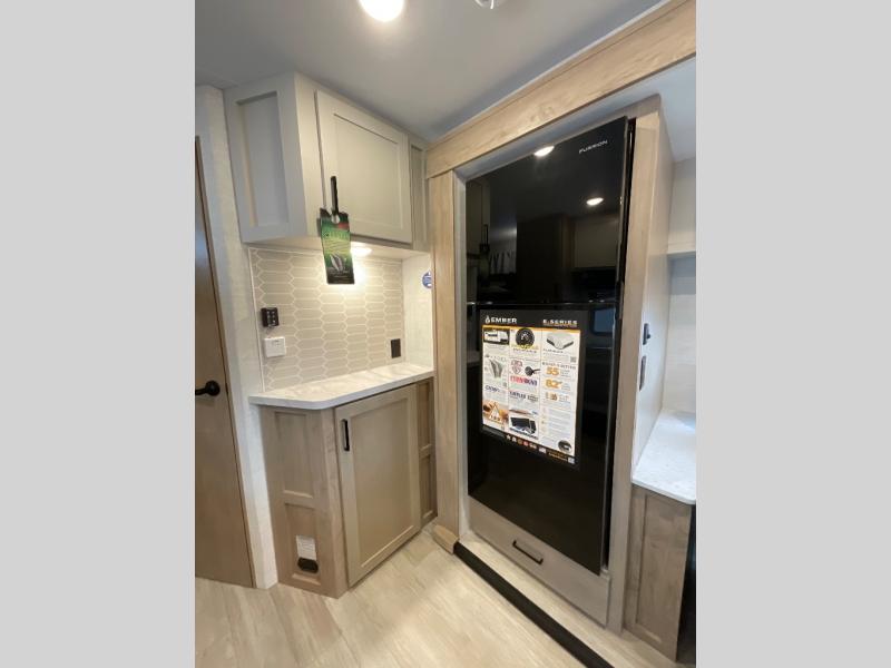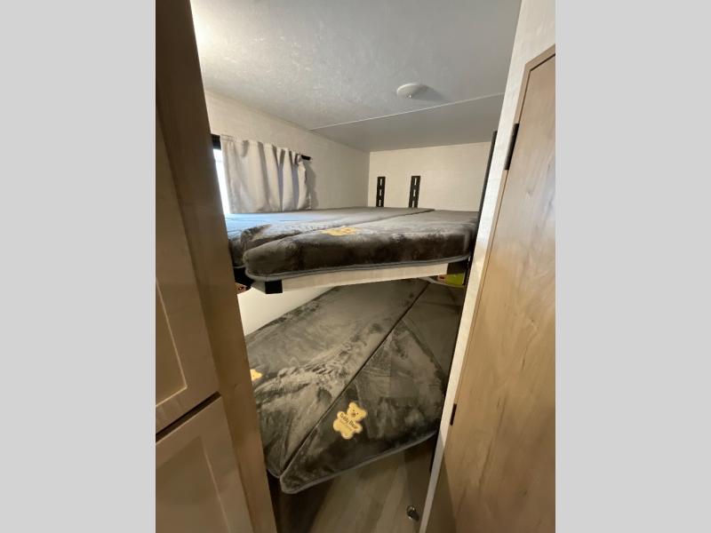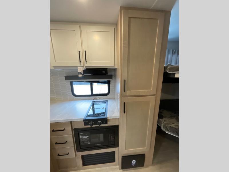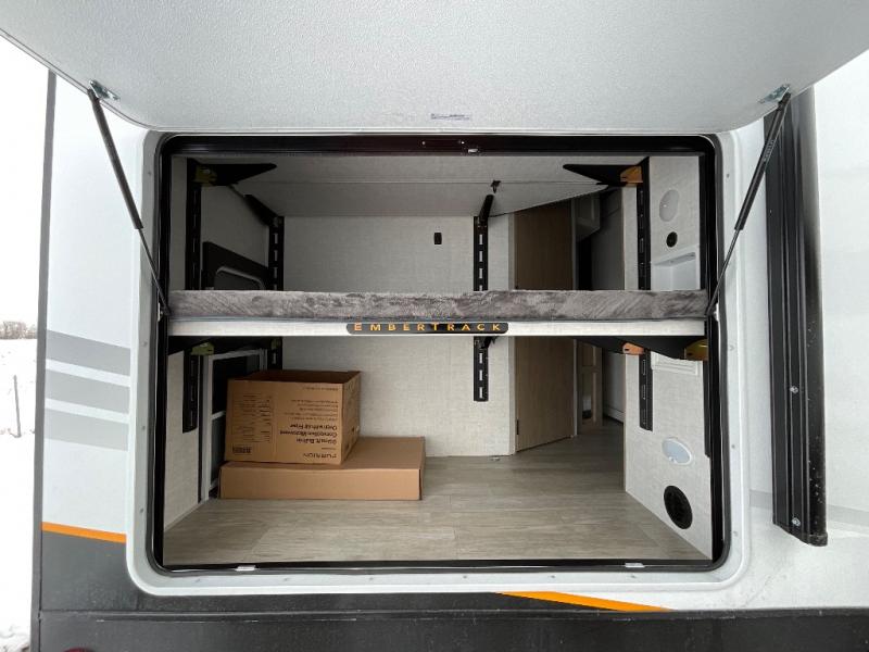 You'll love every minute spent in this spacious travel trailer that can sleep up to six. The patent-pending repositionable EmberTrack E-Track bunk/storage system includes 74" x 45" cargo space, and there are multiple single/double bunk configurations to fit your needs. The front walk-around true residential queen bed includes dual nightstands and dual wardrobes, plus a privacy curtain if you have guests staying over. This E-Series kitchen includes an air fryer convection microwave, a two burner cooktop, plus a breakfast bar with bar stools so you can visit with the chef as they cook meals. A legless dinette or optional theater seating will provide a place to dine, or you can take your plate outdoors to sit under the 14' power awning with a dimmable LED light. You'll also find a pass-through storage outside, along with a docking station and a kayak/bike storage door!