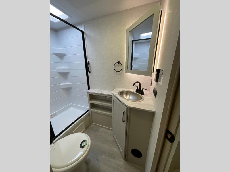 With any E-Series travel trailer by Ember RV you will enjoy a lightweight RV with all the "Essentials" needed for memorable trips in the great outdoors! Each model is constructed with durable laminated Azdel Onboard composite walls, a full walkable roof with a one-piece Tufflex PVC roofing material, and a gel-coated fiberglass exterior. The Dexter axles with E-Z lube hubs and forward self-adjusting electric brakes plus Goodyear Endurance tires will provide a smooth tow from home to campground. You will appreciate the Congoleum DiamondFlor "carpetless" interior that is easy to clean, and the hardwood framed cabinet doors will create a more residential feel. Each model includes a tankless on-demand water heater for endless hot showers and an 18,000 BTU Max Cool "Whisper Quiet" A/C, which is the largest single A/C in its class! If you're looking for off-grid capabilities, you might want to choose the optional Off-Grid Solar Package with 400 total watts of solar panels, a 2,000W Pure Sine wave inverter, and a Victron MPPT solar controller!