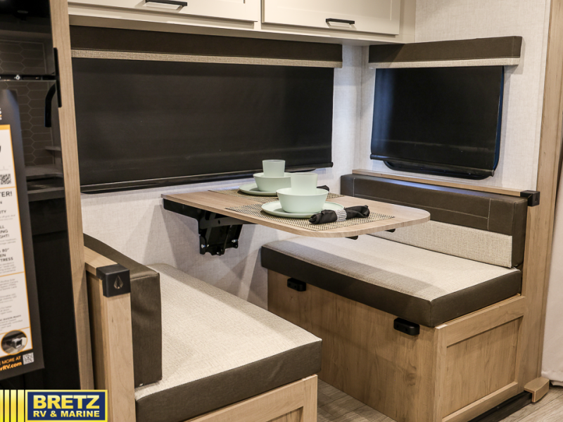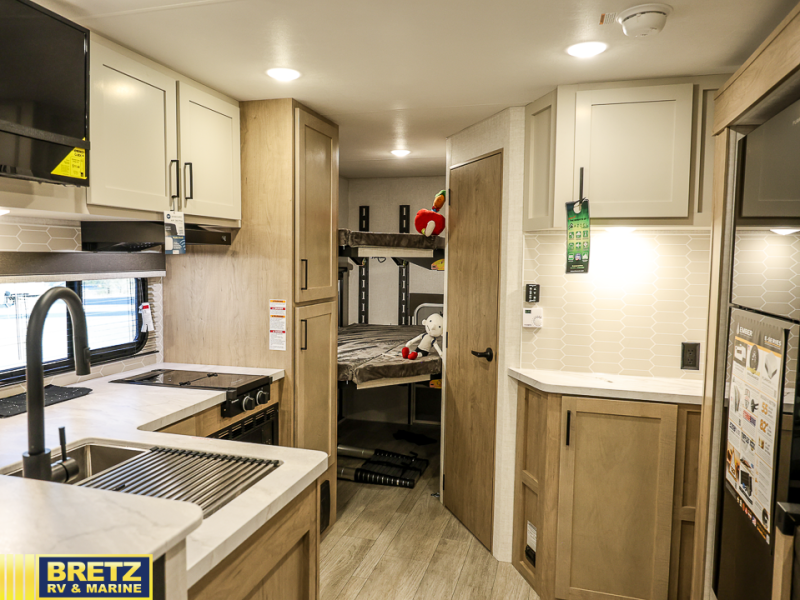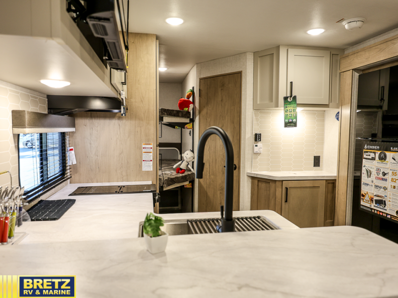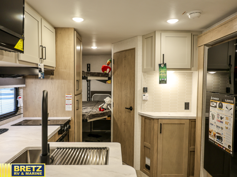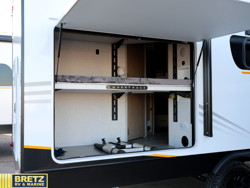 You'll love every minute spent in this spacious travel trailer that can sleep up to six. The repositionable EmberTrack E-Track bunk/storage system includes 74" x 46" cargo space, and there are multiple single/double bunk configurations to fit your needs. The front walk-around residential queen bed includes dual nightstands and dual wardrobes, plus a privacy curtain if you have guests staying over, and an optional Murphy bed is available if you choose that bed configuration. This E-Series kitchen includes an air fryer convection microwave, a two-burner cooktop, plus a breakfast bar with bar stools so you can visit with the chef as they cook meals. A legless dinette or optional theater seating will provide a place to dine, or you can take your plate outdoors to sit under the 14' power awning with a dimmable LED light. You'll also find a pass-through storage outside, along with a docking station and a kayak/bike storage door!