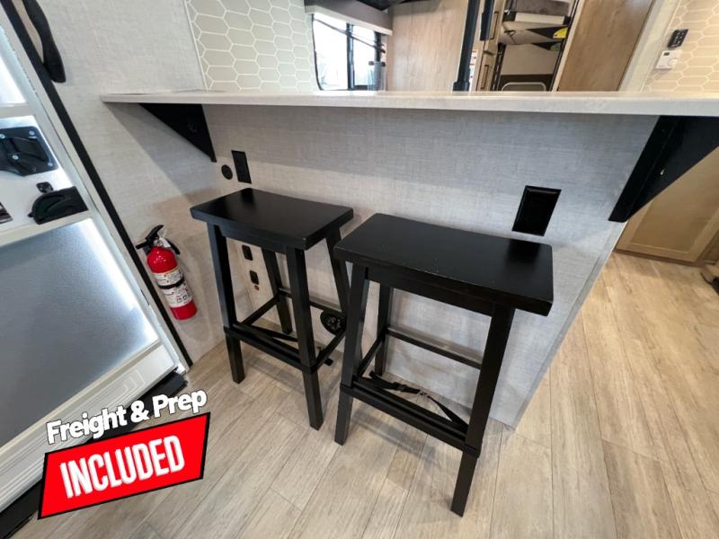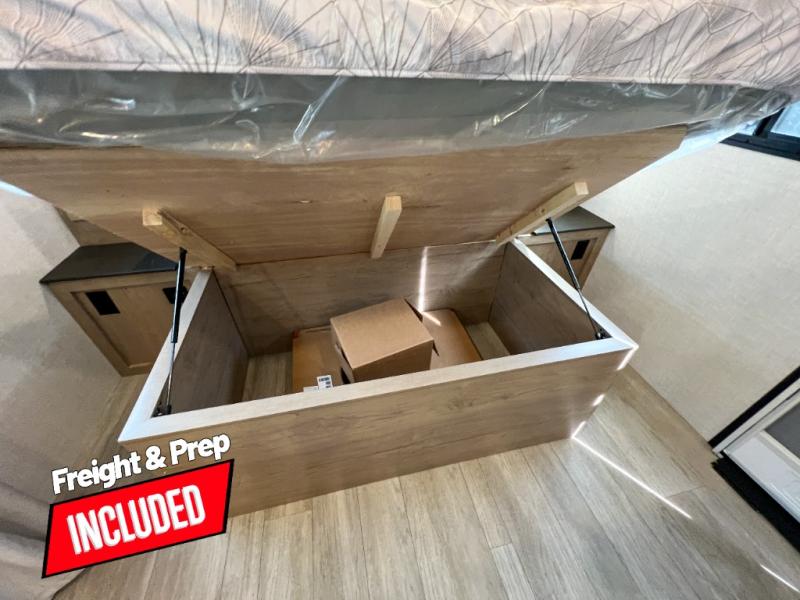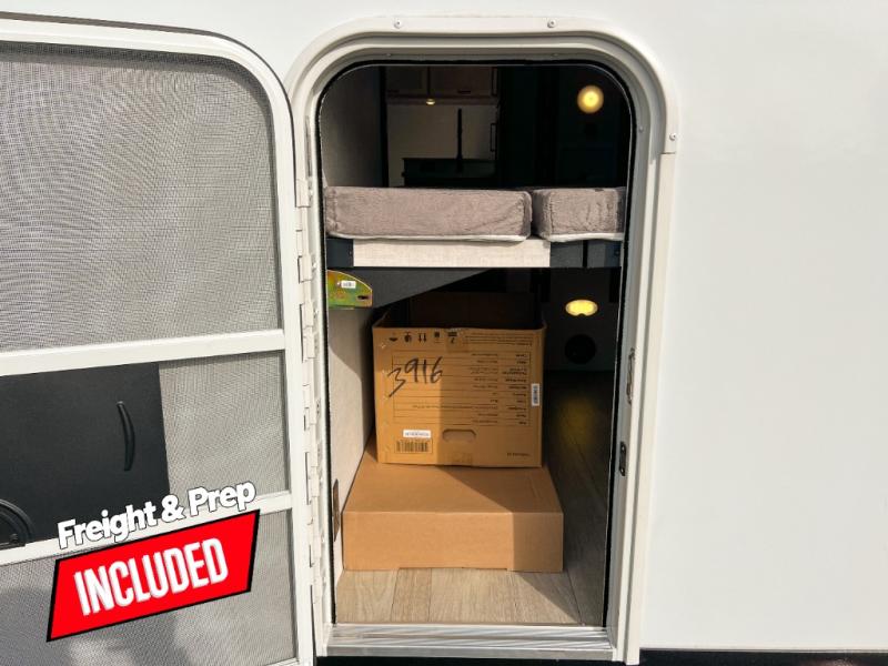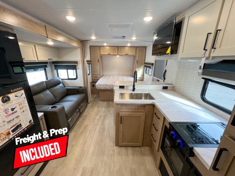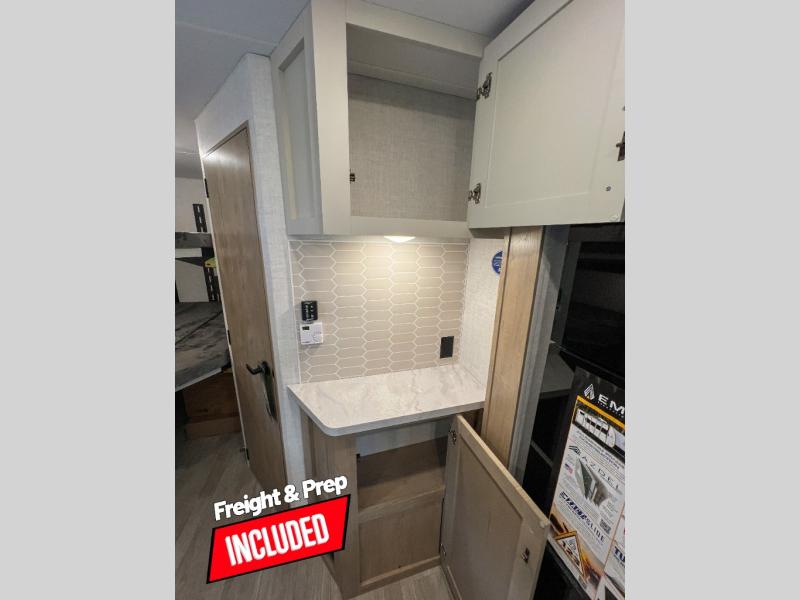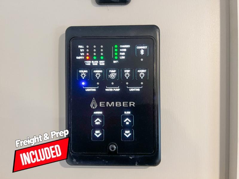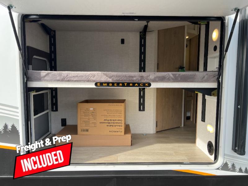 You'll love every minute spent in this spacious travel trailer that can sleep up to six. The repositionable EmberTrack E-Track bunk/storage system includes 74" x 46" cargo space, and there are multiple single/double bunk configurations to fit your needs. The front walk-around residential queen bed includes dual nightstands and dual wardrobes, plus a privacy curtain if you have guests staying over, and an optional Murphy bed is available if you choose that bed configuration. This E-Series kitchen includes an air fryer convection microwave, a two-burner cooktop, plus a breakfast bar with bar stools so you can visit with the chef as they cook meals. A legless dinette or optional theater seating will provide a place to dine, or you can take your plate outdoors to sit under the 14' power awning with a dimmable LED light. You'll also find a pass-through storage outside, along with a docking station and a kayak/bike storage door!