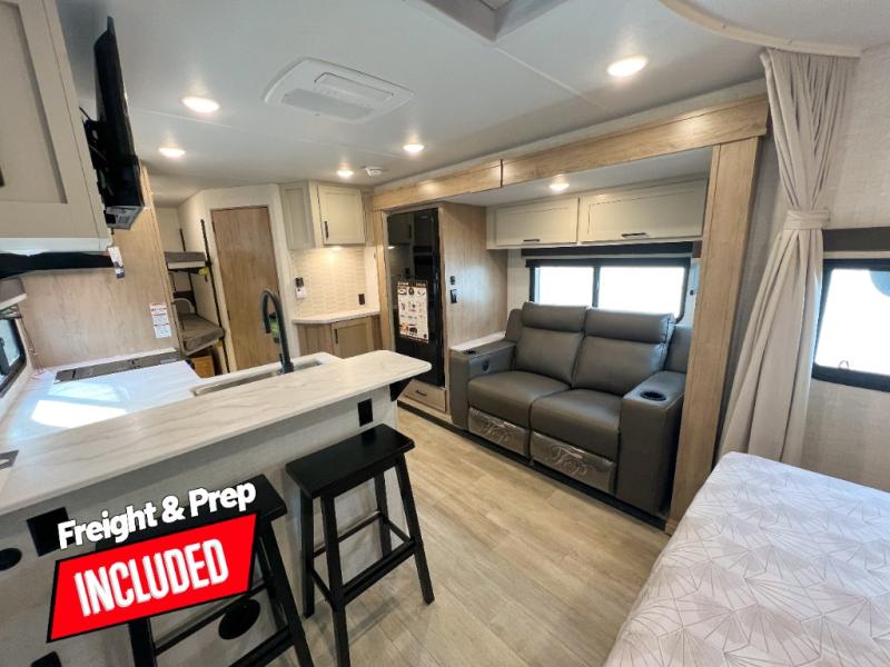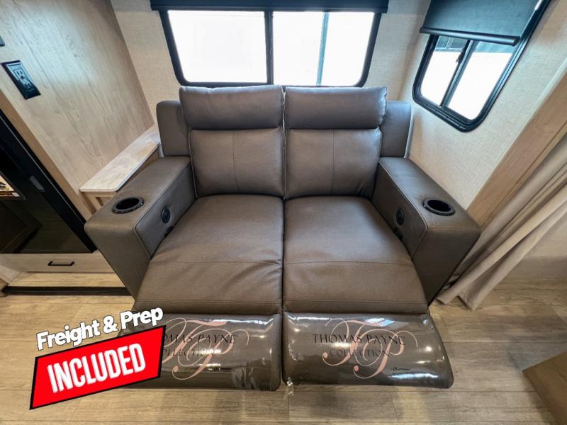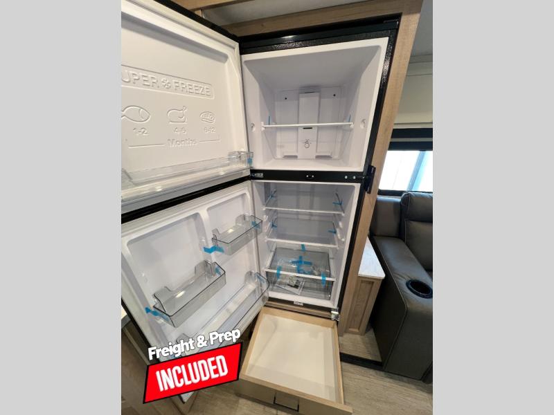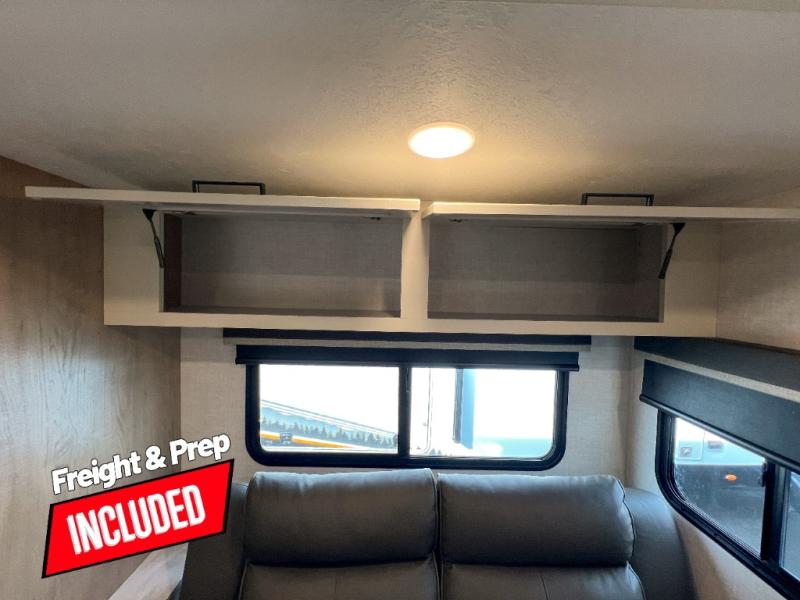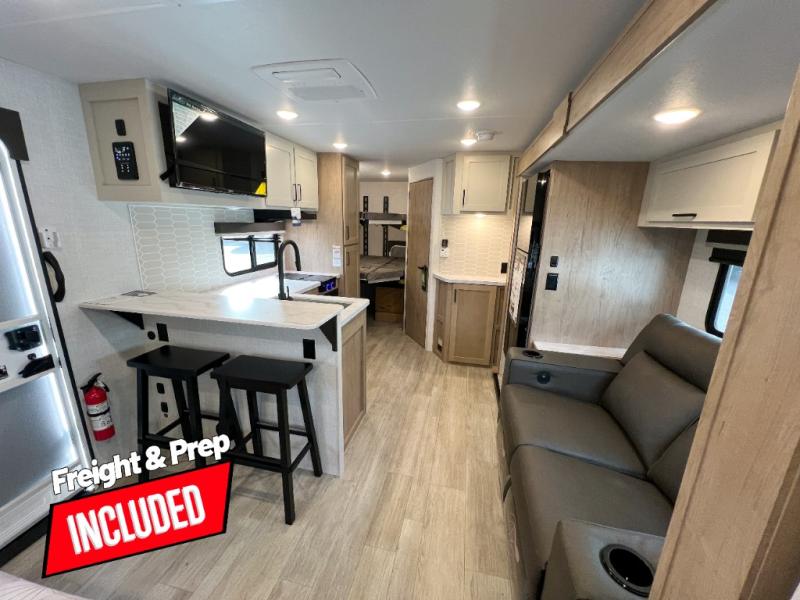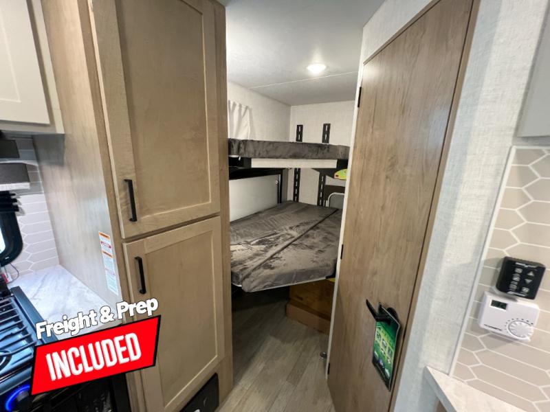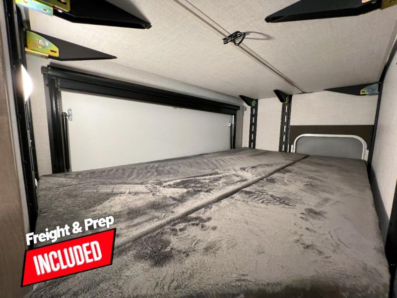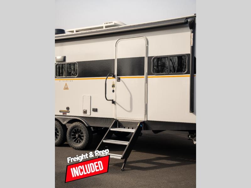 You'll love every minute spent in this spacious travel trailer that can sleep up to six. The repositionable EmberTrack E-Track bunk/storage system includes 74" x 46" cargo space, and there are multiple single/double bunk configurations to fit your needs. The front walk-around residential queen bed includes dual nightstands and dual wardrobes, plus a privacy curtain if you have guests staying over, and an optional Murphy bed is available if you choose that bed configuration. This E-Series kitchen includes an air fryer convection microwave, a two-burner cooktop, plus a breakfast bar with bar stools so you can visit with the chef as they cook meals. A legless dinette or optional theater seating will provide a place to dine, or you can take your plate outdoors to sit under the 14' power awning with a dimmable LED light. You'll also find a pass-through storage outside, along with a docking station and a kayak/bike storage door!