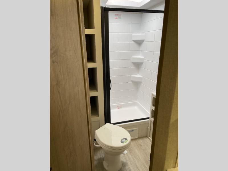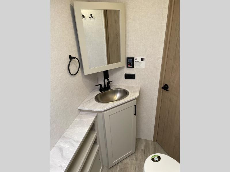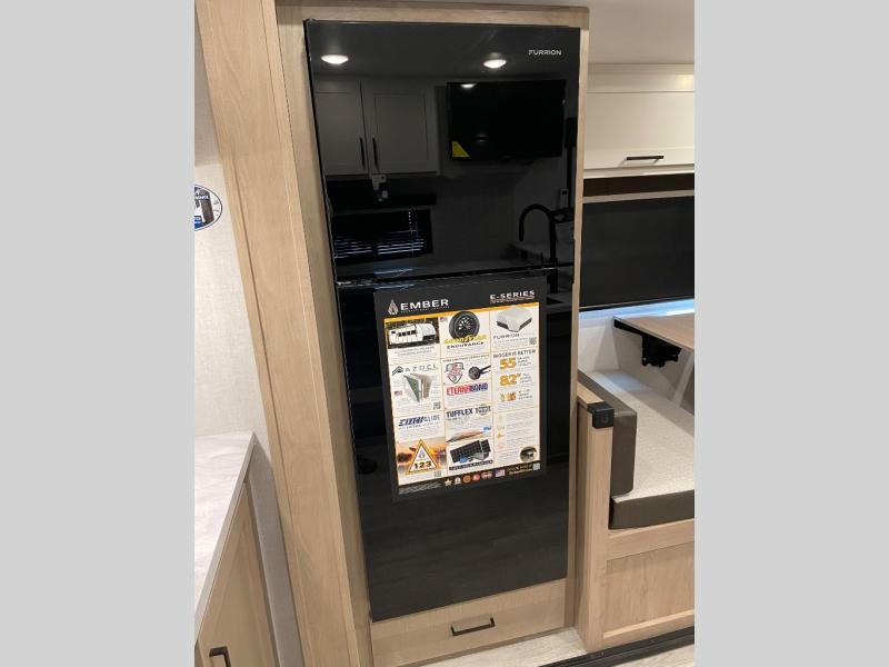 With any E-Series travel trailer by Ember RV you will enjoy a lightweight RV with all the "Essentials" needed for memorable trips in the great outdoors! Each model is constructed with durable laminated Azdel Onboard composite walls, a full walkable roof with a one-piece Tufflex PVC roofing material, and a gel-coated fiberglass exterior. The Dexter axles with E-Z lube hubs and forward self-adjusting electric brakes plus Goodyear Endurance tires will provide a smooth tow from home to campground. You will appreciate the Congoleum DiamondFlor "carpetless" interior that is easy to clean, and the hardwood framed cabinet doors will create a more residential feel. Each model includes a tankless on-demand water heater for endless hot showers and an 18,000 BTU Max Cool "Whisper Quiet" A/C, which is the largest single A/C in its class! If you're looking for off-grid capabilities, you might want to choose the optional Off-Grid Solar Package with 400 total watts of solar panels, a 2,000W Pure Sine wave inverter, and a Victron MPPT solar controller!