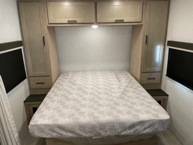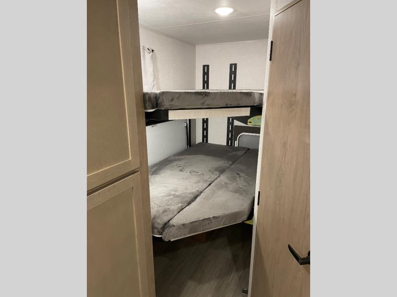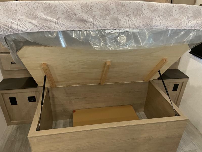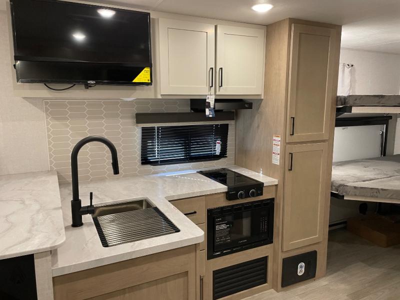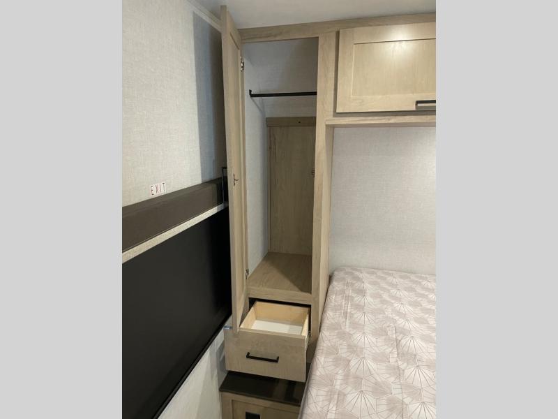 You'll love every minute spent in this spacious travel trailer that can sleep up to six. The repositionable EmberTrack E-Track bunk/storage system includes 74" x 46" cargo space, and there are multiple single/double bunk configurations to fit your needs. The front walk-around residential queen bed includes dual nightstands and dual wardrobes, plus a privacy curtain if you have guests staying over, and an optional Murphy bed is available if you choose that bed configuration. This E-Series kitchen includes an air fryer convection microwave, a two-burner cooktop, plus a breakfast bar with bar stools so you can visit with the chef as they cook meals. A legless dinette or optional theater seating will provide a place to dine, or you can take your plate outdoors to sit under the 14' power awning with a dimmable LED light. You'll also find a pass-through storage outside, along with a docking station and a kayak/bike storage door!