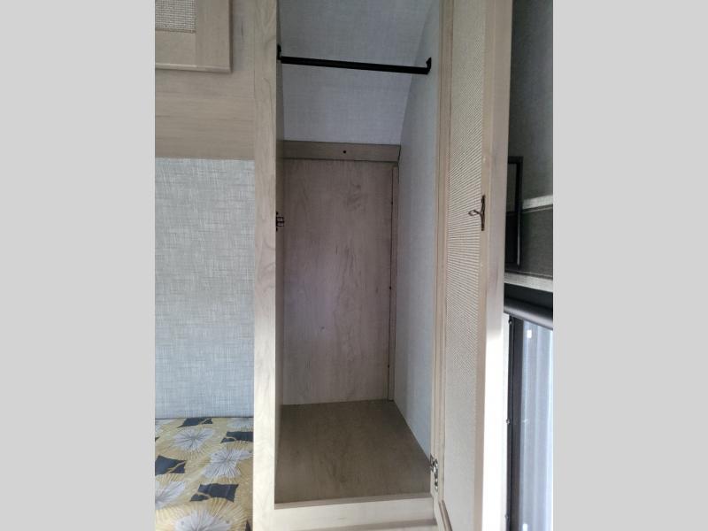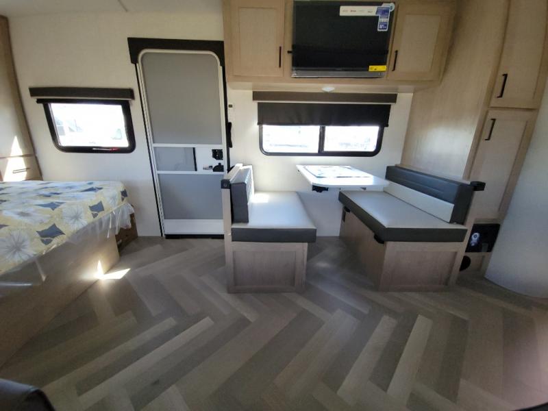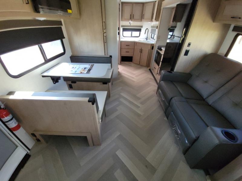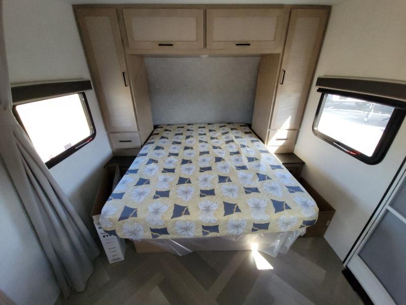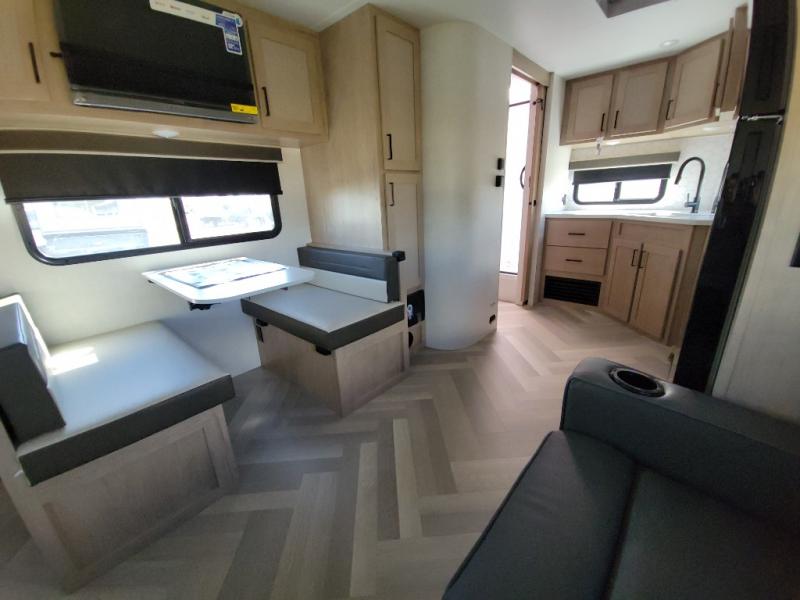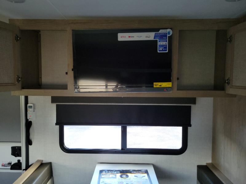 Camping trips just got a whole lot better in this tandem axle, single slide travel trailer! Once you arrive at the campground, you can put out the 18' power awning, grab your camp chairs from the pass-through storage, and relax! When you're getting hungry, head to the rear corner kitchen that includes ample counter space, a two burner cooktop, plus a 10 cu. ft. 12V refrigerator. There is also a pantry to store snacks and paper goods! You can get cozy after dinner on the theater seating that sits directly across from the HDTV for easy viewing, and there is a legless dinette if game night is in order. When you're ready for bed, the queen bed up front will provide a great night's rest, and there is a privacy curtain if you have a guest staying over on the dinette. And don't worry about storage space; this model has you covered with dual bedroom wardrobes, overhead cabinets, and convenient shoe storage!