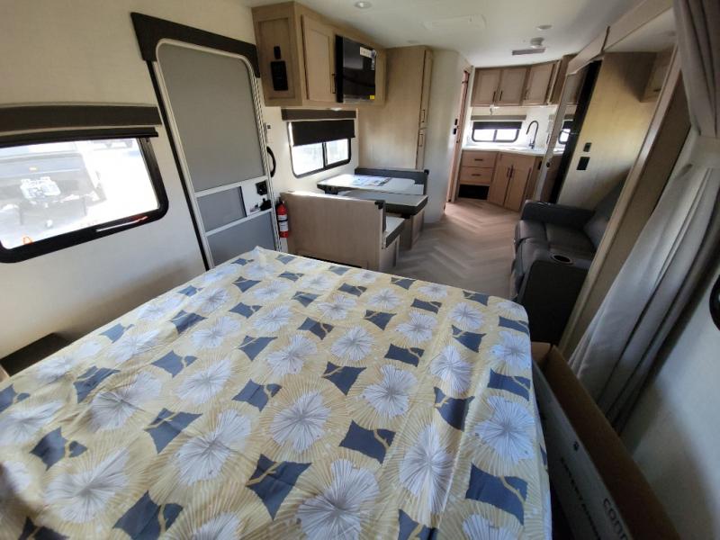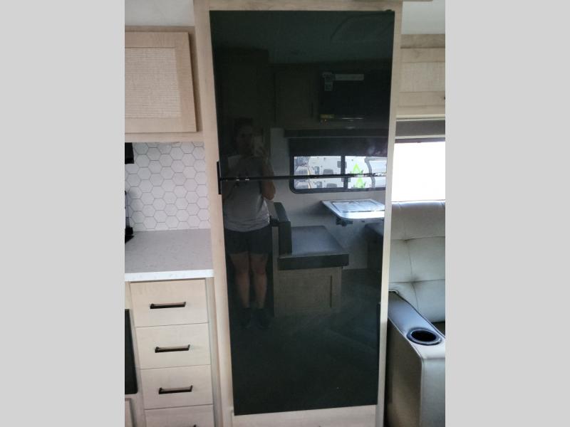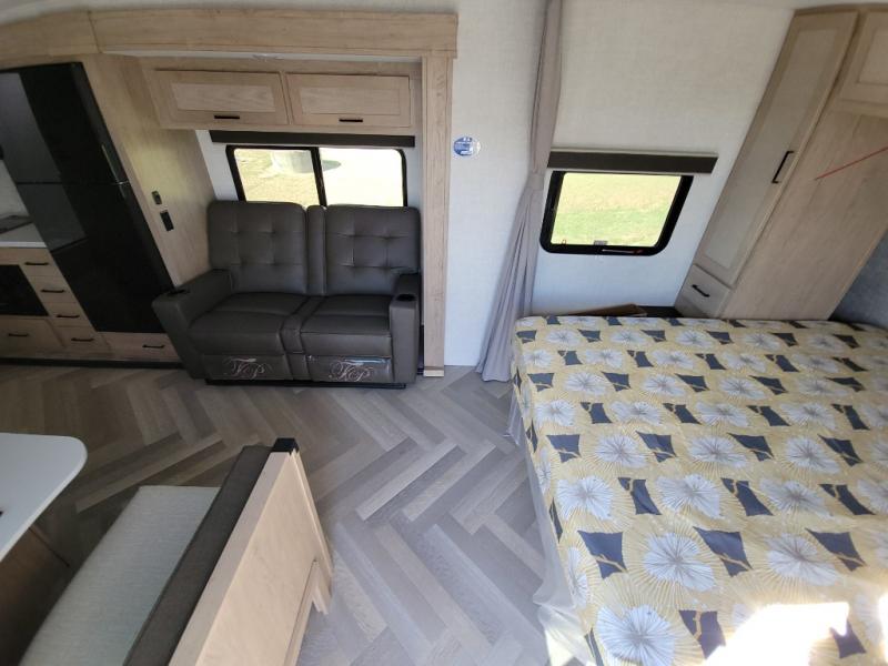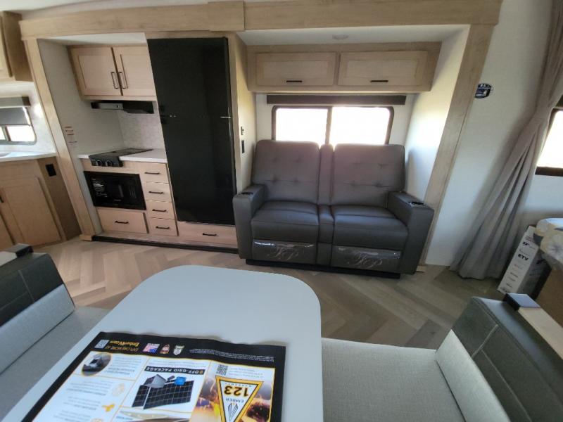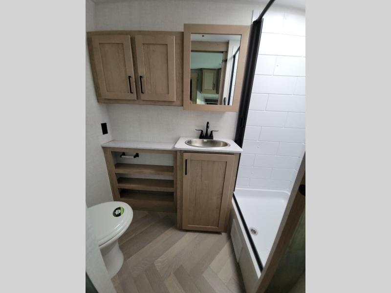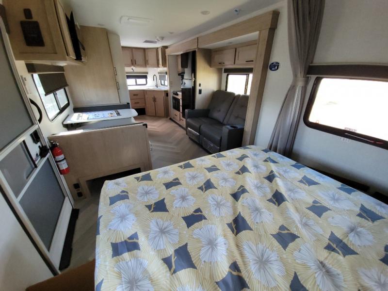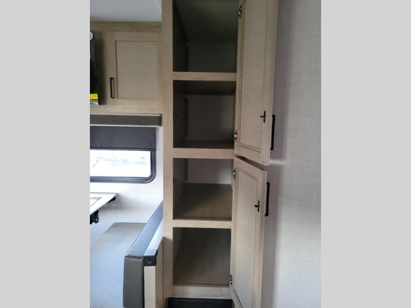Camping trips just got a whole lot better in this tandem axle, single slide travel trailer! Once you arrive at the campground, you can put out the 18' power awning, grab your camp chairs from the pass-through storage, and relax! When you're getting hungry, head to the rear corner kitchen that includes ample counter space, a two burner cooktop, plus a 10 cu. ft. 12V refrigerator. There is also a pantry to store snacks and paper goods! You can get cozy after dinner on the theater seating that sits directly across from the HDTV for easy viewing, and there is a legless dinette if game night is in order. When you're ready for bed, the queen bed up front will provide a great night's rest, and there is a privacy curtain if you have a guest staying over on the dinette. And don't worry about storage space; this model has you covered with dual bedroom wardrobes, overhead cabinets, and convenient shoe storage!