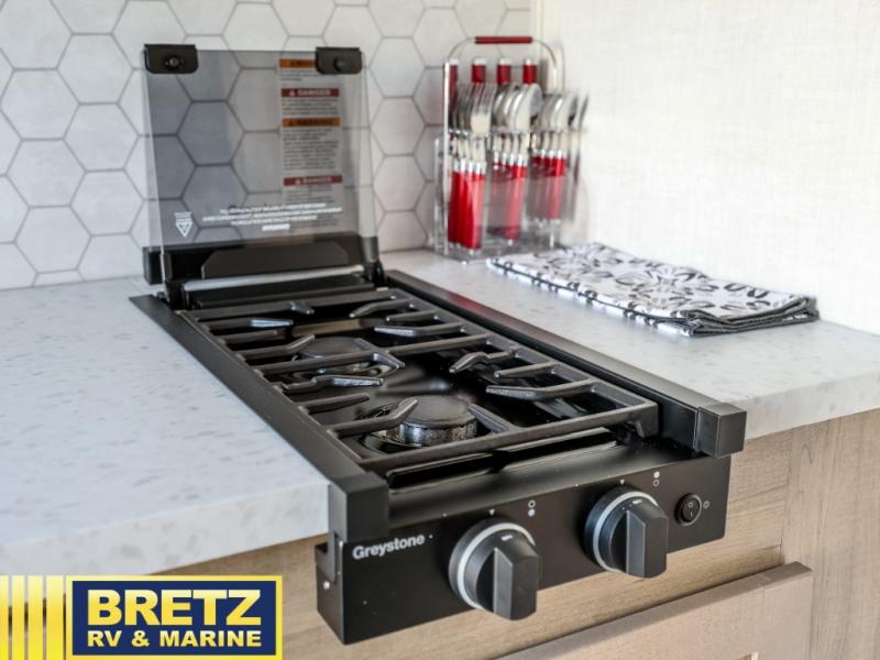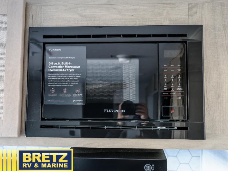 Are you looking for a travel trailer with plenty of interior space and lots of conveniences? Look no further than this E-Series unit! You can sleep three to four comfortably between the true residential queen bed in the front bedroom and the legless dinette, plus there is a walk-through bath that everyone can access easily. You'll also find the second entry door located in the master bedroom, along with dual nightstands and dual wardrobes to keep clothes wrinkle-free. After a day outdoors, you will love relaxing on the theater seating that is directly across from the HDTV to make it a movie night, and the legless dinette provides a place to dine, play games, and let a guest or two sleep over. And we haven't even mention the rear kitchen with tons of counter space, an air fryer convection microwave, a two burner cooktop, and a 10 cu. ft. 12V refrigerator!