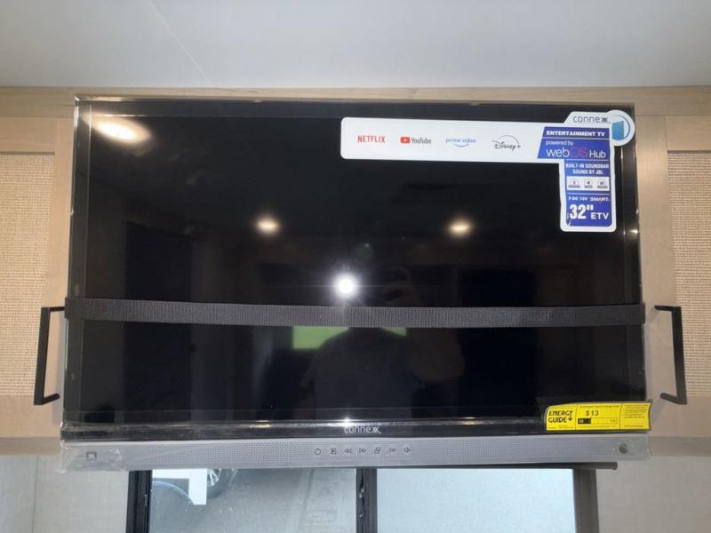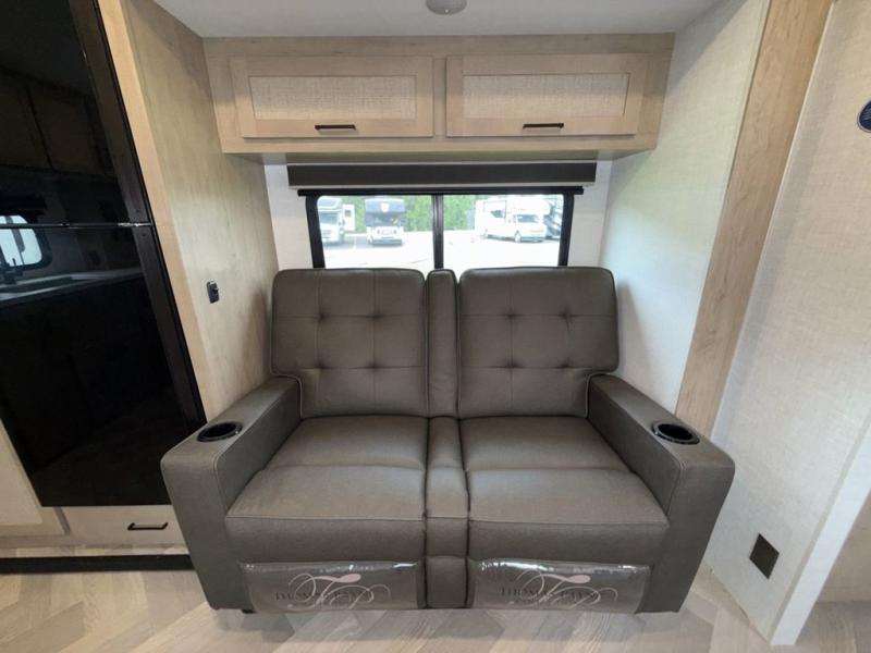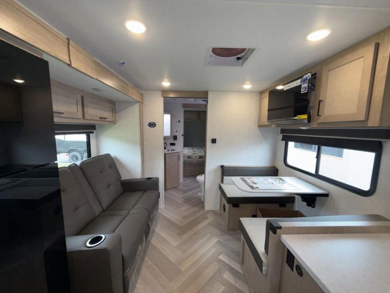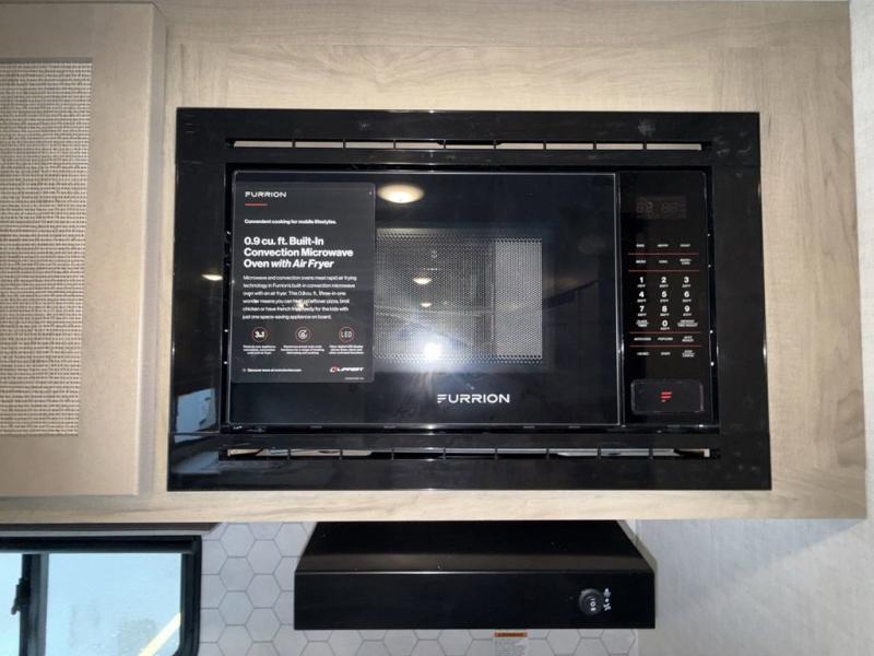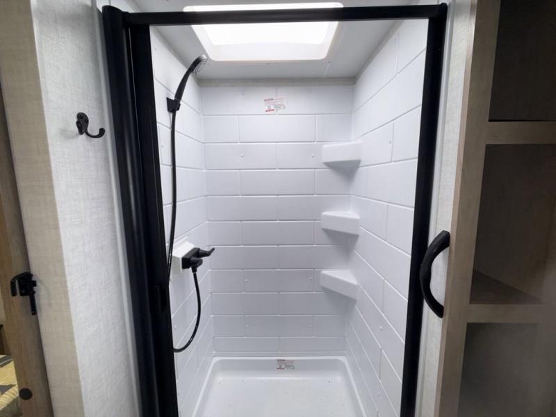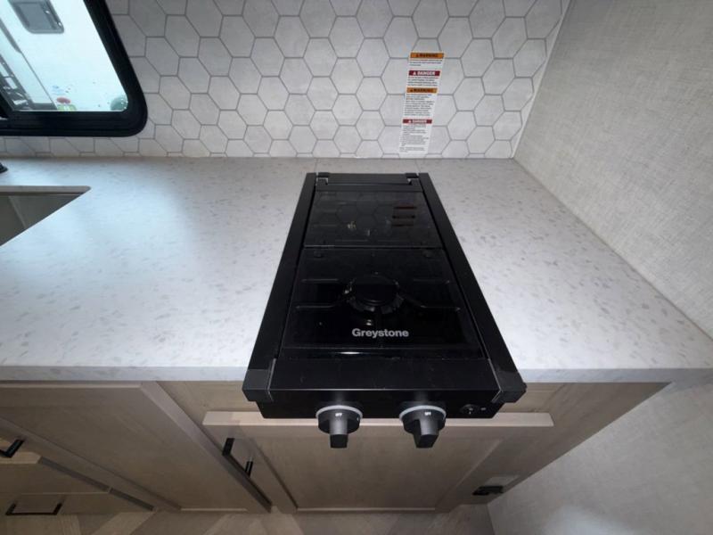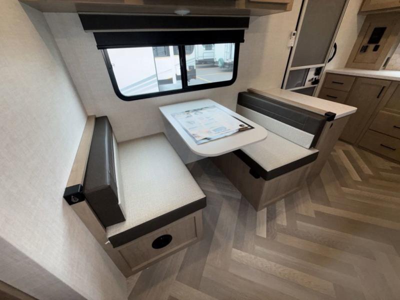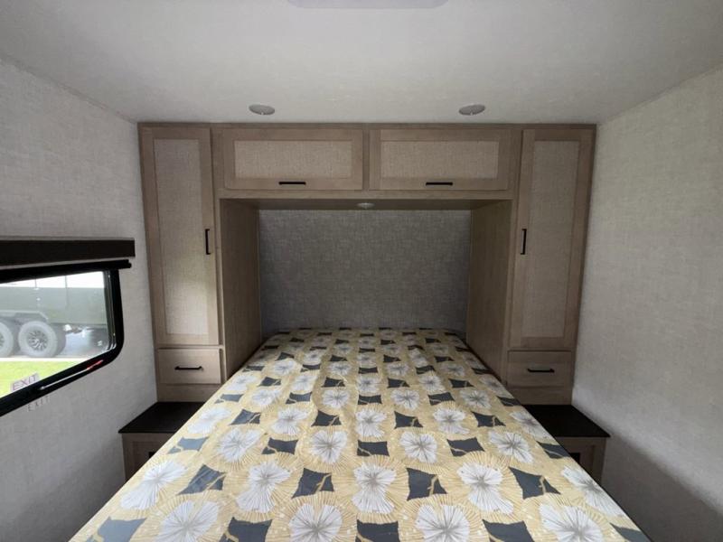 Are you looking for a travel trailer with plenty of interior space and lots of conveniences? Look no further than this E-Series unit! You can sleep three to four comfortably between the true residential queen bed in the front bedroom and the legless dinette, plus there is a walk-through bath that everyone can access easily. You'll also find the second entry door located in the master bedroom, along with dual nightstands and dual wardrobes to keep clothes wrinkle-free. After a day outdoors, you will love relaxing on the theater seating that is directly across from the HDTV to make it a movie night, and the legless dinette provides a place to dine, play games, and let a guest or two sleep over. And we haven't even mention the rear kitchen with tons of counter space, an air fryer convection microwave, a two burner cooktop, and a 10 cu. ft. 12V refrigerator!