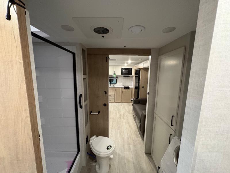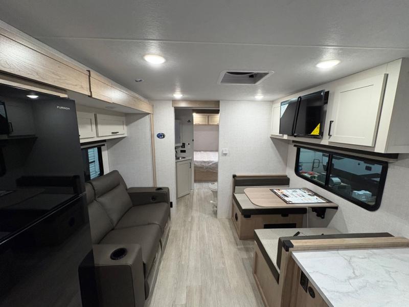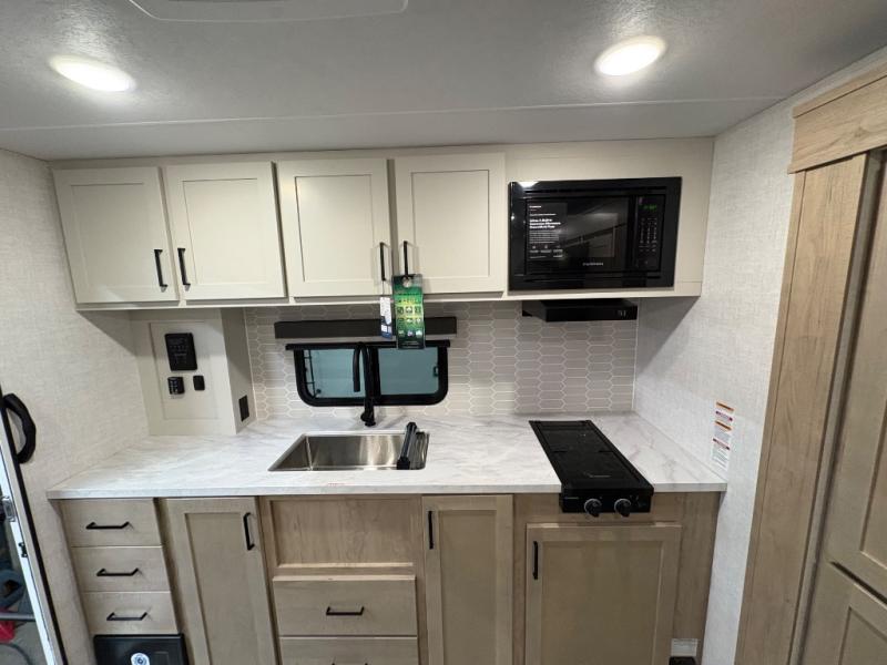 Are you looking for a travel trailer with plenty of interior space and lots of conveniences? Look no further than this E-Series unit! You can sleep three to four comfortably between the true residential queen bed in the front bedroom and the legless dinette, plus there is a walk-through bath that everyone can access easily. You'll also find the second entry door located in the master bedroom, along with dual nightstands and dual wardrobes to keep clothes wrinkle-free. After a day outdoors, you will love relaxing on the theater seating that is directly across from the HDTV to make it a movie night, and the legless dinette provides a place to dine, play games, and let a guest or two sleep over. And we haven't even mention the rear kitchen with tons of counter space, an air fryer convection microwave, a two burner cooktop, and a 10 cu. ft. 12V refrigerator!