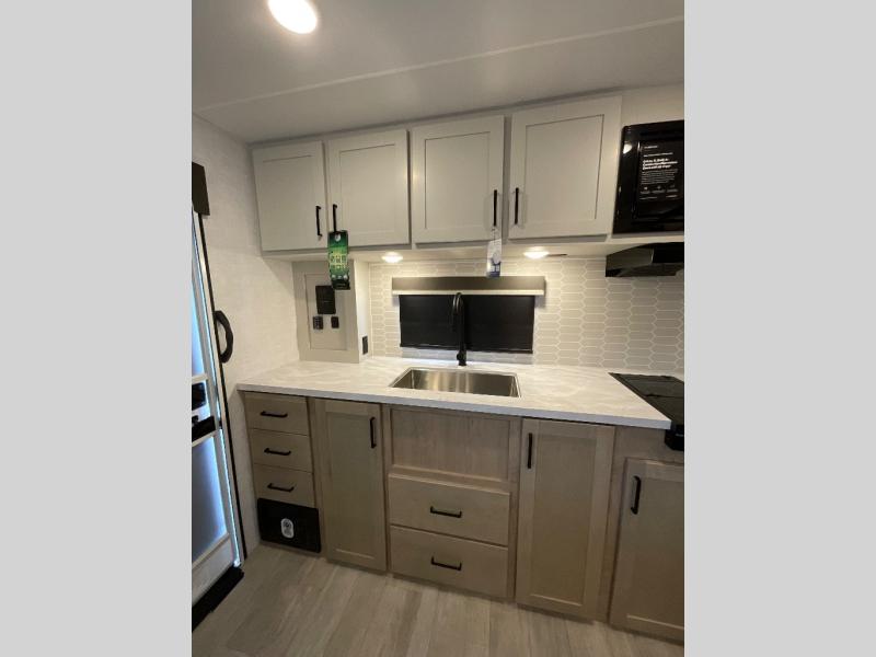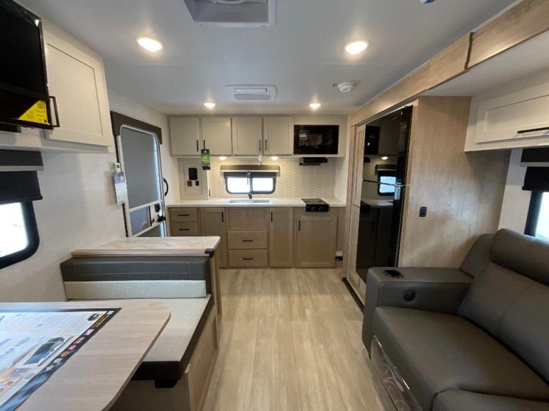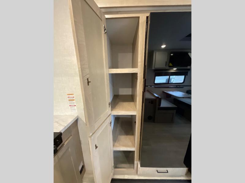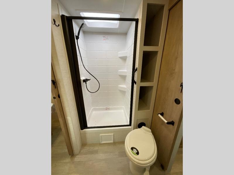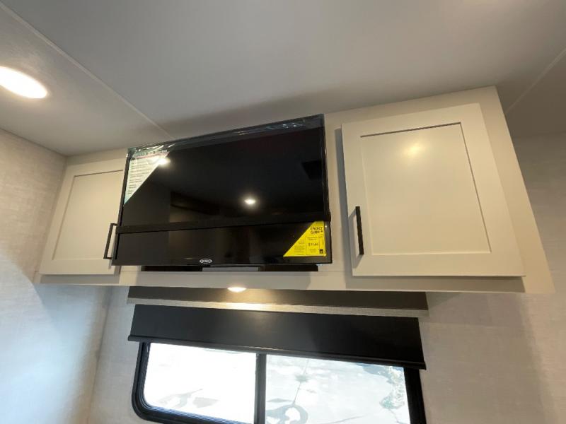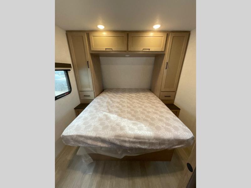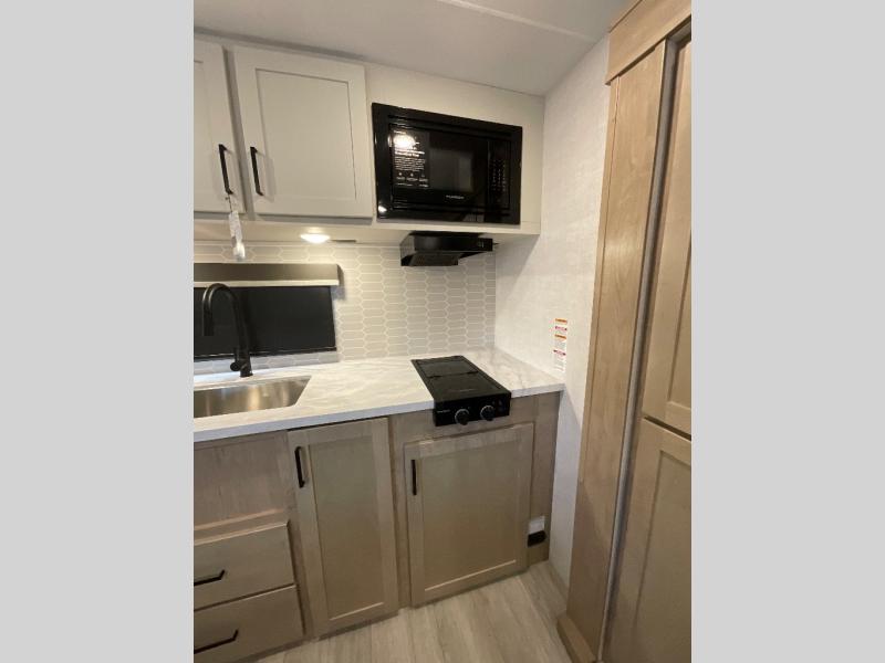 Are you looking for a travel trailer with plenty of interior space and lots of conveniences? Look no further than this E-Series unit! You can sleep three to four comfortably between the true residential queen bed in the front bedroom and the legless dinette, plus there is a walk-through bath that everyone can access easily. You'll also find the second entry door located in the master bedroom, along with dual nightstands and dual wardrobes to keep clothes wrinkle-free. After a day outdoors, you will love relaxing on the theater seating that is directly across from the HDTV to make it a movie night, and the legless dinette provides a place to dine, play games, and let a guest or two sleep over. And we haven't even mention the rear kitchen with tons of counter space, an air fryer convection microwave, a two burner cooktop, and a 10 cu. ft. 12V refrigerator!