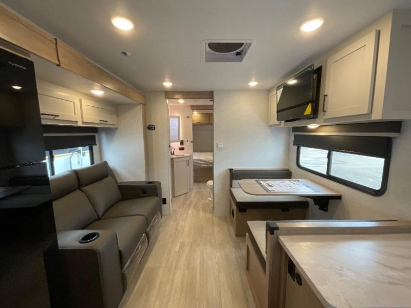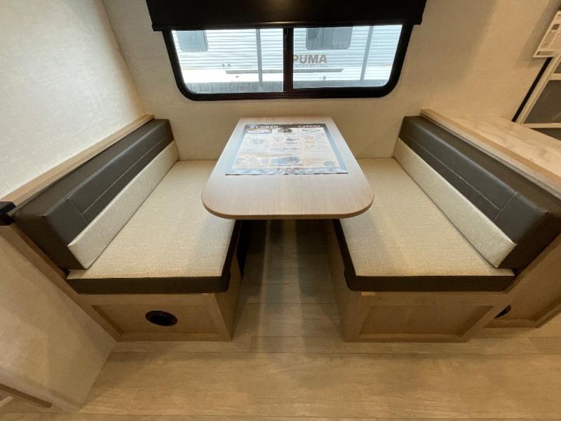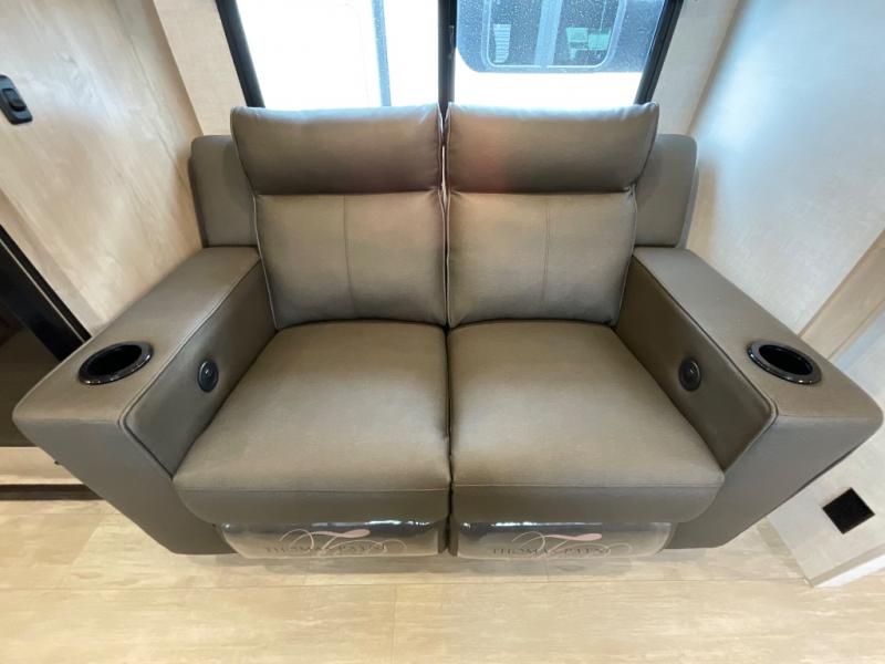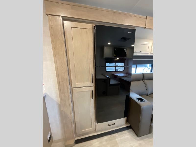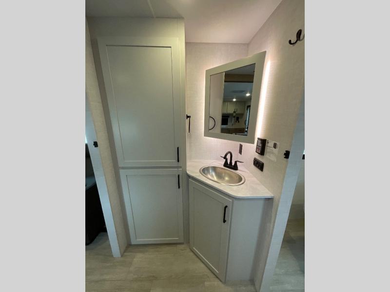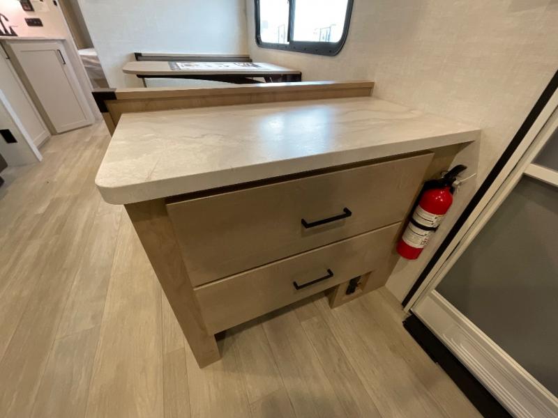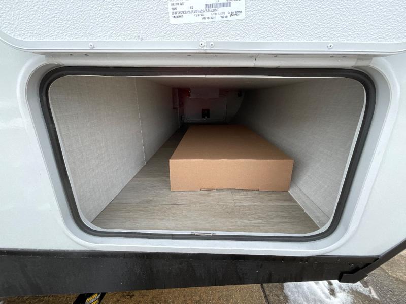 Are you looking for a travel trailer with plenty of interior space and lots of conveniences? Look no further than this E-Series unit! You can sleep three to four comfortably between the true residential queen bed in the front bedroom and the legless dinette, plus there is a walk-through bath that everyone can access easily. You'll also find the second entry door located in the master bedroom, along with dual nightstands and dual wardrobes to keep clothes wrinkle-free. After a day outdoors, you will love relaxing on the theater seating that is directly across from the HDTV to make it a movie night, and the legless dinette provides a place to dine, play games, and let a guest or two sleep over. And we haven't even mention the rear kitchen with tons of counter space, an air fryer convection microwave, a two burner cooktop, and a 10 cu. ft. 12V refrigerator!
