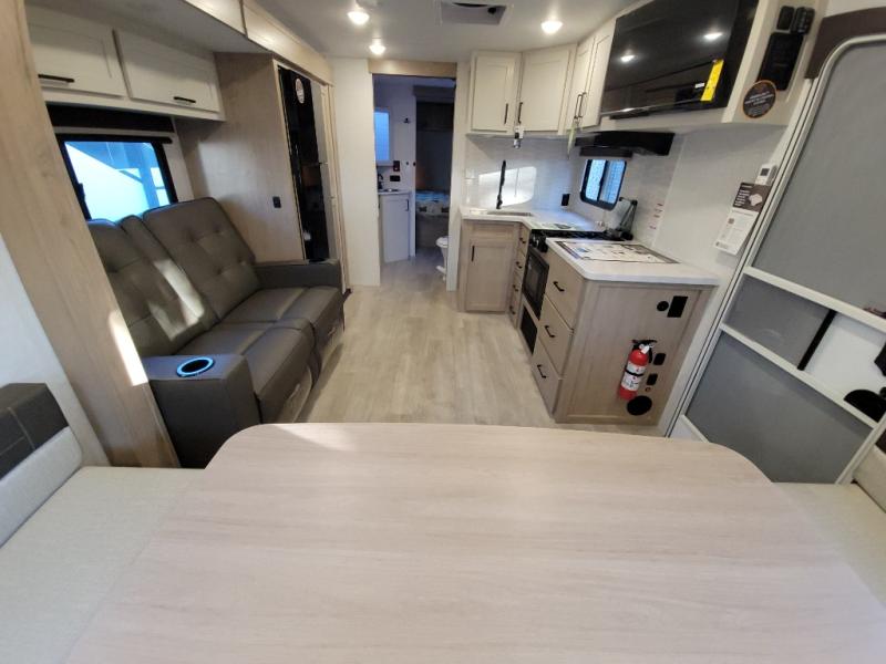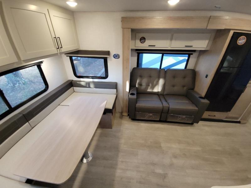 This dual entry travel trailer is sure to bring great camping memories! Once you've unloaded the pass-through storage, you can put out the power awning with dimmable LED lights. The theater seating slide out in the combined kitchen and living room provides a place for you to relax, and the rear U-shaped dinette will be the perfect place to dine together. This space can also double as sleeping space for any guests you may have! The chef of your group can make lunch on the dual burner cooktop or in the air fryer convection microwave. You will love how spacious the walk-through bath is, and the front master bedroom includes a queen bed for a great night's rest. There are also dual nightstands and dual wardrobes, a TV backer if you want to add your own television, and your own exterior entry door so you can sneak out in the morning to fish!