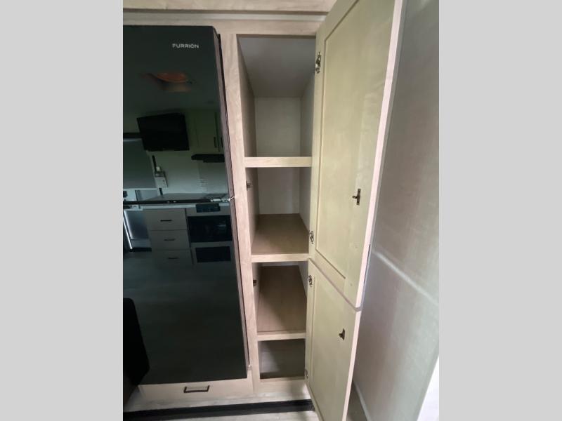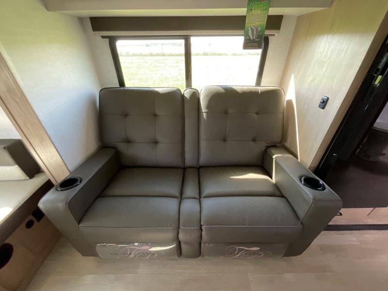 This dual entry travel trailer is sure to bring great camping memories! Once you've unloaded the pass-through storage, you can put out the power awning with dimmable LED lights. The theater seating slide out in the combined kitchen and living room provides a place for you to relax, and the rear U-shaped dinette will be the perfect place to dine together. This space can also double as sleeping space for any guests you may have! The chef of your group can make lunch on the dual burner cooktop or in the air fryer convection microwave. You will love how spacious the walk-through bath is, and the front master bedroom includes a queen bed for a great night's rest. There are also dual nightstands and dual wardrobes, a TV backer if you want to add your own television, and your own exterior entry door so you can sneak out in the morning to fish!